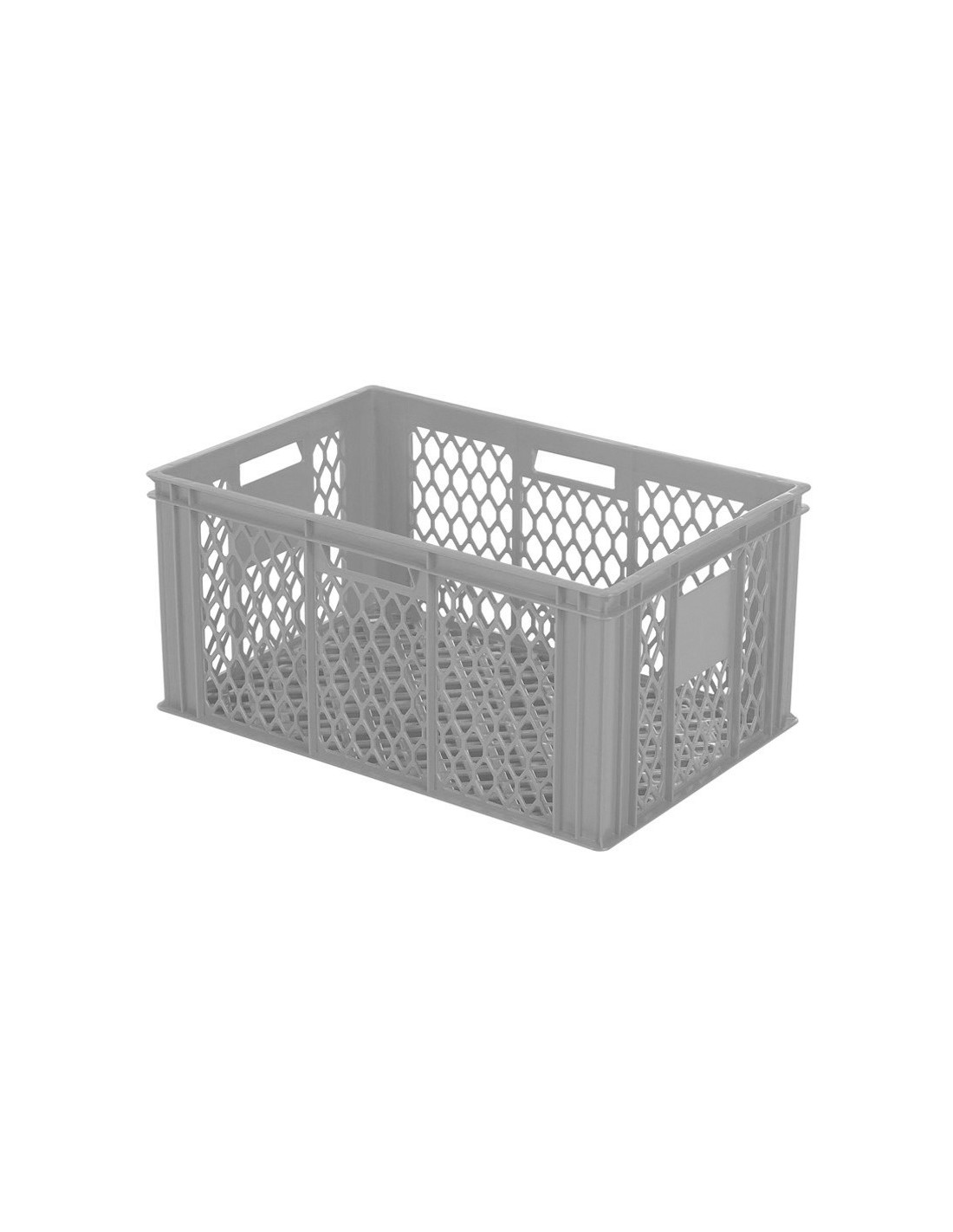 Stapelbar behållare/bagerilåda av livsmedelskvalitet med förstärkt botten, perforerade sidoväggar och 4 öppna handtag