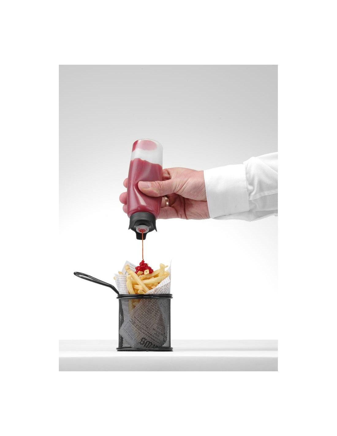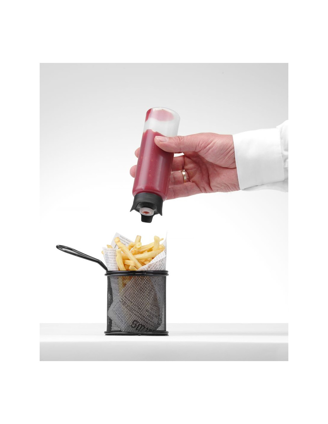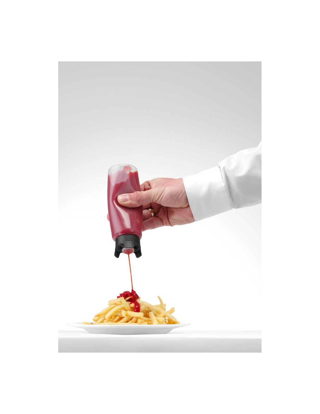 Designad av Robert Bronwasser. Klar flaska med specialdesignat doseringslock. Tack vare utrustningens konstruktion kan flaskan placeras upp och ner utan risk för spill av sås.