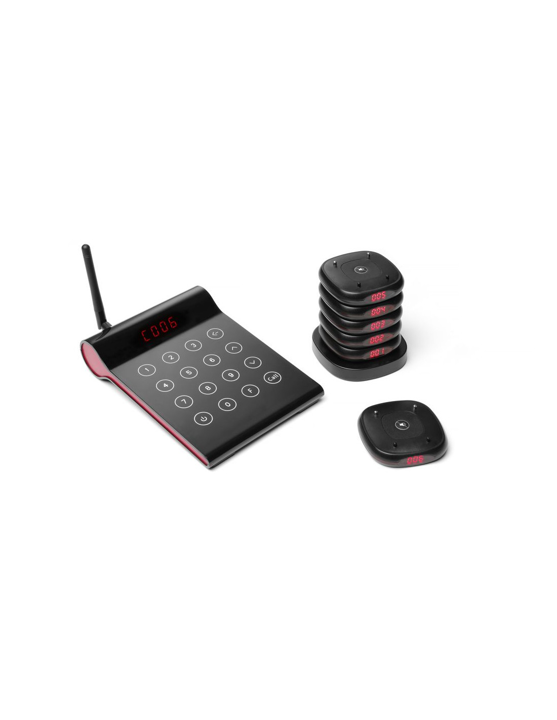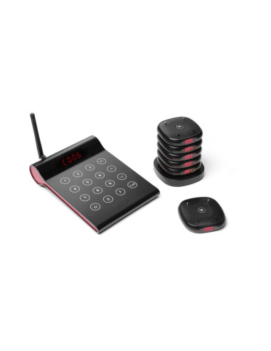 Digitala displayer på personsökare för markering av order-/bordnummer (programmerbara nummer från 001 till 998). Kontroller med pekskärm. Inbyggd antenn i kontrollenheten säkerställer att inga signalstörningar från andra enheter uppstår. 3 aviseringslägen: vibration, ljud, LED-ljus. Kombinera aviseringslägen – allt avstängt med ett klick. Platsbesparande laddning: personsökarna staplas på laddaren. Räckvidd: 500 m. Personsökarens mått: 65x65x15 mm. Max antal personsökare som kan programmeras till 1 kontrollenhet: 998. Ingår i setet: kontrollenhet, 10 personsökare, laddningsstation, laddare och USB-C till USB-C-kabel. Personsökare säljs även separat – 10 st. (kod: 201640).