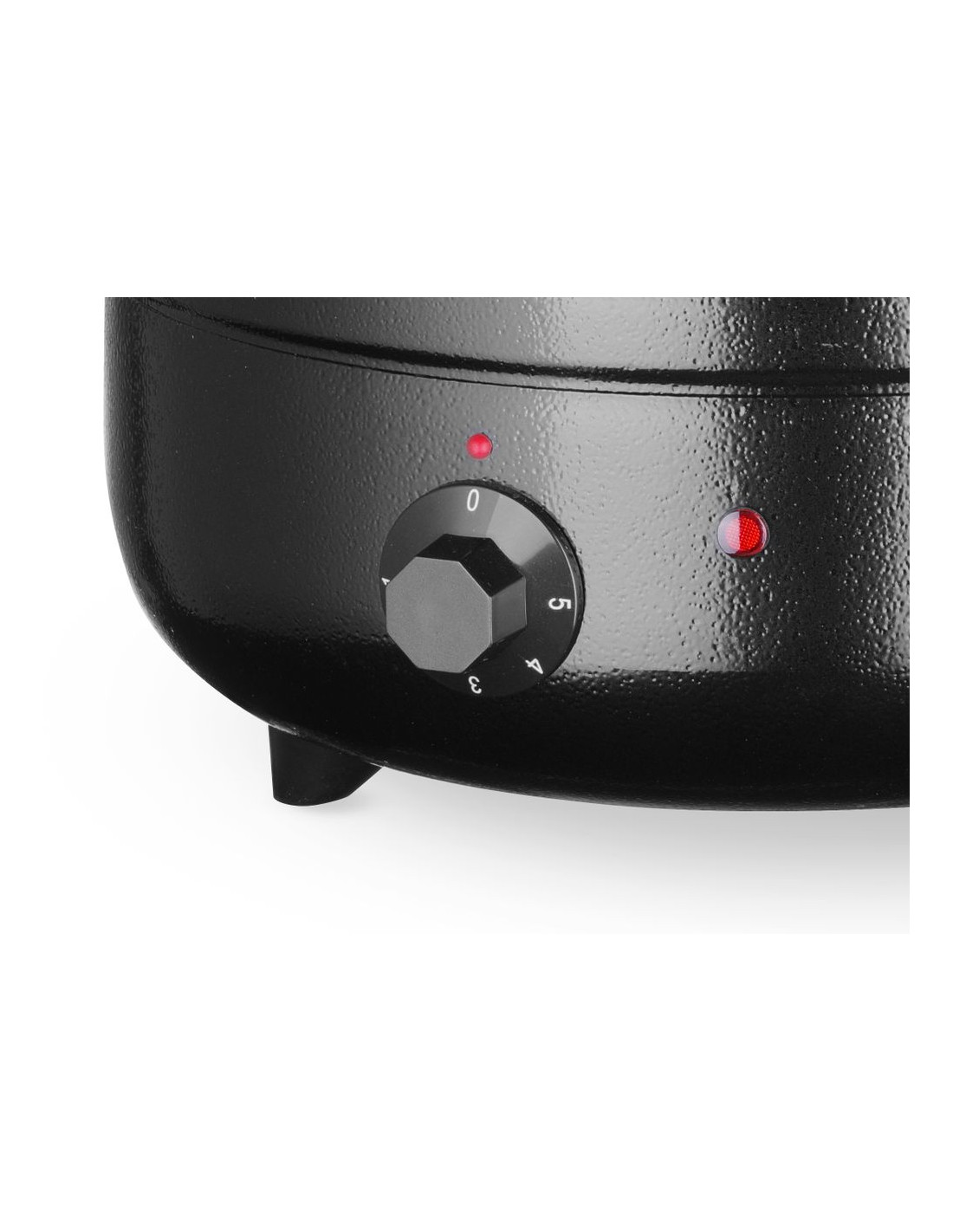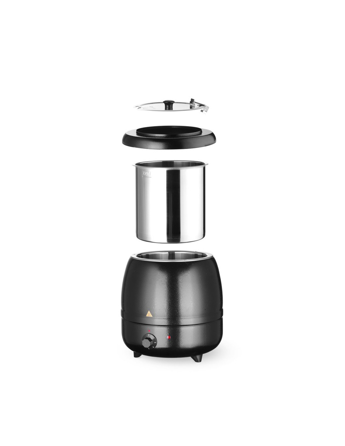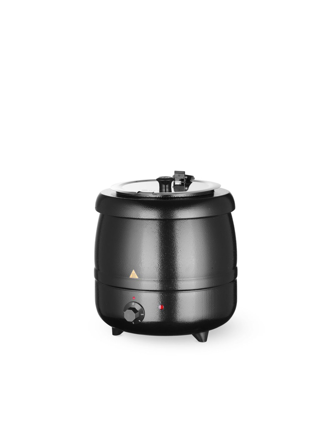 Soppbehållare och lock av rostfritt stål. Vattenbehållare av rostfritt stål. Hölje av metall med svart pulverlackering. Lock med svalt handtag och slevskåra. Temperaturområde: 30-85 °C. Överhettningsskydd vid 105 °C. Temperaturjustering med vred – 5 nivåer. Kapacitet: 8 l.