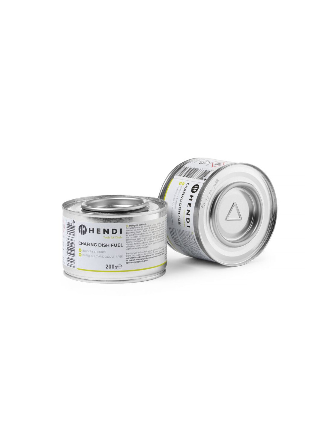 Bränsle för chafing dish är tillverkat av naturlig etanolalkohol, blandat med vatten och ett förtjockningsmedel för att göra det till en fast substans eller gel. HENDI chafing dish-bränsle är artificiellt framställt för att smaka så bittert att det är omöjligt att svälja. För att säkert och effektivt värma chafing dish rekommenderar vi starkt att placera chafing dish-bränsleburken i de angivna bränslehållarna. Värmekapaciteten är densamma över hela ugnen medan uppvärmningshastigheten beror på lågans storlek, bestämd av hur långt locket på chafing dish-bränsleburken hålls öppet. Allt HENDI chafing dish-bränsle brinner sotigt och luktfritt. Kartuscher och burkar som brinner utan chafing dish-bränsleburken blir mycket varma under användning, vilket skapar en betydande risk för brännskador om de inte placeras inuti chafing dish-bränsleburken. Risk för brännskador! Dessa chafing dish-bränsleburkar ingår i HENDI chafing dish och säljs separat. Läs alltid produktinstruktionerna före användning. Se till att det inte finns några öppna lågor eller heta föremål i närheten när du arbetar med chafing dish-bränsle. De brandfarliga ångorna läcker lätt ut ur behållaren. Se till att inget vatten (kondens) droppar ner i det brinnande bränslet. Det kan orsaka farlig stotning och stänk av bränsle. Tänd endast bränslet efter att du placerat bränslebehållaren med burken på sin slutgiltiga plats. Lågorna är nästan helt blå, vilket gör dem mycket svåra att se i ljuset. Försiktighet rekommenderas. Släck endast bränslet genom att stänga locket på bränslebehållaren. Påfyllning: Se alltid till att burken och dess hållare har svalnat helt. Ta ut burken ur bränslebehållaren för att fylla på burken. Förvaring: Förvara alltid i slutna behållare på en mörk och välventilerad plats, under 20 °C. För att förvara större mängder bränsle, vänligen kontakta lokala föreskrifter. Om ovanstående instruktioner följs är risken för olyckor minimal. Vid en liten brand: använd en brandfilt (eller en stor, våt filt) för att täcka elden och beröva den syre. Vid brand på kläder/kropp: använd en brandfilt eller en pulver-/CO2-brandsläckare. Försök aldrig att släcka elden med en liten handduk eftersom det bara sprider bränslet och lågorna! Håll kroppen sval i 15 minuter eller tills läkarhjälp anländer efter att du släckt elden. Lämna kläderna kvar. Sök alltid omedelbart läkarhjälp.