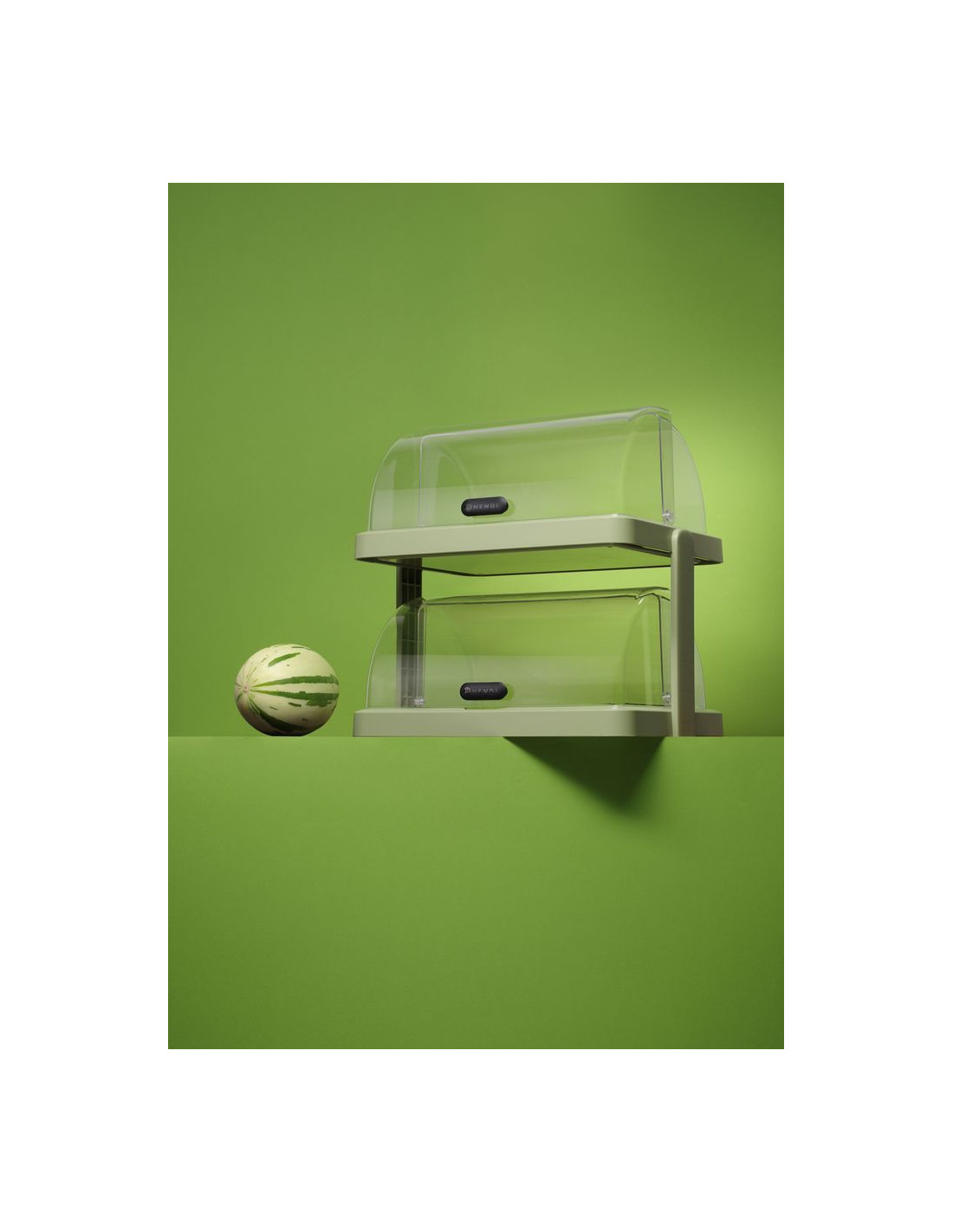 Dubbelenhet med 2 nivåer för buffématpresentation. Ingår i setet: 2 bottnar. 2 rulllock med handtag. 2 rostfria stålbrickor, vardera 400 x 300 mm. 4 kylelement. Stapelram i plast för 2 displayenheter.