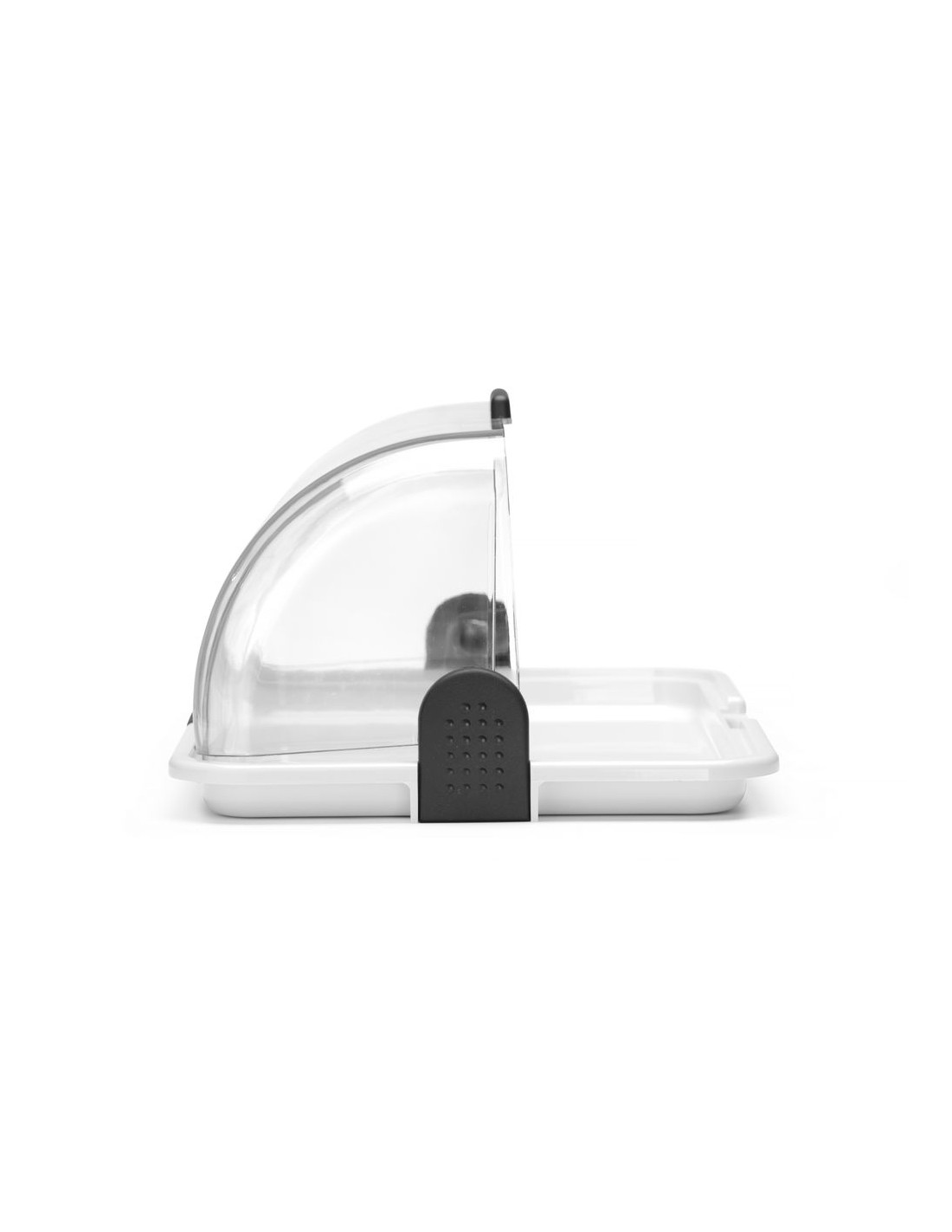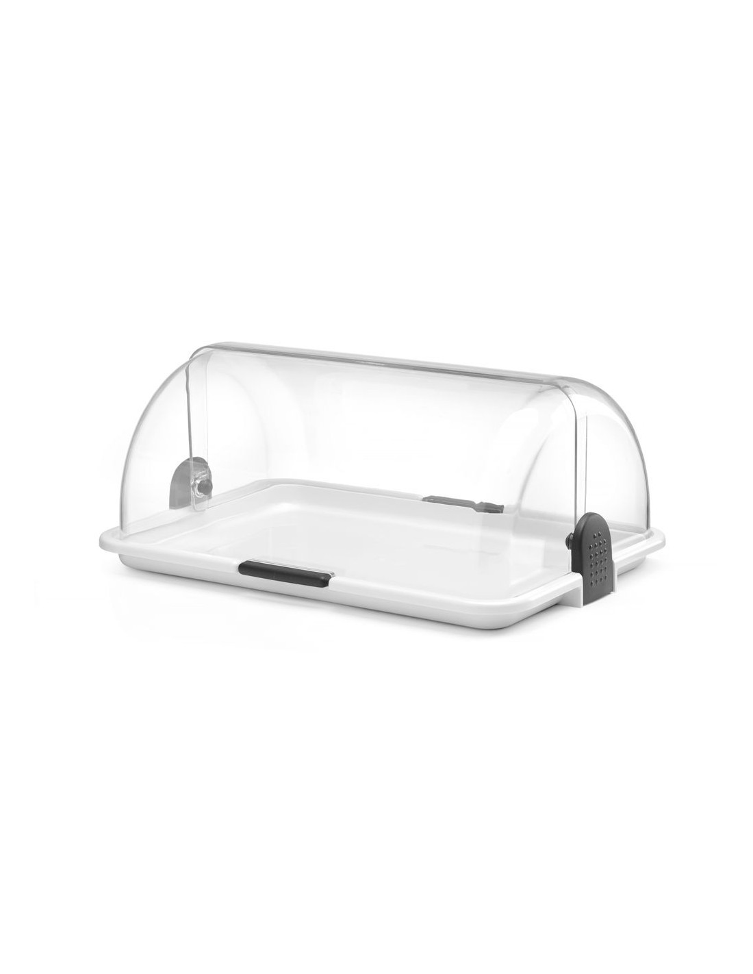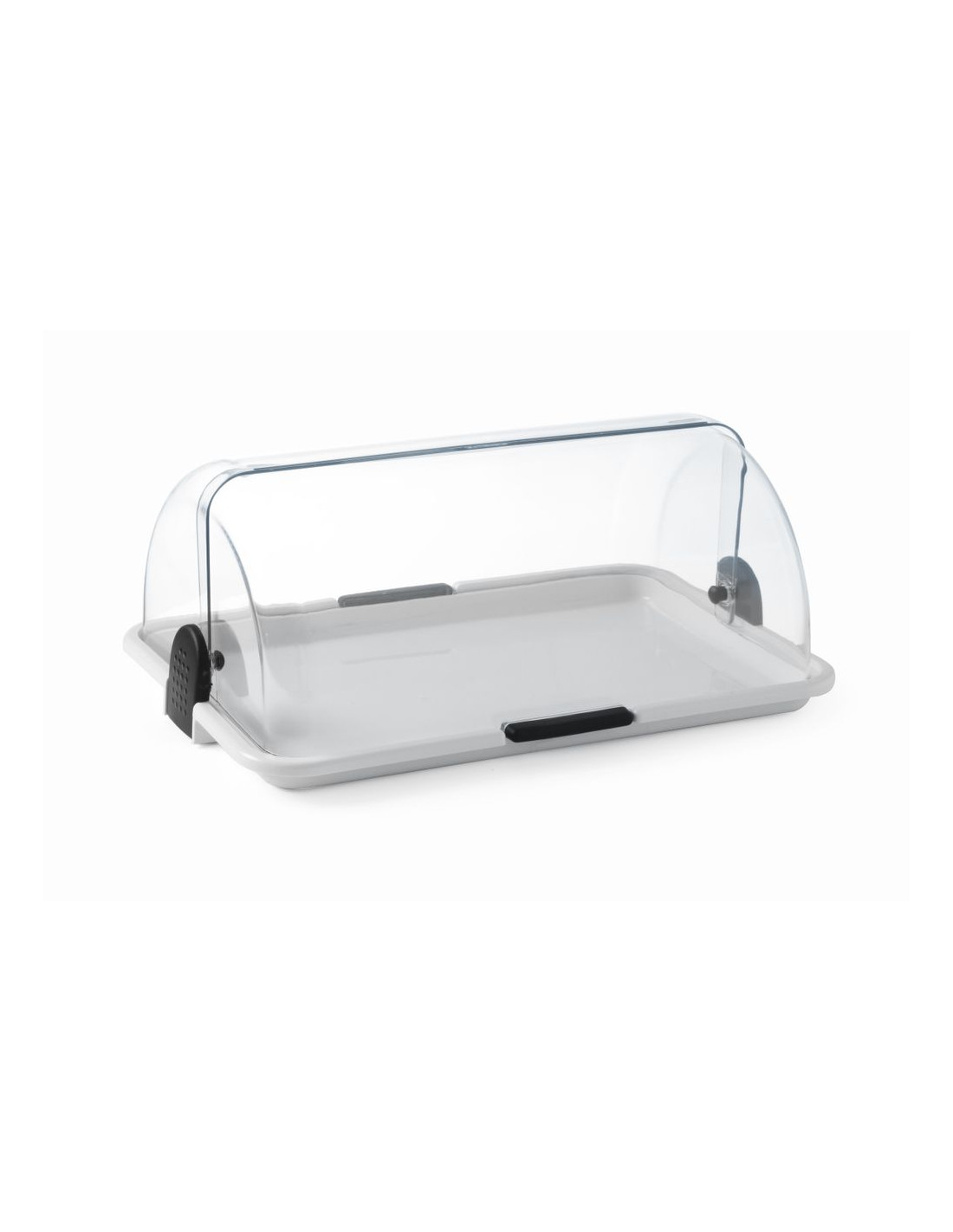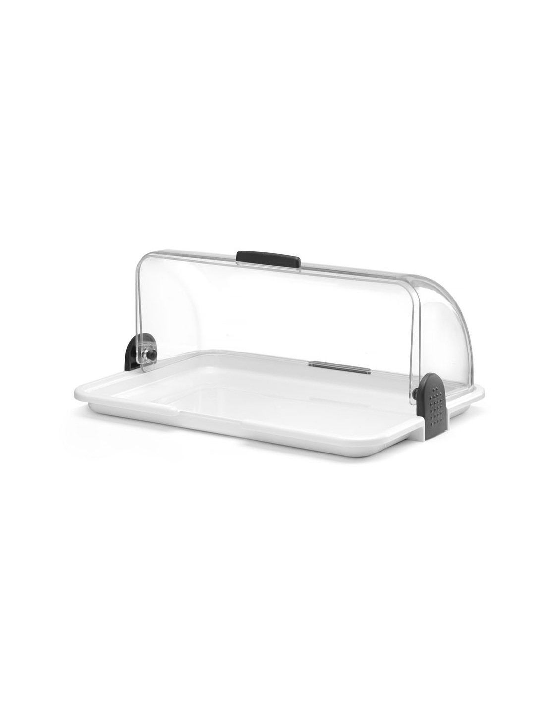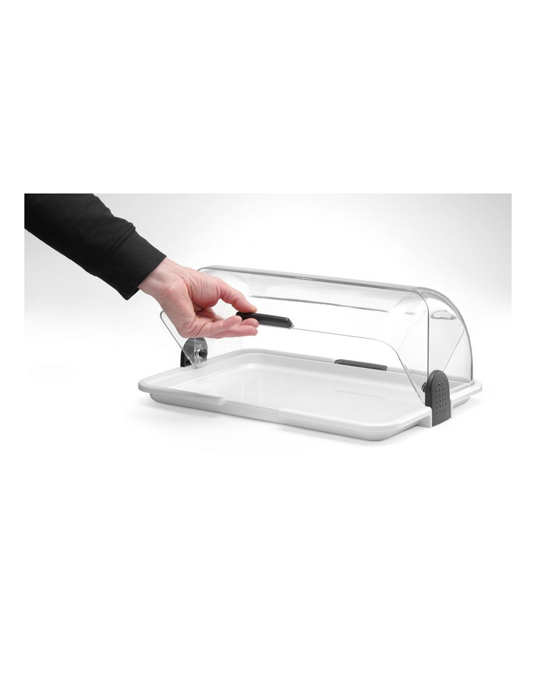 Transparent rulltäcke av polystyren. Bekväm åtkomst till serverad mat från båda sidor av displayen. Lätt att rengöra. Tål maskindisk.