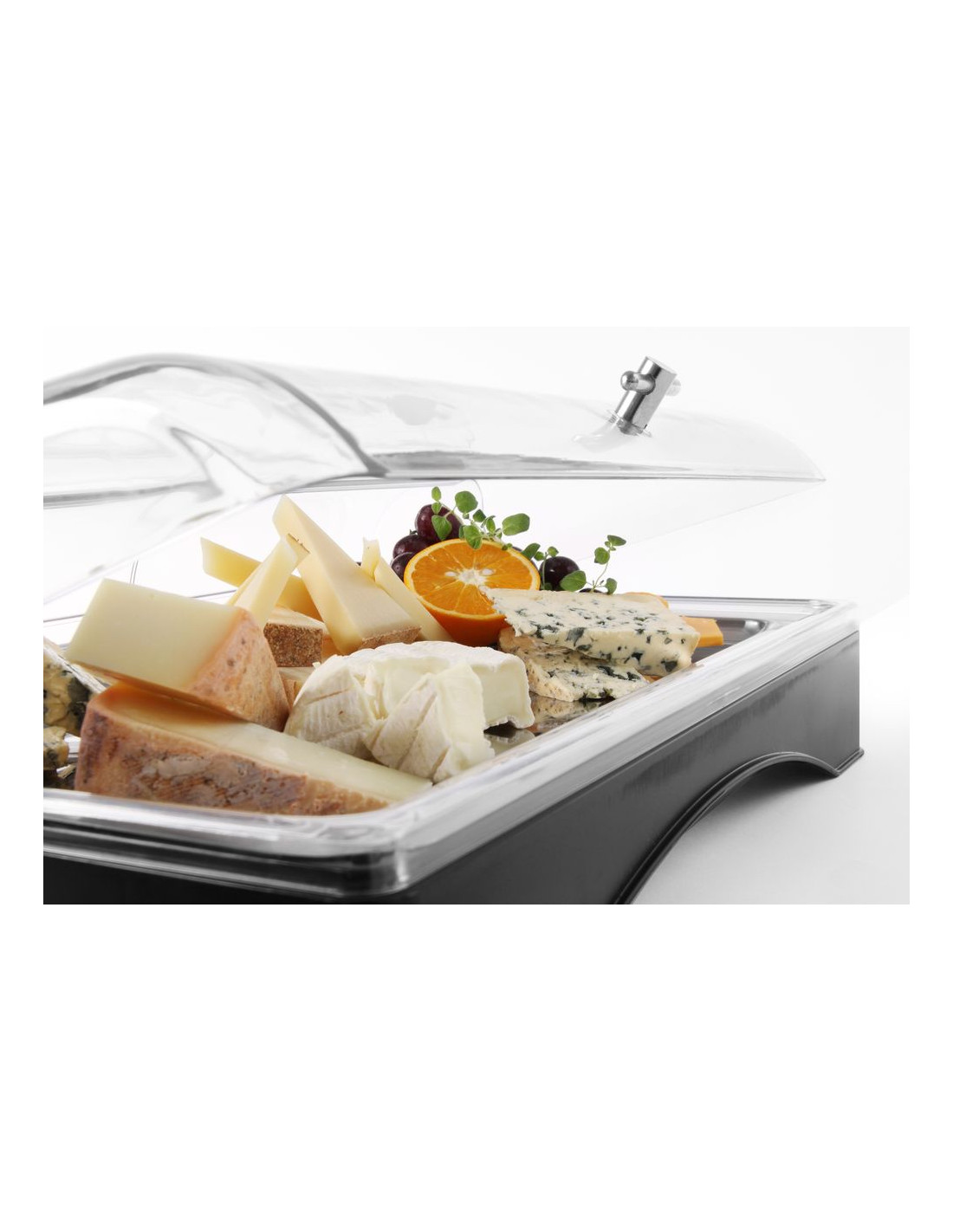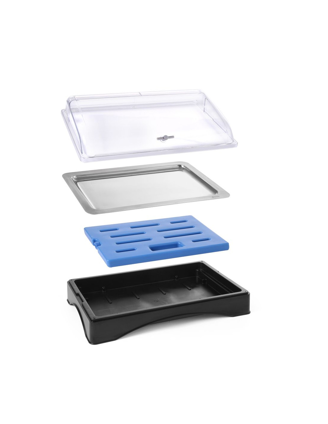 Kylning med medföljande kylpåse, för att sänka temperaturen till under 0 °C. Serveringsbricka i rostfritt stål, Gastronorm 1/1, ingår. Med transparent lock av polykarbonat. ABS-hölje.