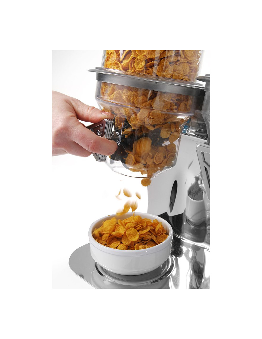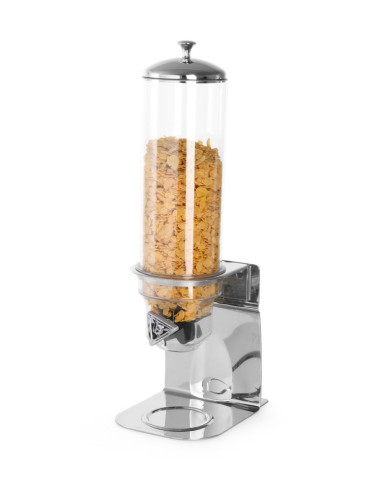 Utformad för dosering av bulkprodukter. Stativ i rostfritt stål. Dispenser i polykarbonat. Lufttätt lock för att bibehålla ingrediensernas färskhet under lång tid. Hygienisk, kontrollerad dosering förhindrar spill. Dispenseröppning placerad på en höjd av 140 mm. Monterbar – kan placeras på en bänkskiva eller monteras på väggen.