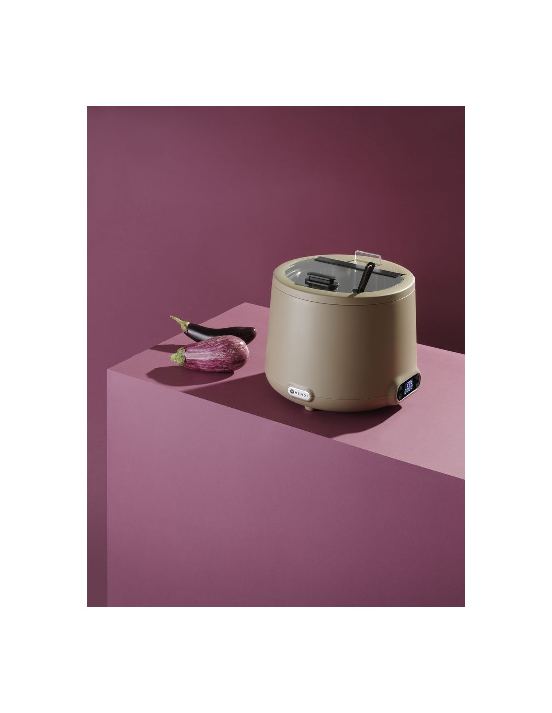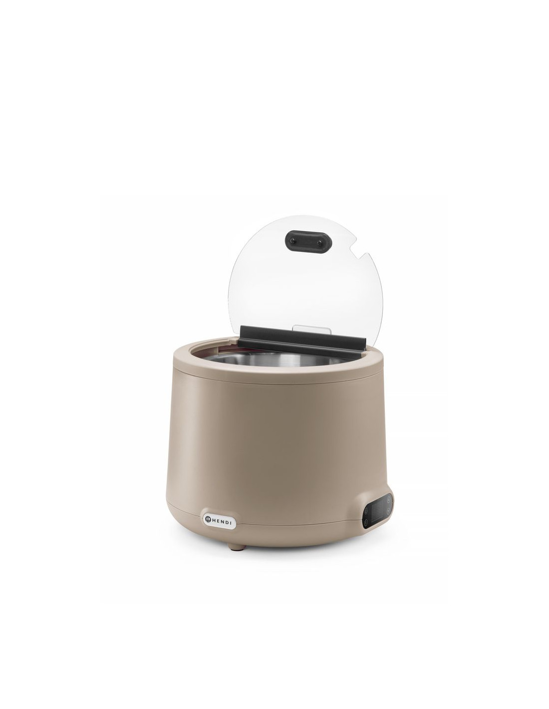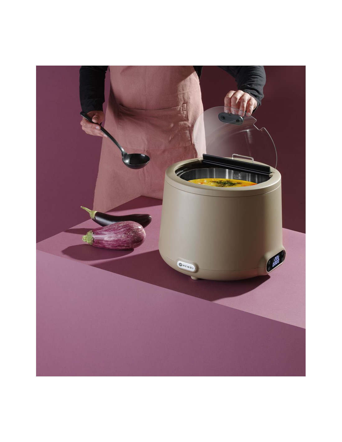 HENDI UNIQ designades av den välkände holländska designern Robert Bronwasser och finns i fyra snygga färger. Det moderna höljet har ett par enastående funktioner. Den senast inställda temperaturen lagras i minnet. Anslut bara soppan, fyll vattenbehållaren och soppgrytan håller soppan vid perfekt serveringstemperatur.