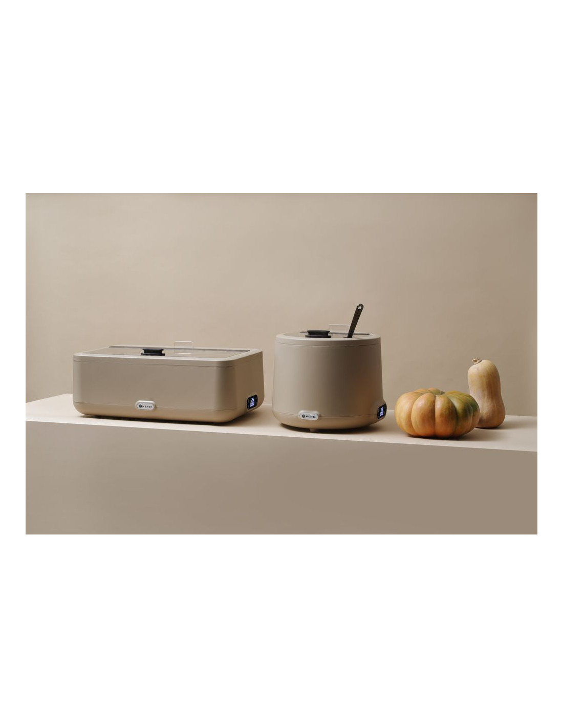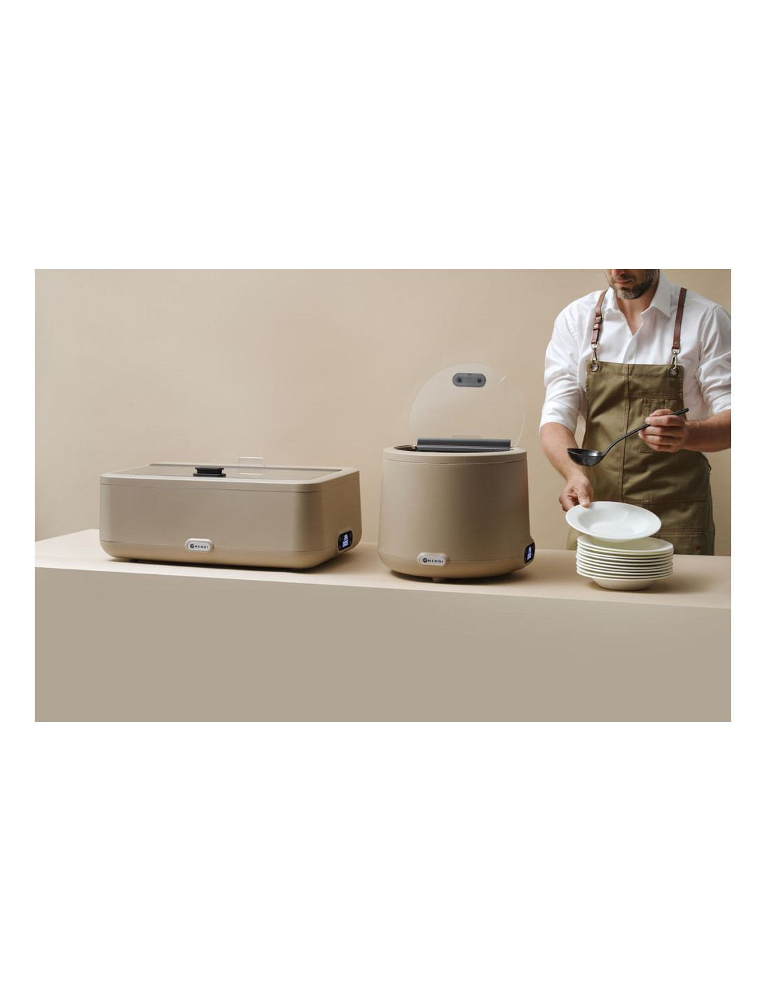 HENDI UNIQ designades av den välkände holländska designern Robert Bronwasser och finns i fyra snygga färger. Det moderna höljet har ett par enastående funktioner. Den senast inställda temperaturen lagras i minnet. Anslut bara strömmen, fyll vattenbehållaren och varmhållningsformen håller grytor, kött, kokta grönsaker, pasta, såser och andra rätter vid perfekt serveringstemperatur.