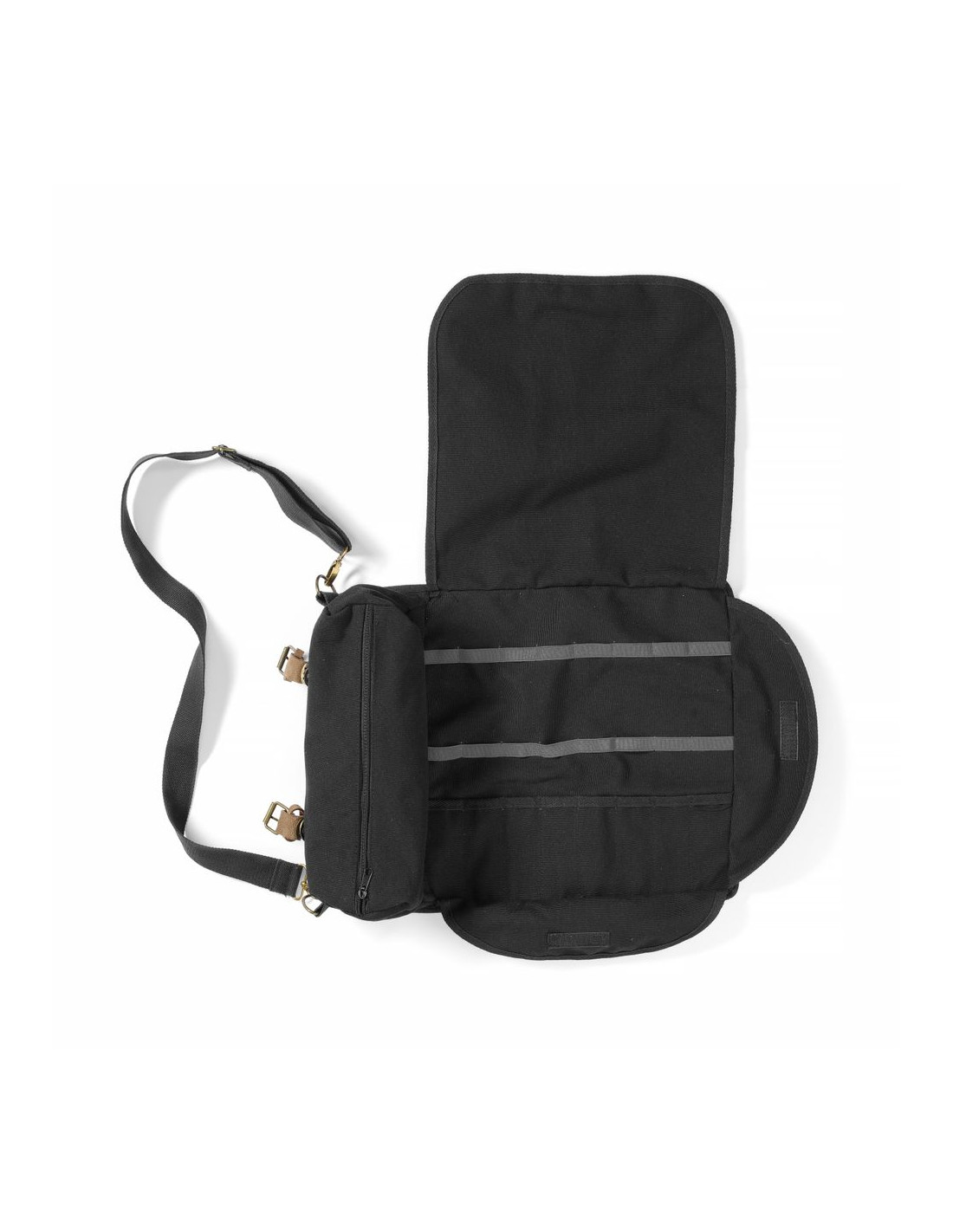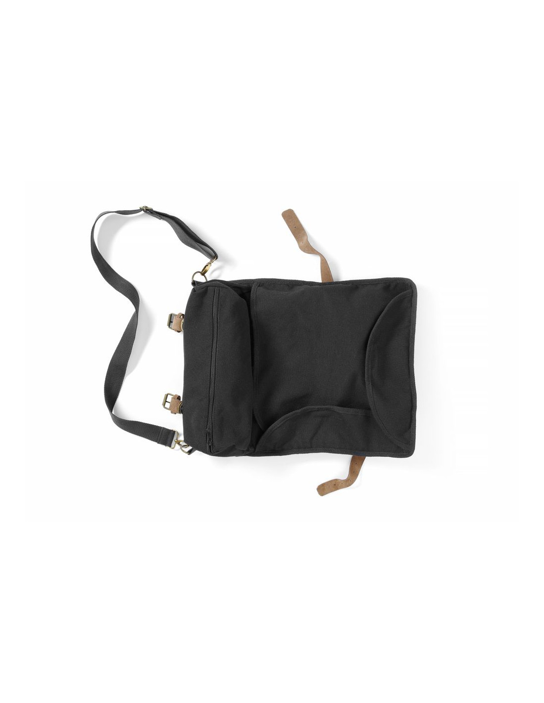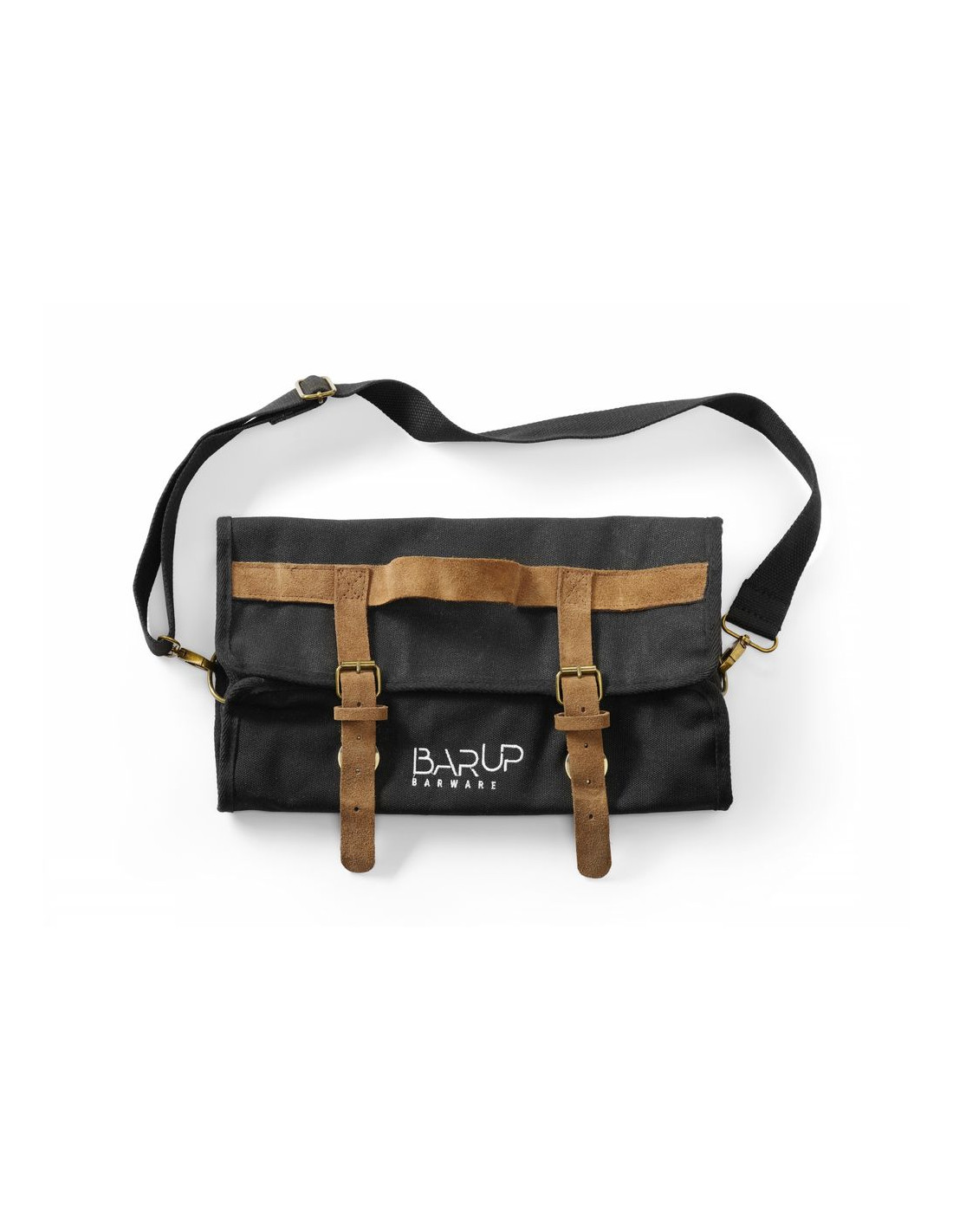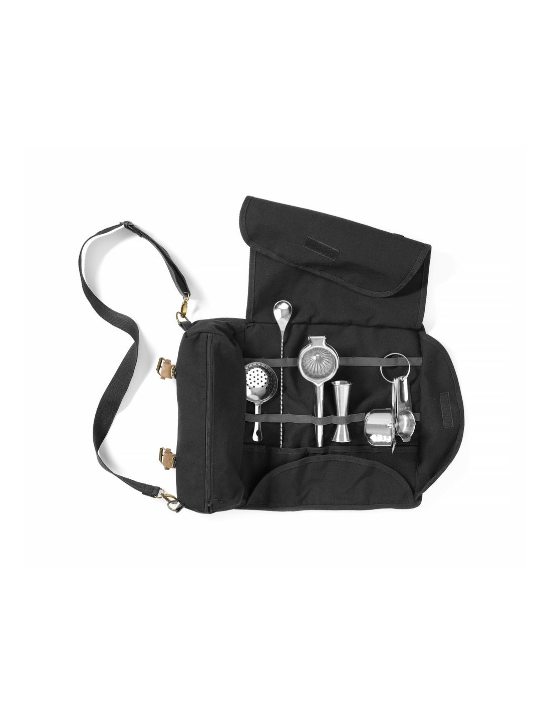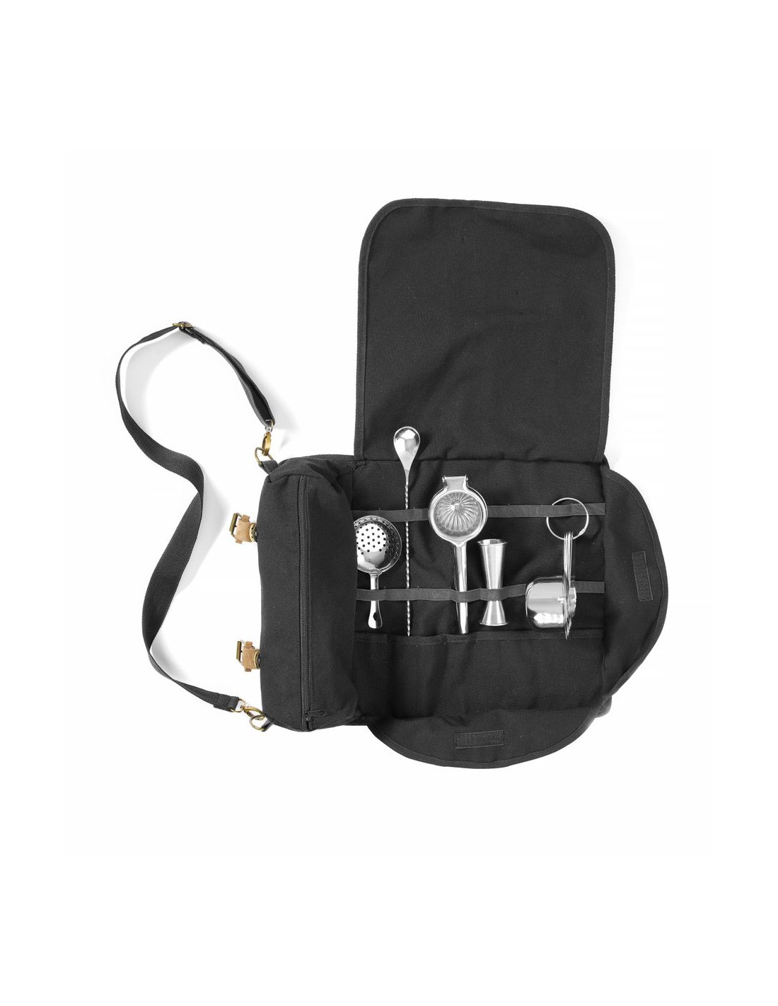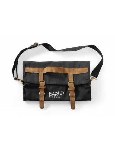 Tillverkad av tjock bomull med slätväv. Väskan har en kant med översömmar för förstärkning och en elegant finish. Beslag i rostfritt stål i antik guldfärg. Remmar tillverkade av brunt naturläder (mocka). Svart axelrem i bomull, justerbar i längd och avtagbar. Säker stängning med spännen och läderremmar. Layout: – 8 fickor (t.ex. för bartenderskedar, pincett), – 8 elastiska öppna fack (t.ex. för jiggers), – 3 flikar fästa med kardborreband, – blixtlåsförsett fack för shaker-/bostonshakerglas, mäter 37x15 cm. Mått på innerdelen (med stängda flikar): 37x33,5 cm. Bartenderverktyg ingår ej.