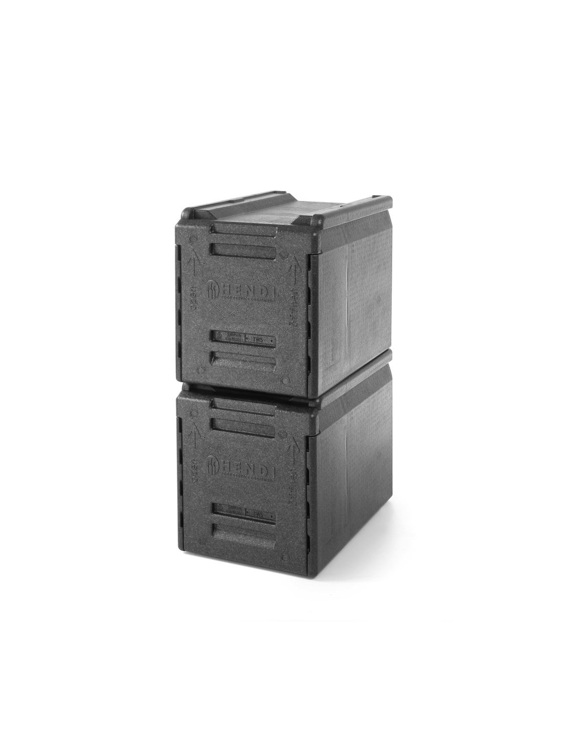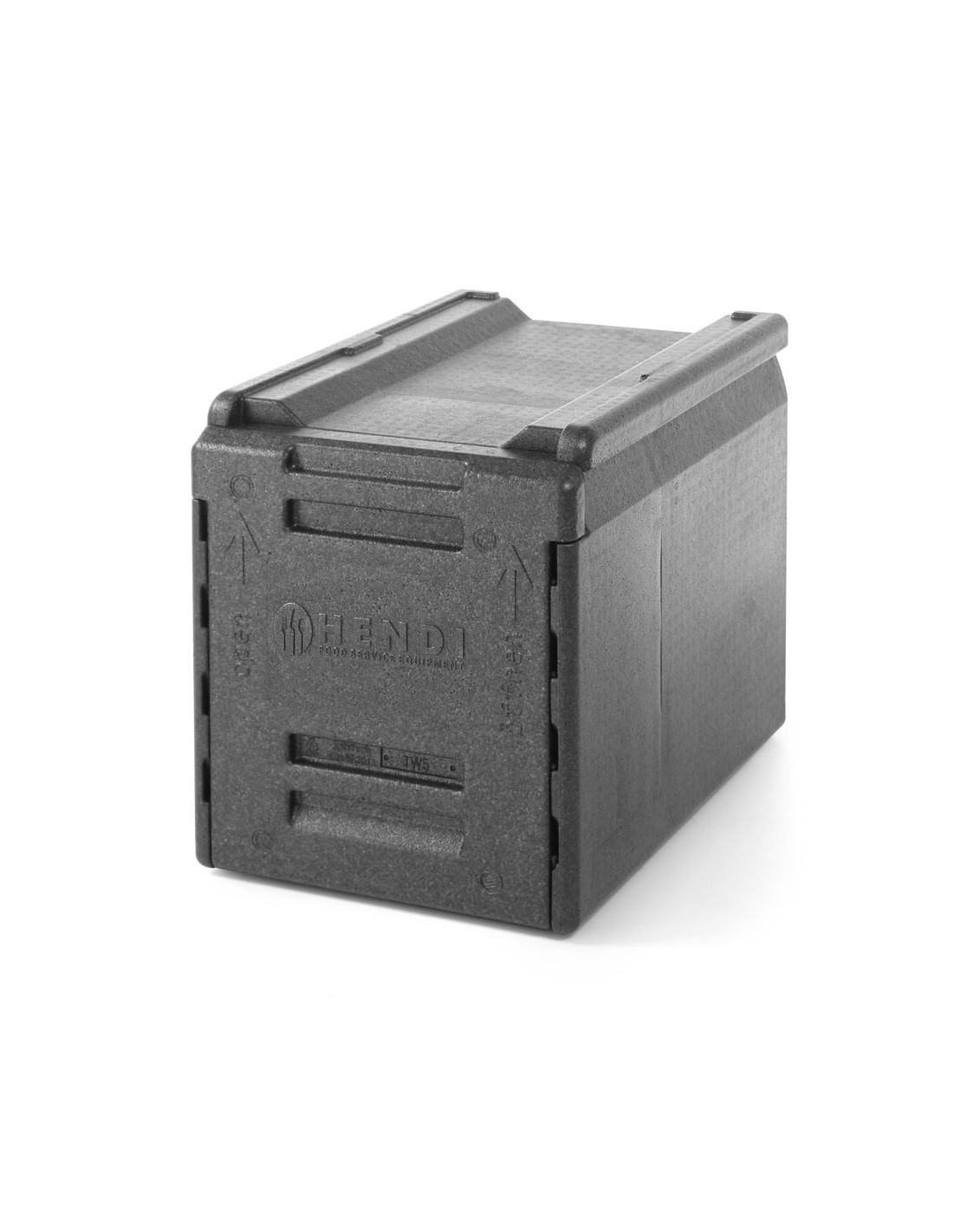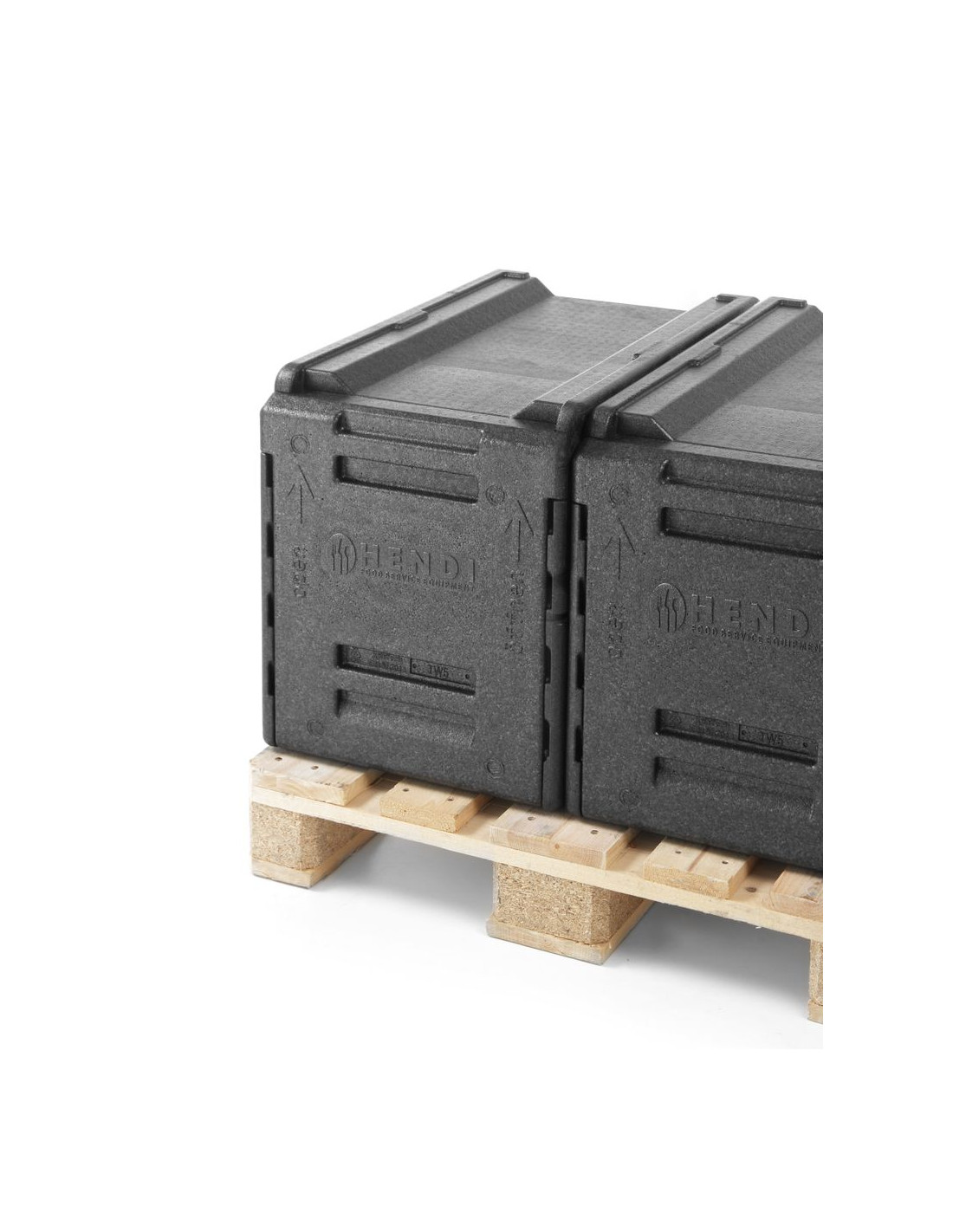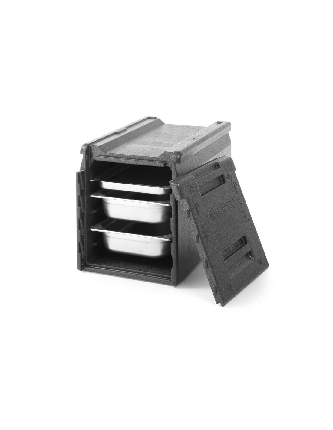 Ultralätt och hållbar behållare med perfekt tätningsbar öppning. Avtagbar dörr – även om lådorna är staplade. Med 5 spår med 65 mm mellanrum för att skjuta in behållare, passar GN1/1-behållare. De höga staplingslistorna med låsprofil säkerställer stabil stapling utan glidning. Passar perfekt på europallar – fyra lådor per lager.