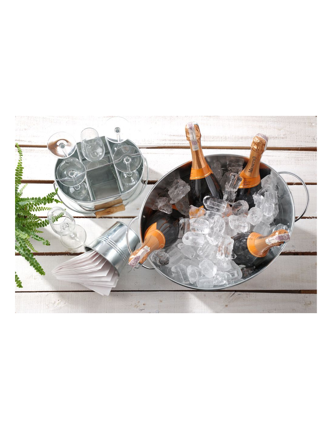 Tillverkad av galvaniserad stålplåt, vilket skapar ett rustikt utseende. Galvaniserat stål är inte avsett för kontakt med livsmedel, klä hinkarna med våra bakplåtspappersark när du använder dem för servering av mat.