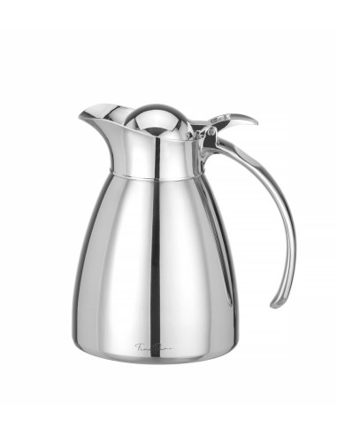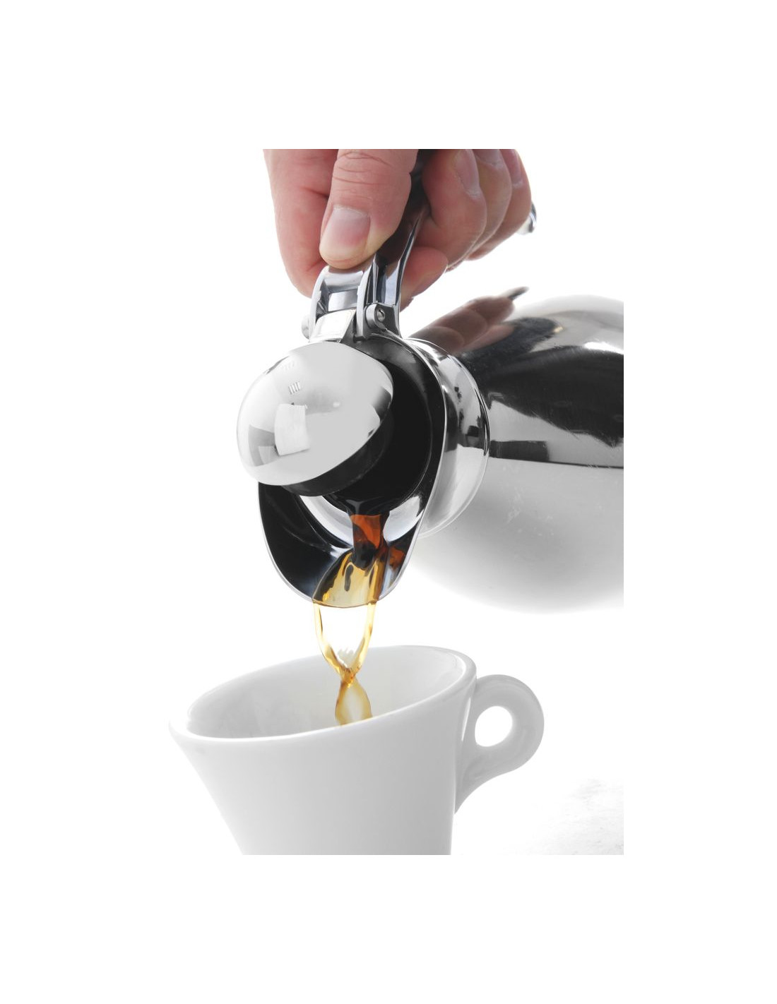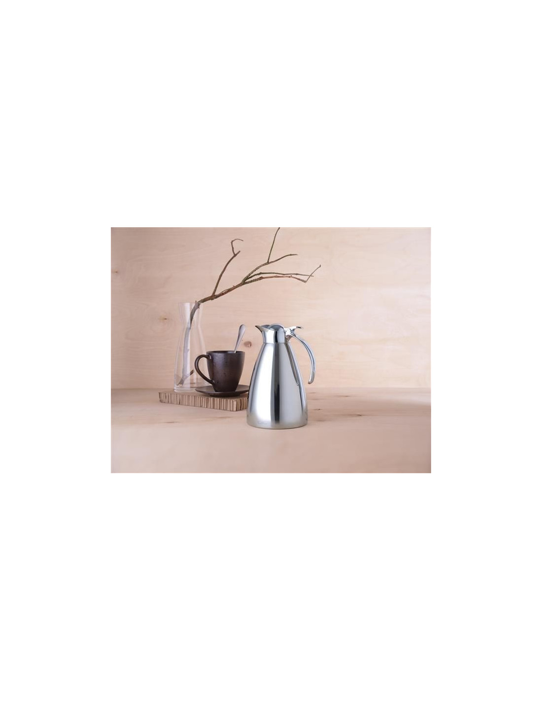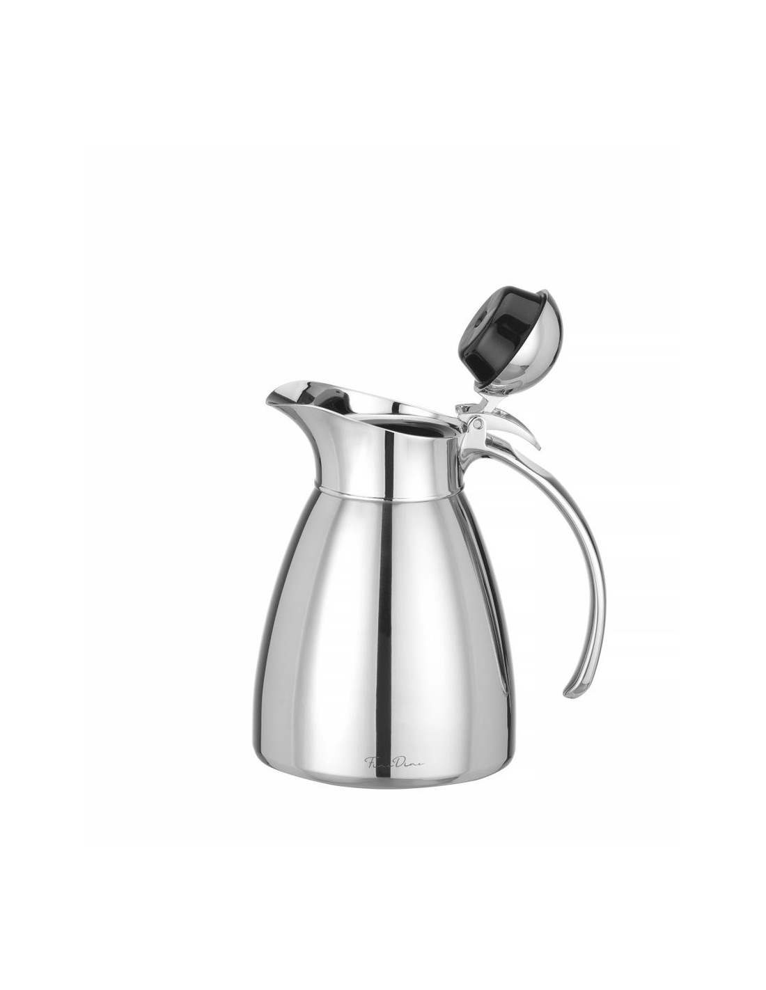 Dubbelväggigt rostfritt stål. Sömlös struktur. Vakuumisolering. Kromat metalllock, spak, pip och handtag. Högt isoleringsvärde.