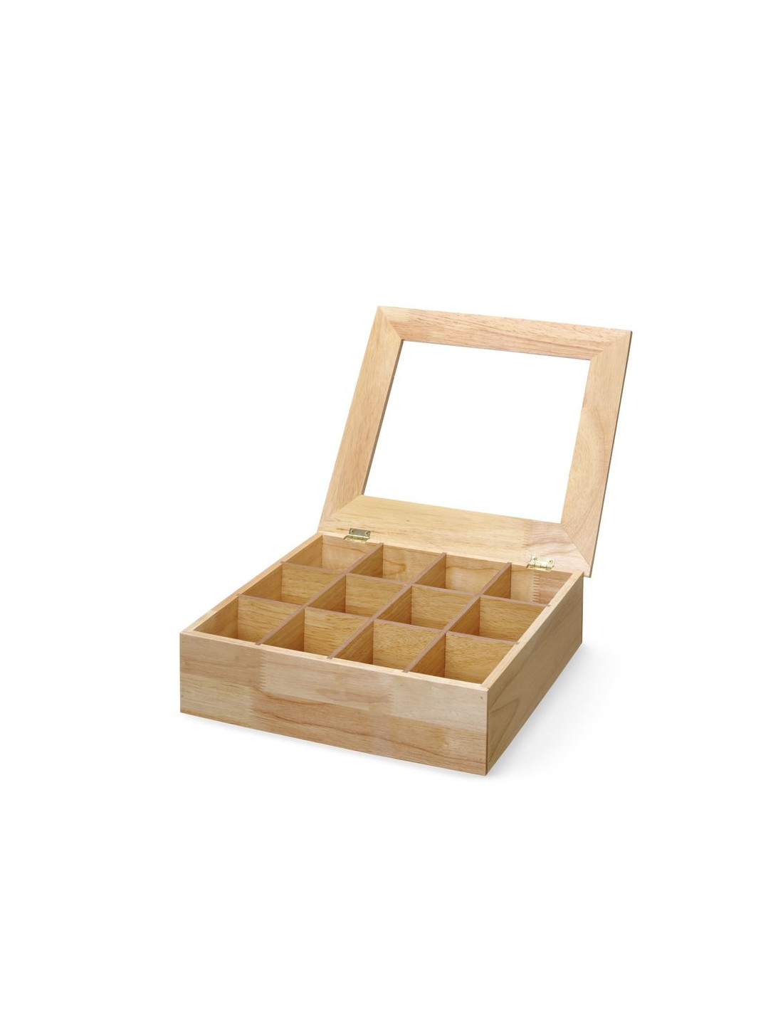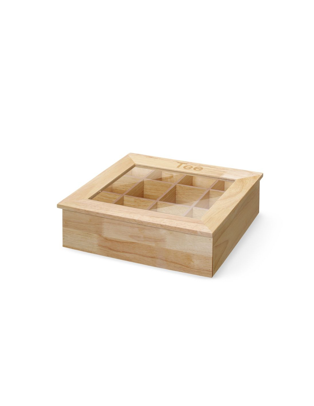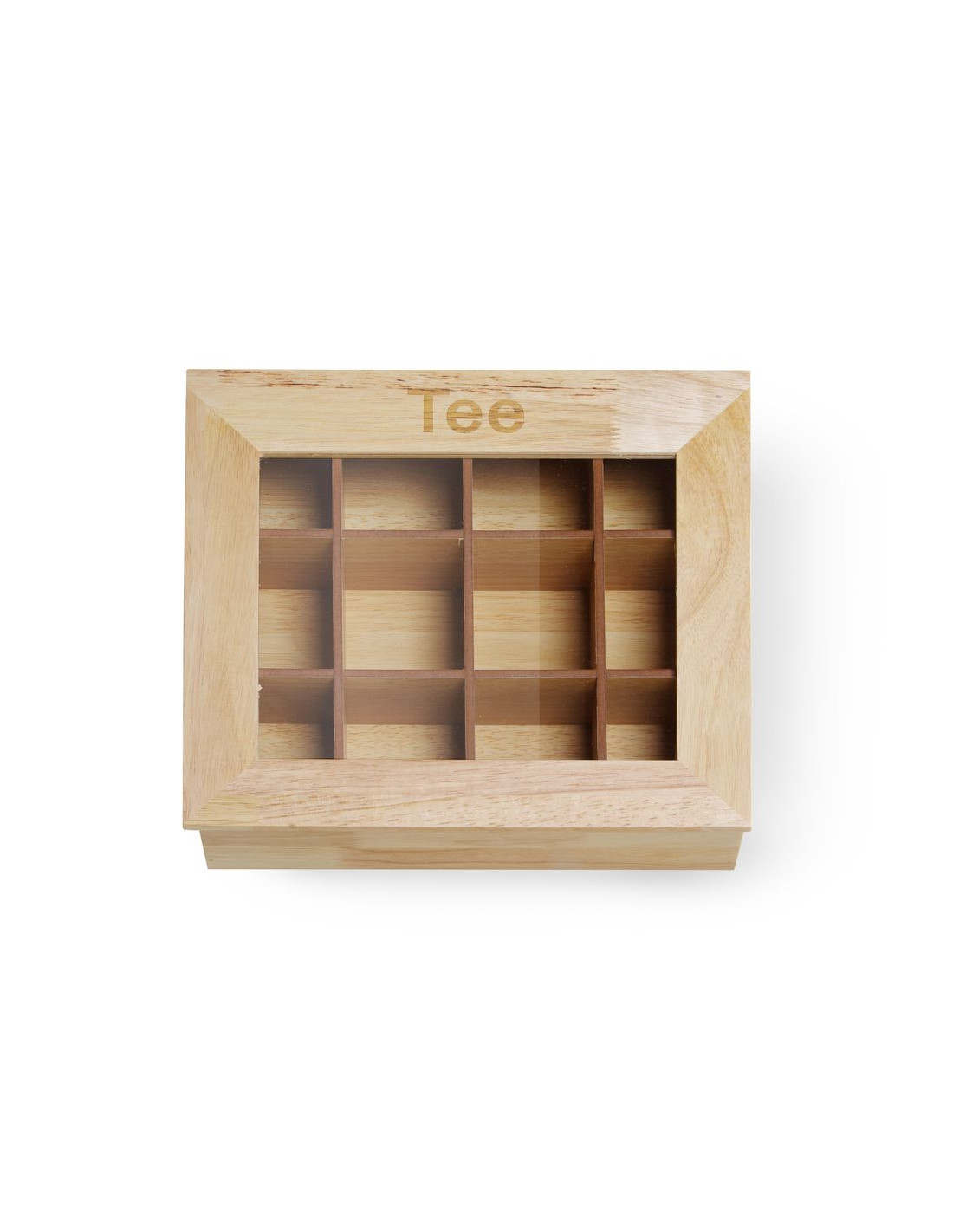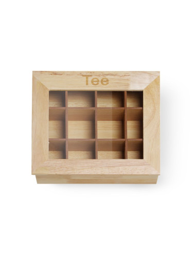 Ask tillverkad av trä i en naturlig ljus nyans. Lock: träram med ett akrylfönster, på gångjärn, öppnas uppåt. 12 fack i ask, vardera med plats för 12 tepåsar.