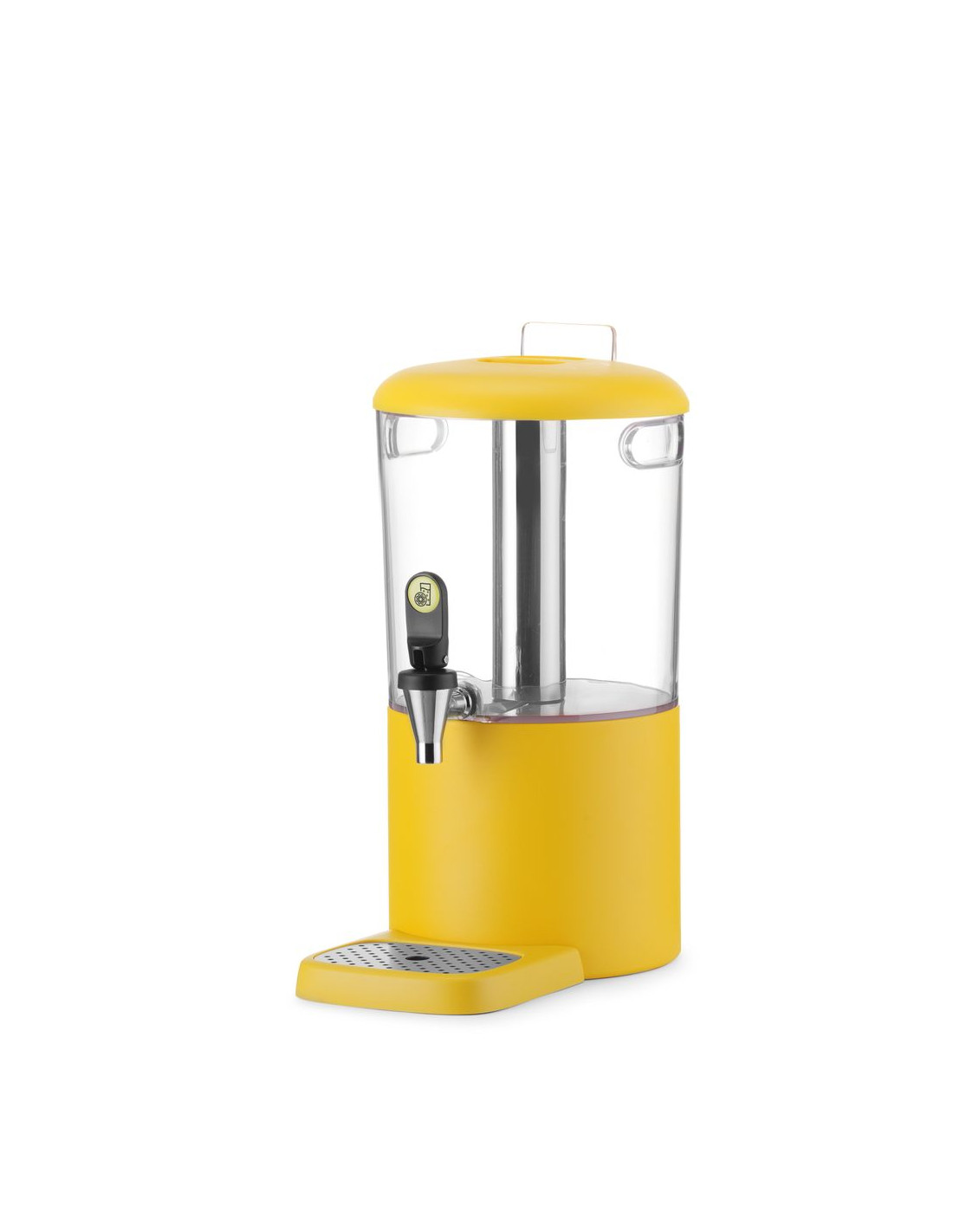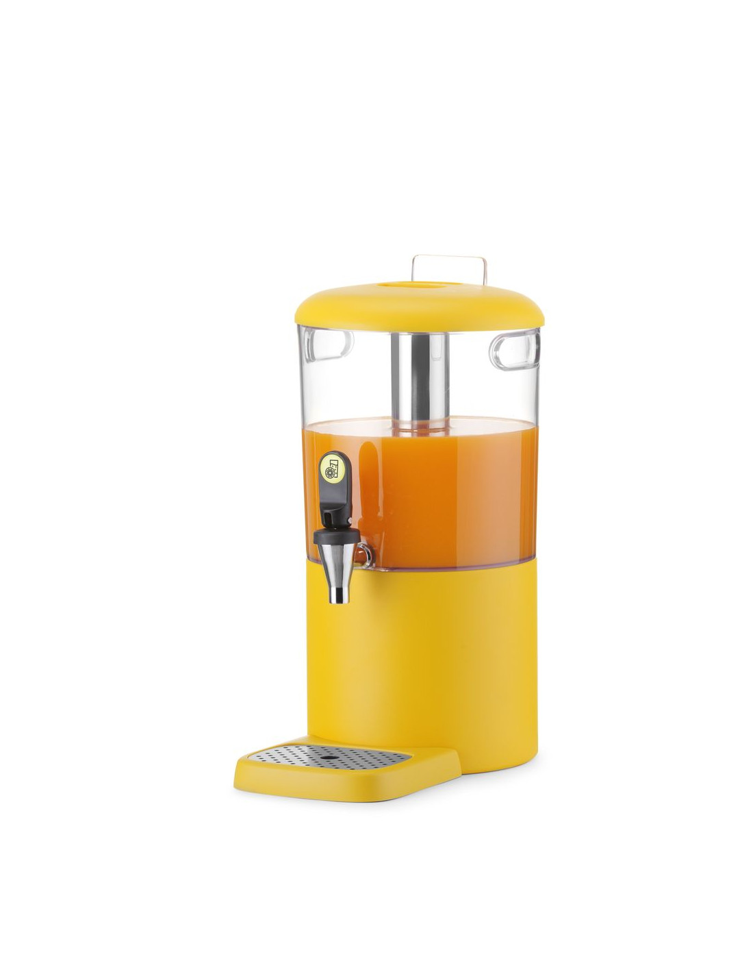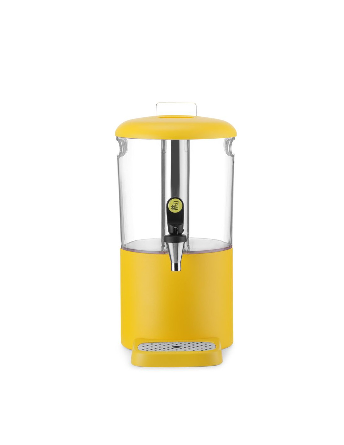 Hölje tillverkat av slitstarkt ABS. Magnetisk droppbricka med färgmatchad hölje, lätt att rengöra, med perforerad insats i rostfritt stål. Avtagbar kylstång i rostfritt stål för is hjälper till att hålla dryckerna kalla. Snabb montering och demontering säkerställer enkelt hygieniskt underhåll. Dryckesbehållare utformad för att minimera rester i botten. Praktiska bärhandtag för enkel transport av dispensern. Färgglad bas tillverkad av polypropen. Etiketthållare för drycksidentifiering. Droppfri kran placerad 130 mm ovanför basen. Enkel dryckesutmatning. Transparent hölje möjliggör enkel övervakning av vätskenivån. Erbjuds i två kapaciteter – 4 och 8 liter. Finns i tre färger som matchar andra delar av UNIQ-kollektionen: svart, vit och gul. Modern design av Robert Bronwasser. Tidlös färgpalett, kompletterar perfekt presentationen av kalla drycker på en buffé. HENDI Juicer är en del av den prisbelönta UNIQ-kollektionen från Buffet Reinvented-serien.