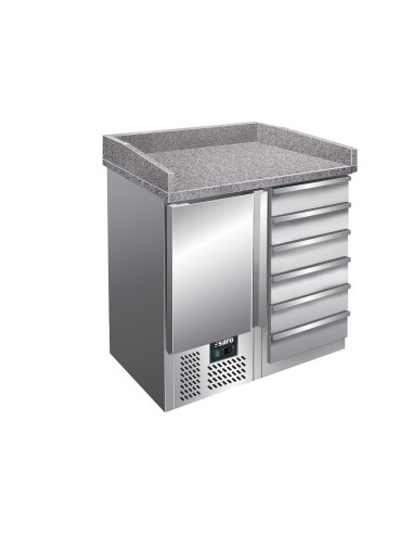 Material: (hölje och insida) rostfritt stål; (bänkskiva med uppstående ställning) granit