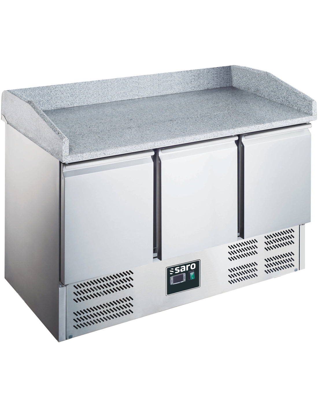 Material: (hölje och insida) rostfritt stål; (bänkskiva med uppåtstående) granit