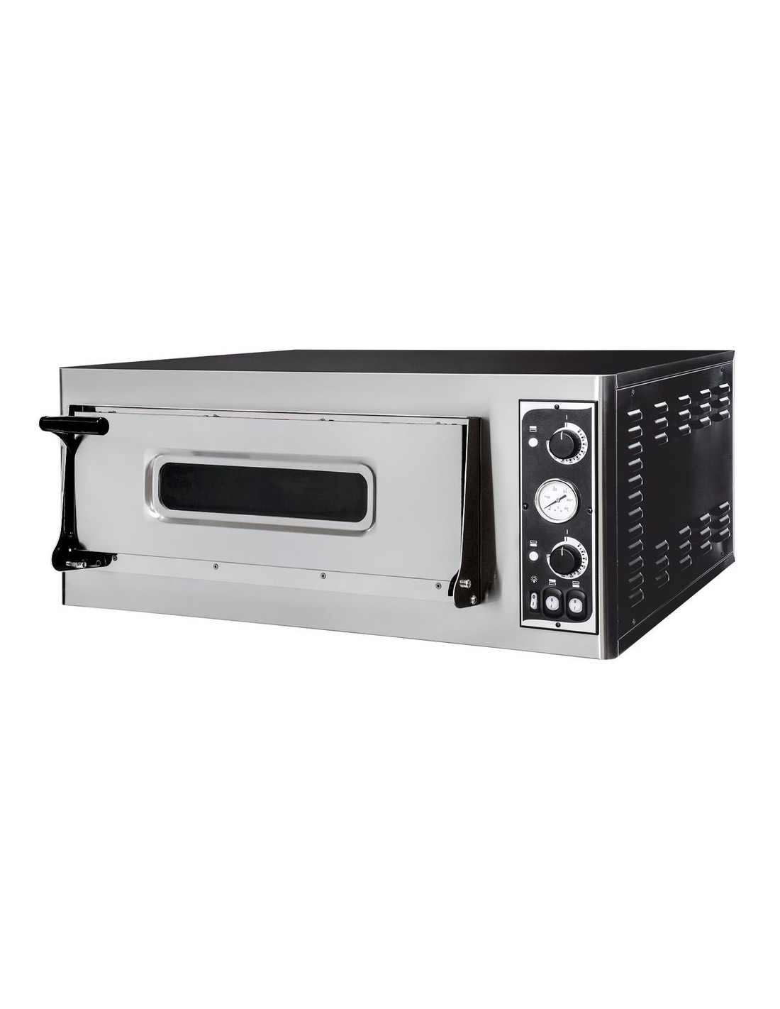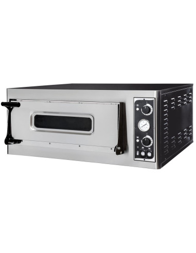 Stålhölje med rostfri front, isolerat med stenull. Analog kontrollpanel med individuella kontroller för varje värmeelement, två element per ugnskammare. Varje ugnskammare är försedd med eldfasta tegelstenar, en termometer och en lampa. Modeller med 2 kammare har helt separata kontrollpaneler för varje ugnskammare. Temperaturområde: 50 °C upp till 500 °C.
