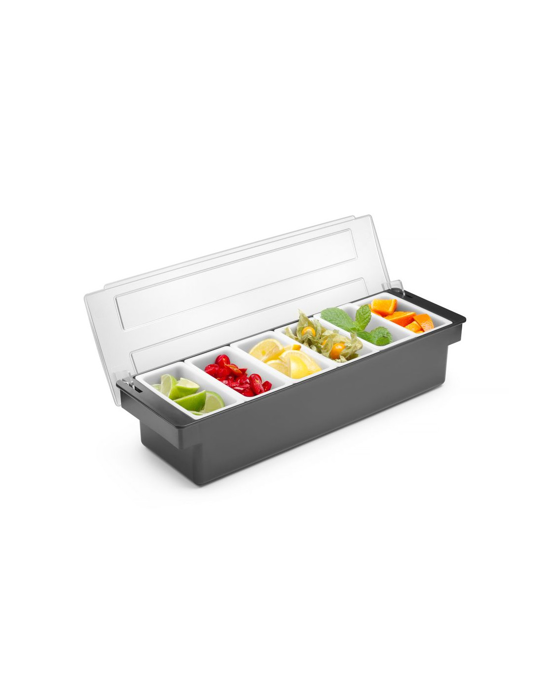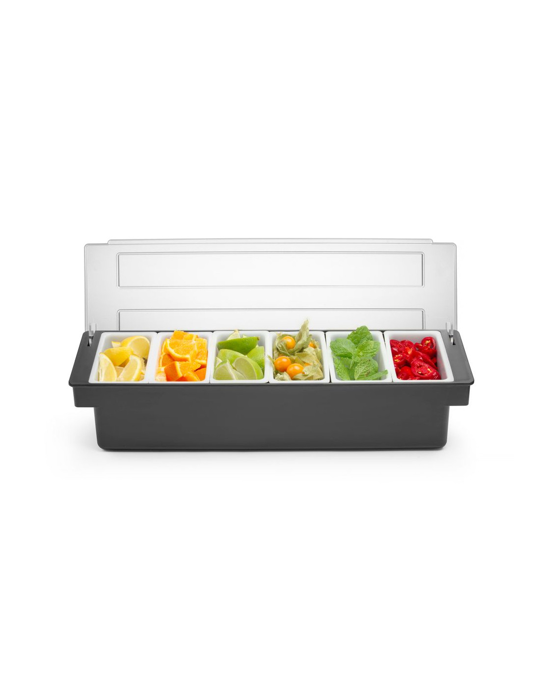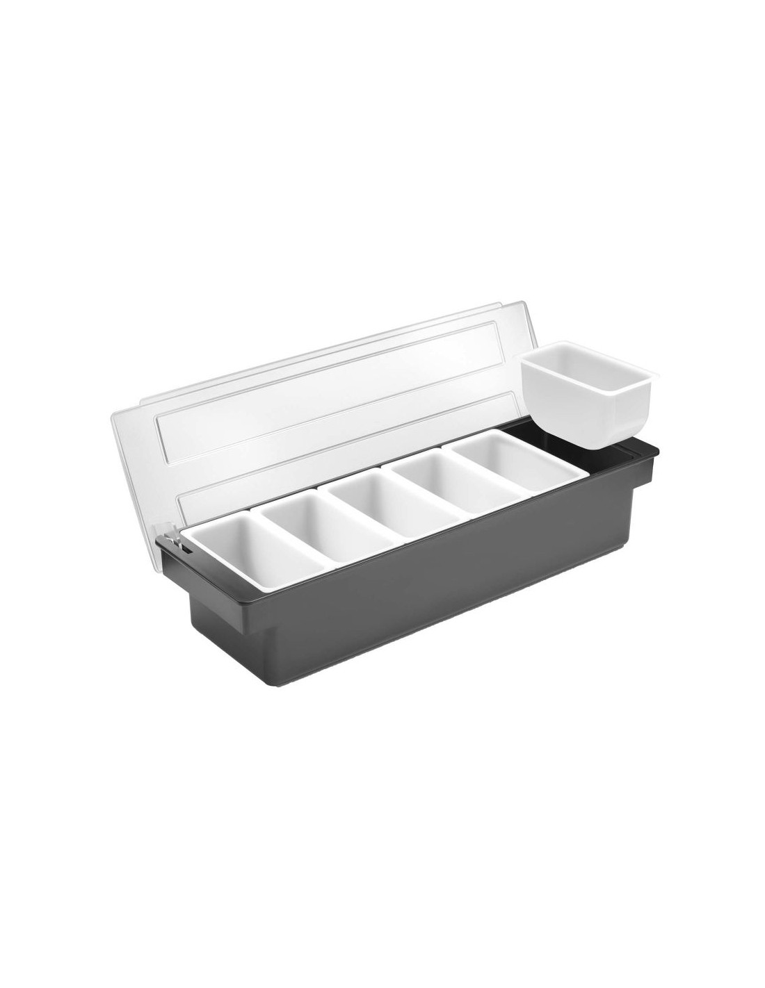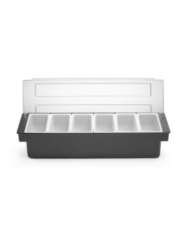 För användning i barer, pubar och restauranger. Tillverkad av premiumplast. HIPS-hölje och transparent ABS-lock för att skydda mat från kontaminering eller insekter. 6 behållare av polypropen för separat förvaring av frukt eller kryddtillsatser. Varje behållare kan enkelt tas bort från hållaren, t.ex. för att fylla på produkten. Diskmaskinssäkra behållare.