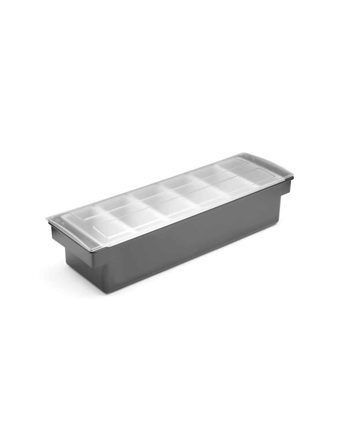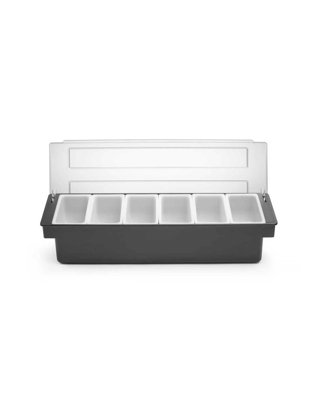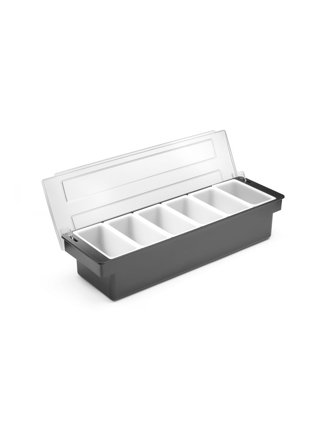 För användning i barer, pubar och restauranger. Tillverkad av premiumplast. HIPS-hölje och transparent ABS-lock för att skydda mat från kontaminering eller insekter. 6 behållare av polypropen för separat förvaring av frukt eller kryddtillsatser. Varje behållare kan enkelt tas bort från hållaren, t.ex. för att fylla på produkten. Diskmaskinssäkra behållare.