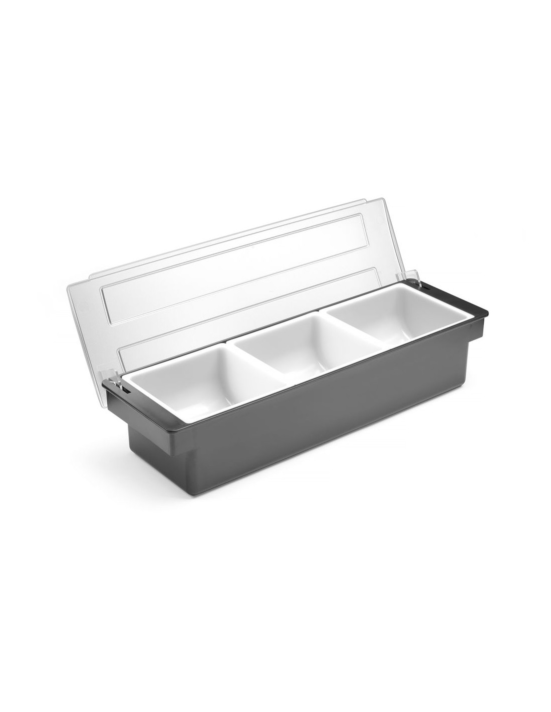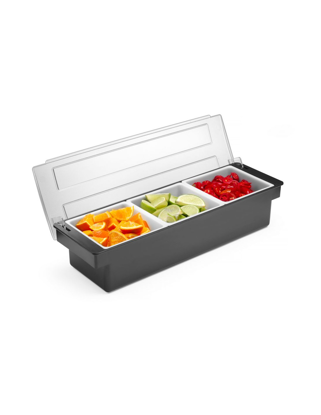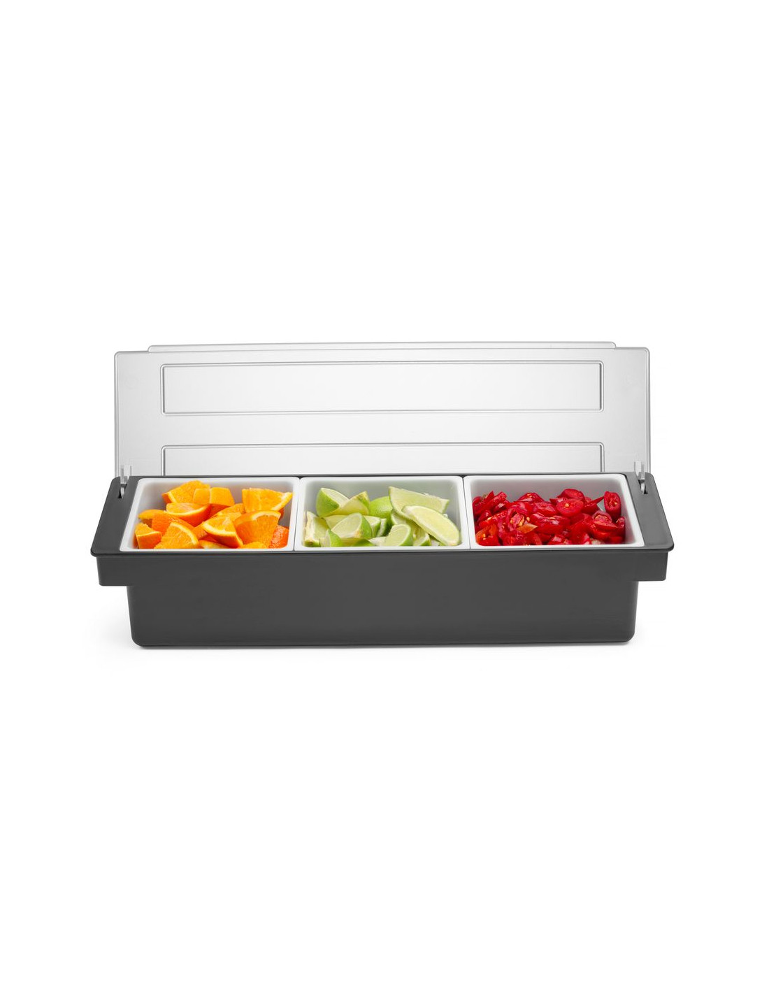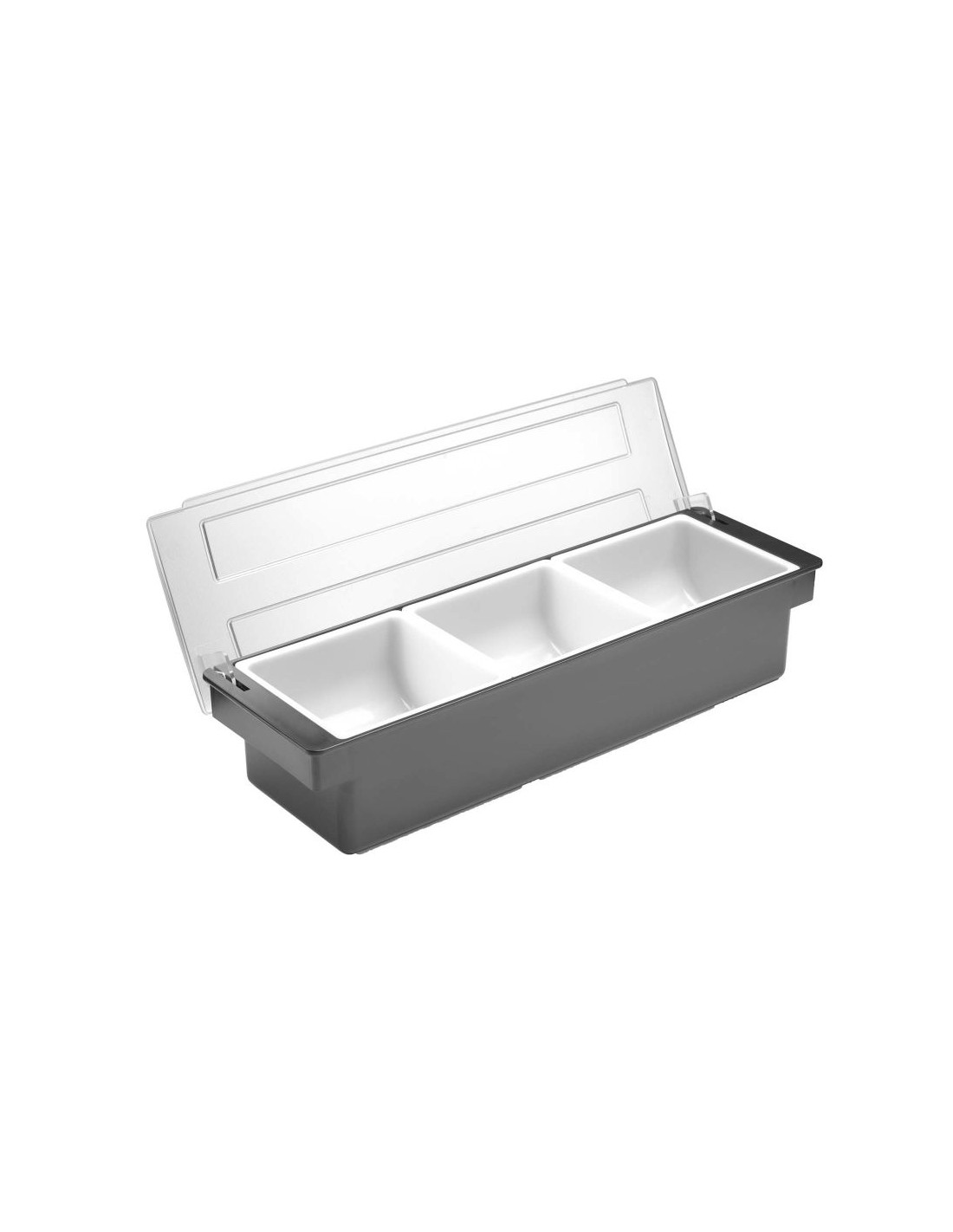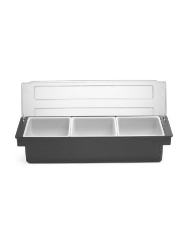 För användning i barer, pubar och restauranger Tillverkad av premiumplast HIPS-hölje och transparent ABS-lock för att skydda mat från kontaminering eller insekter 3 polypropylenbehållare för separat förvaring av frukt eller kryddtillsatser Varje behållare kan enkelt tas bort från hållaren, t.ex. för att fylla på produkten Diskmaskinssäkra behållare
