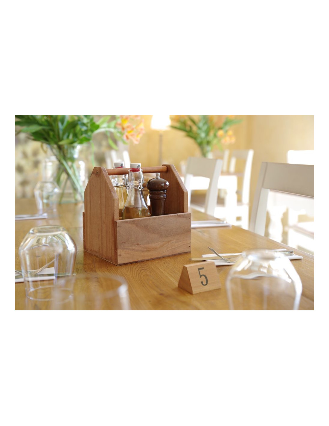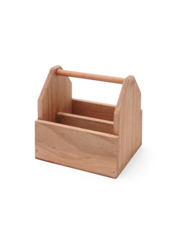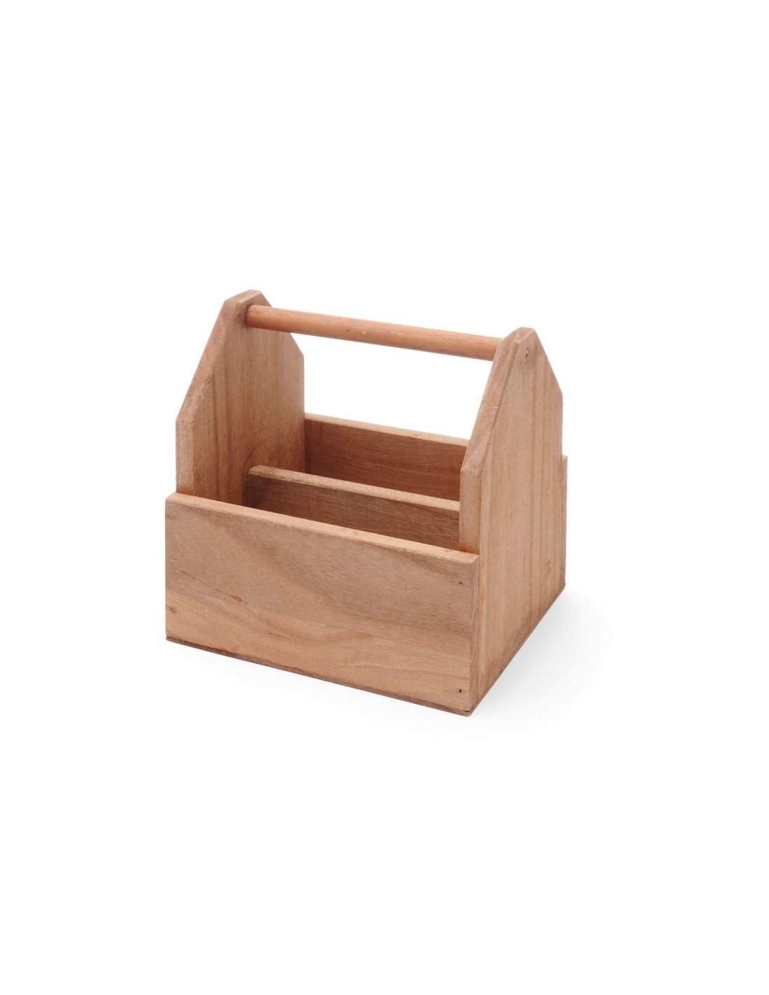 Tillverkad av slitstarkt trä. Med 2 fack och ett stort handtag. Tillbehör som visas på bilden ingår ej.