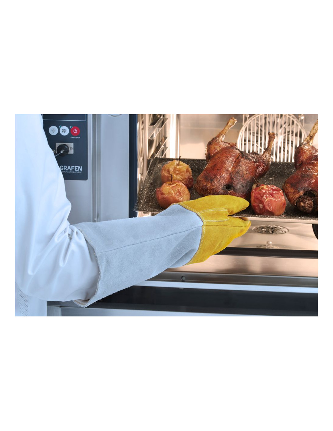Värmebeständig upp till 250 °C i 10 sekunder. Tillverkad av koläder. Extra lång för att skydda underarmen.