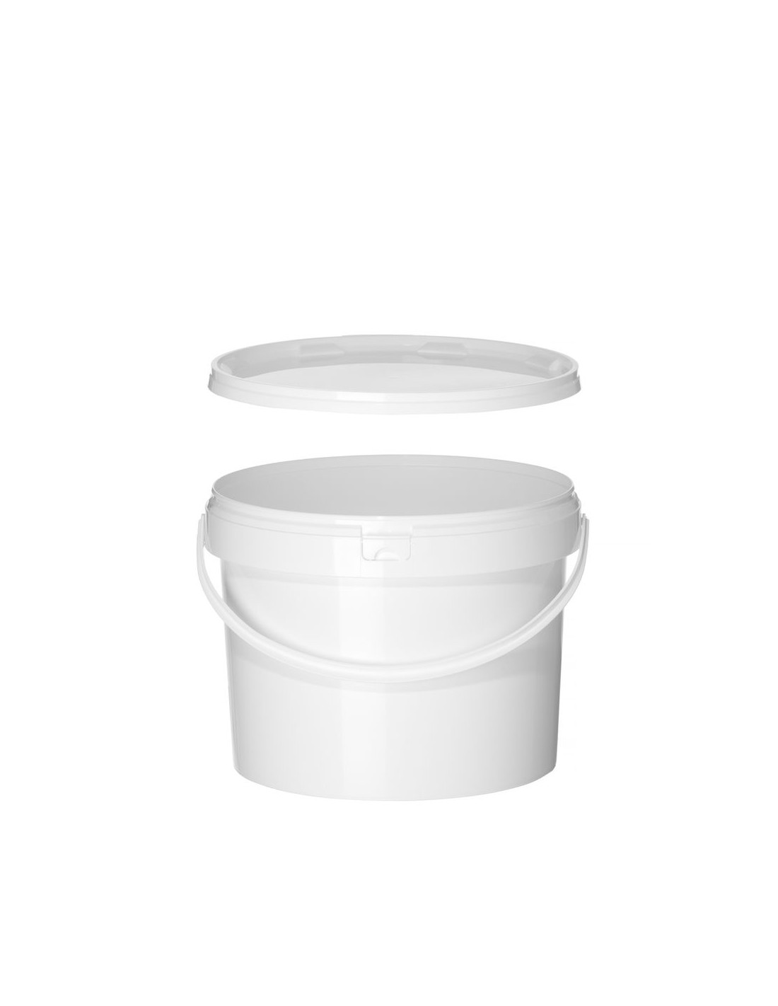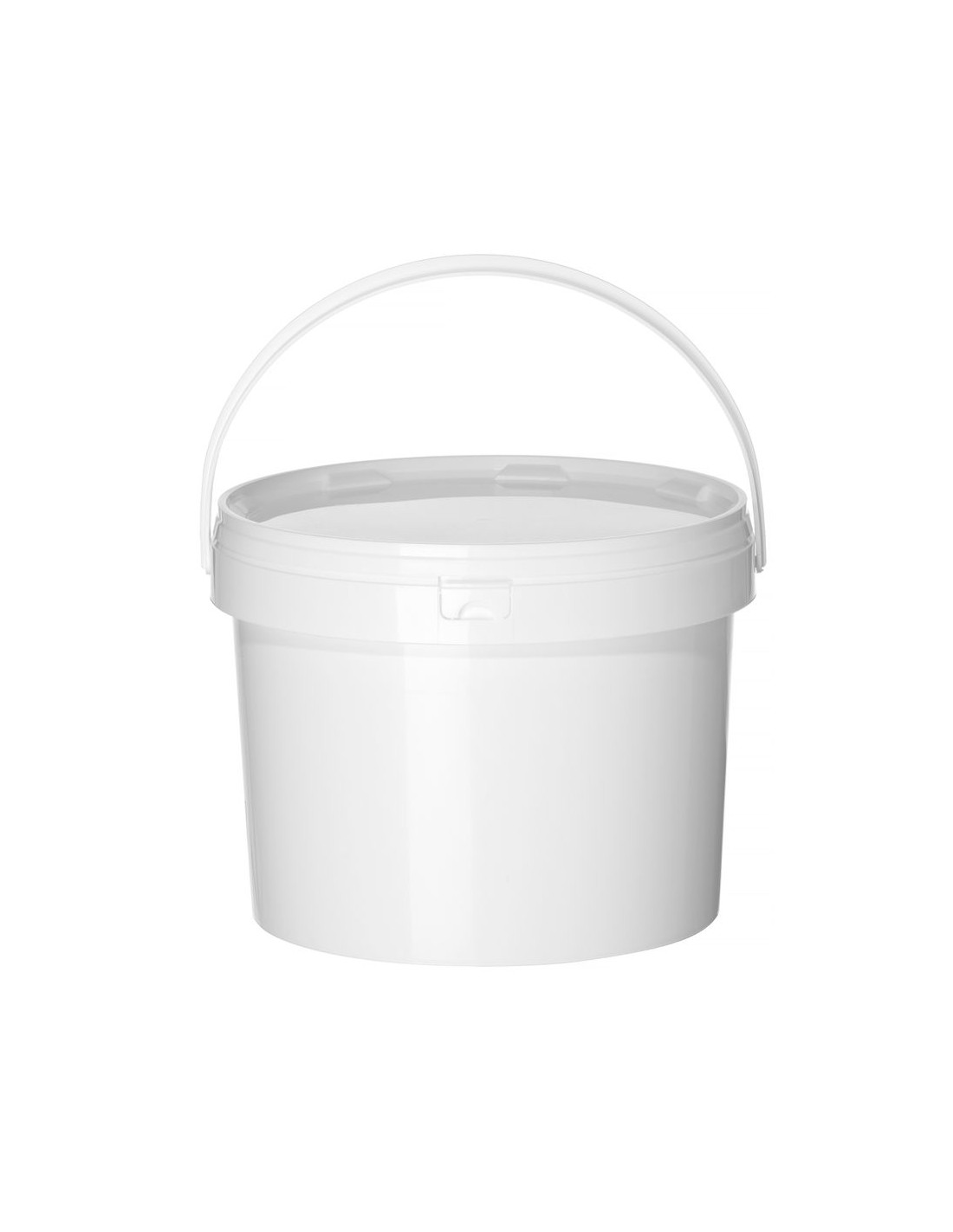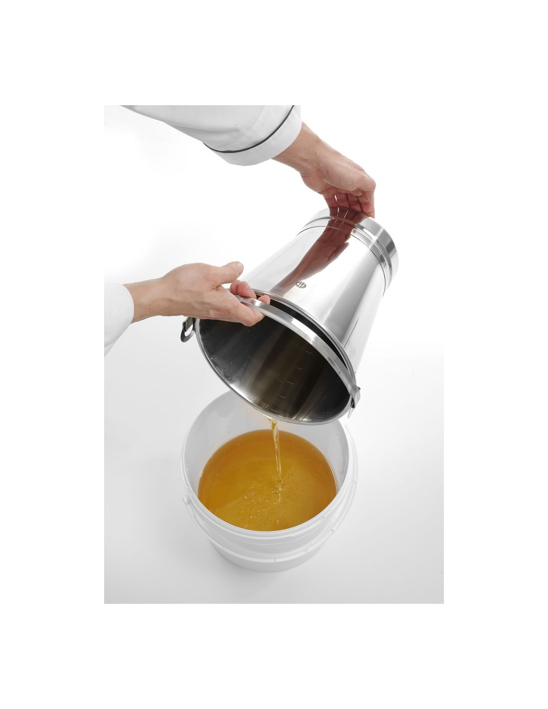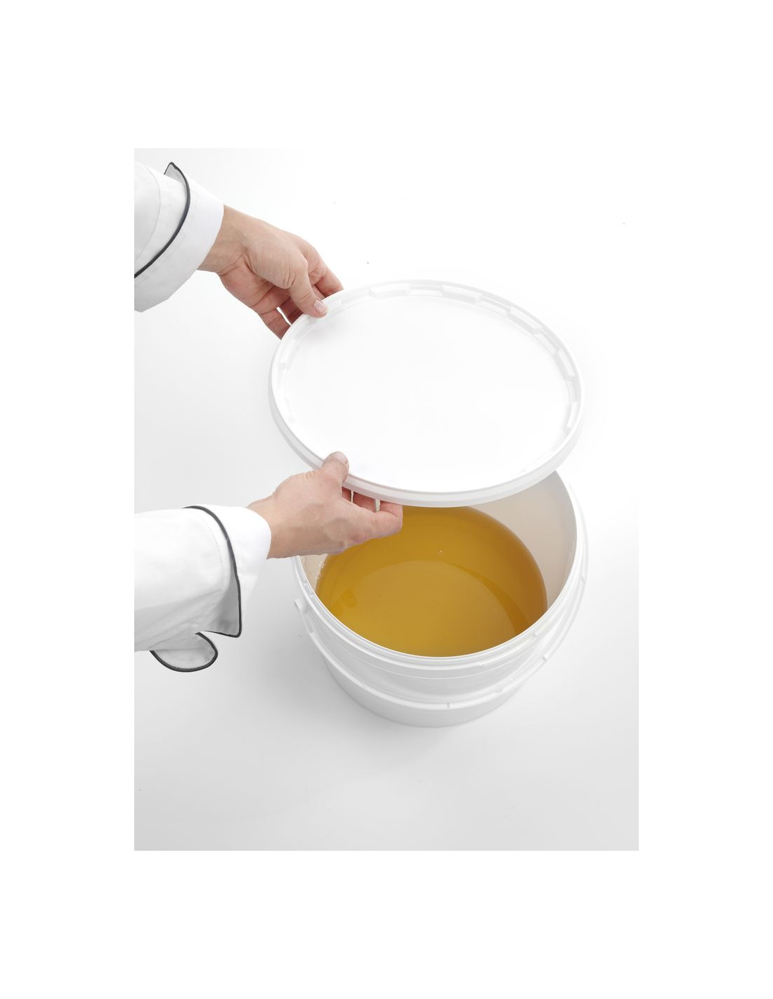 Lämplig för förvaring av stekolja och såser. Tillverkad av vit polypropen. Hög värmebeständighet - kan fyllas med vätskor vid temperaturer mellan 85-95 °C. Bekvämt plasthandtag. Lock av polypropen (ingår). Sidoyta lämplig för offsettryck eller märkning. Användbar volym: 11,3 l × 120 ml. Tryck-/märkningsyta: 810 x 155 mm. Stapelbar (maximal lastkapacitet för nedre hinken: upp till 45 kg). Vikt (med handtag och lock): 430 g.
