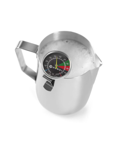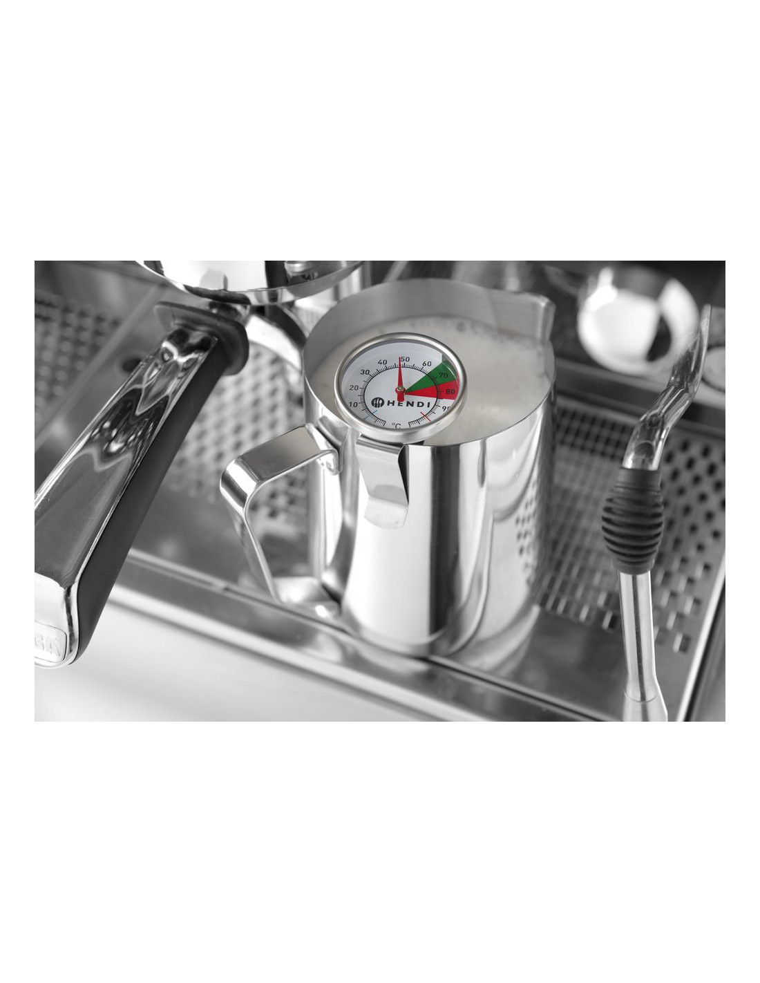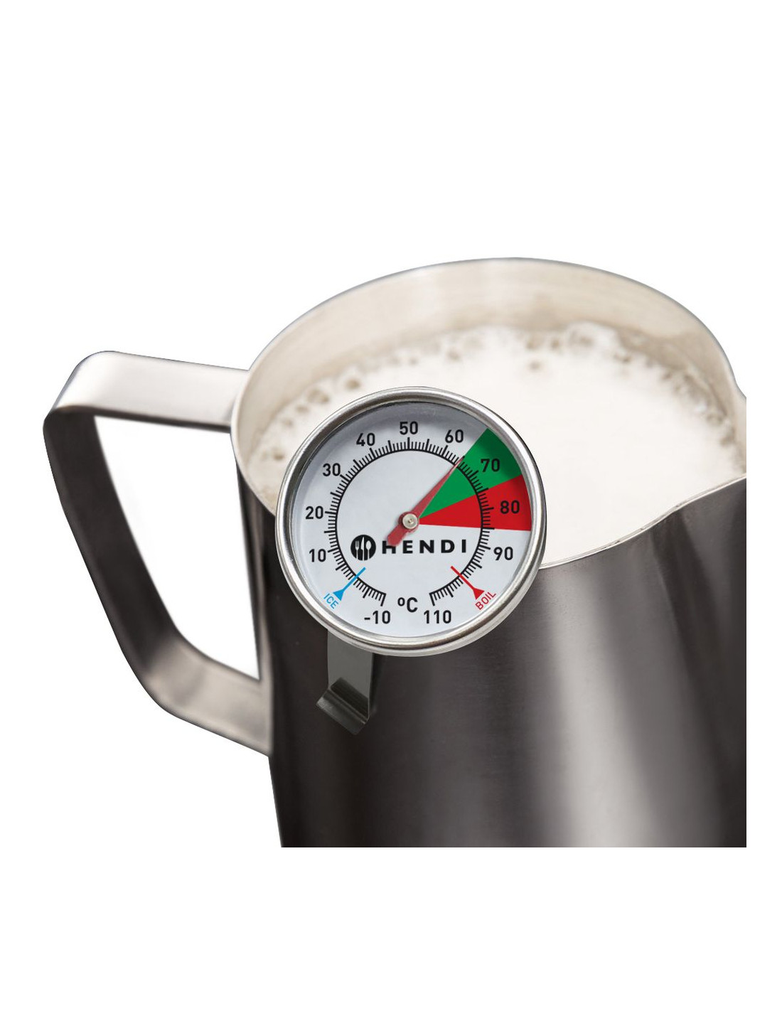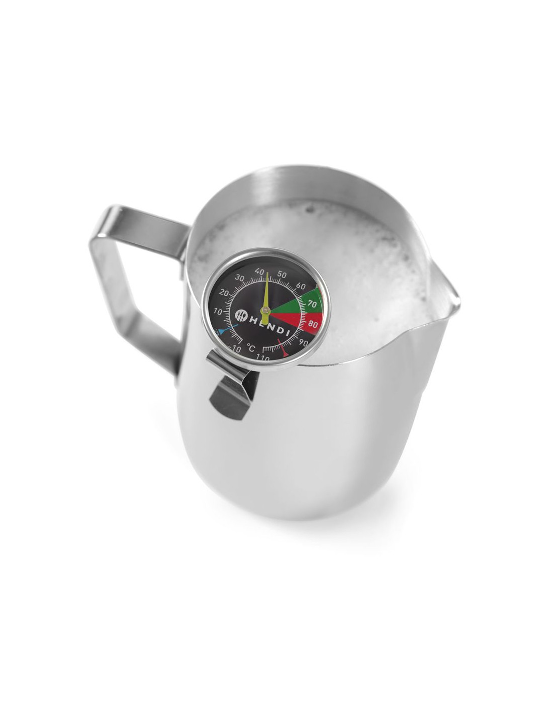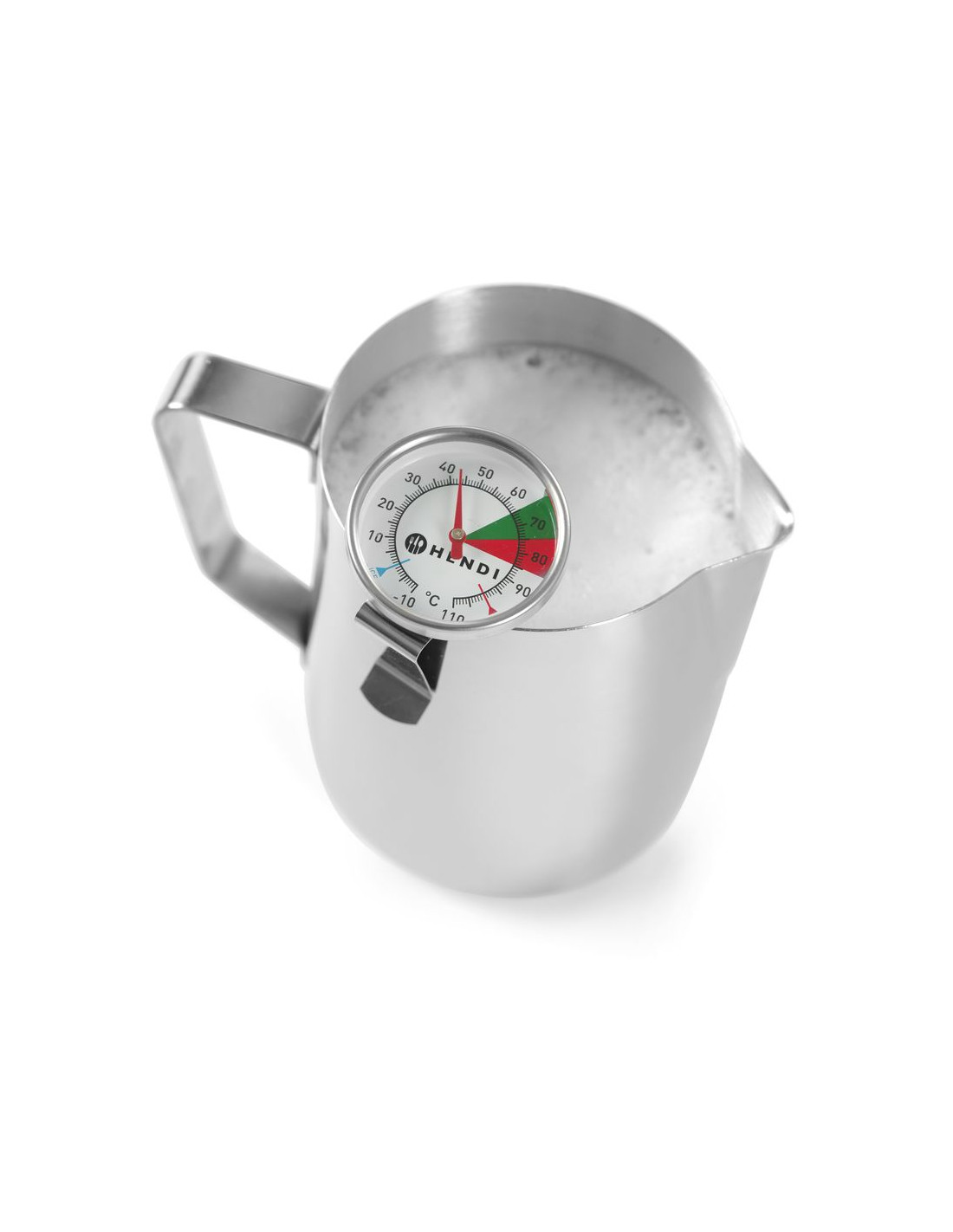 Med ett klämma för att fästa termometern på mjölkkannan. Grön markering indikerar perfekt mjölktemperatur för cappuccino etc. Temperaturjusterbar från -10 °C till 110 °C. 1 °C-gradering, noggrannhet: ≤ 2 %. Givare i rostfritt stål, lock med klämma. Lätt att avläsa.