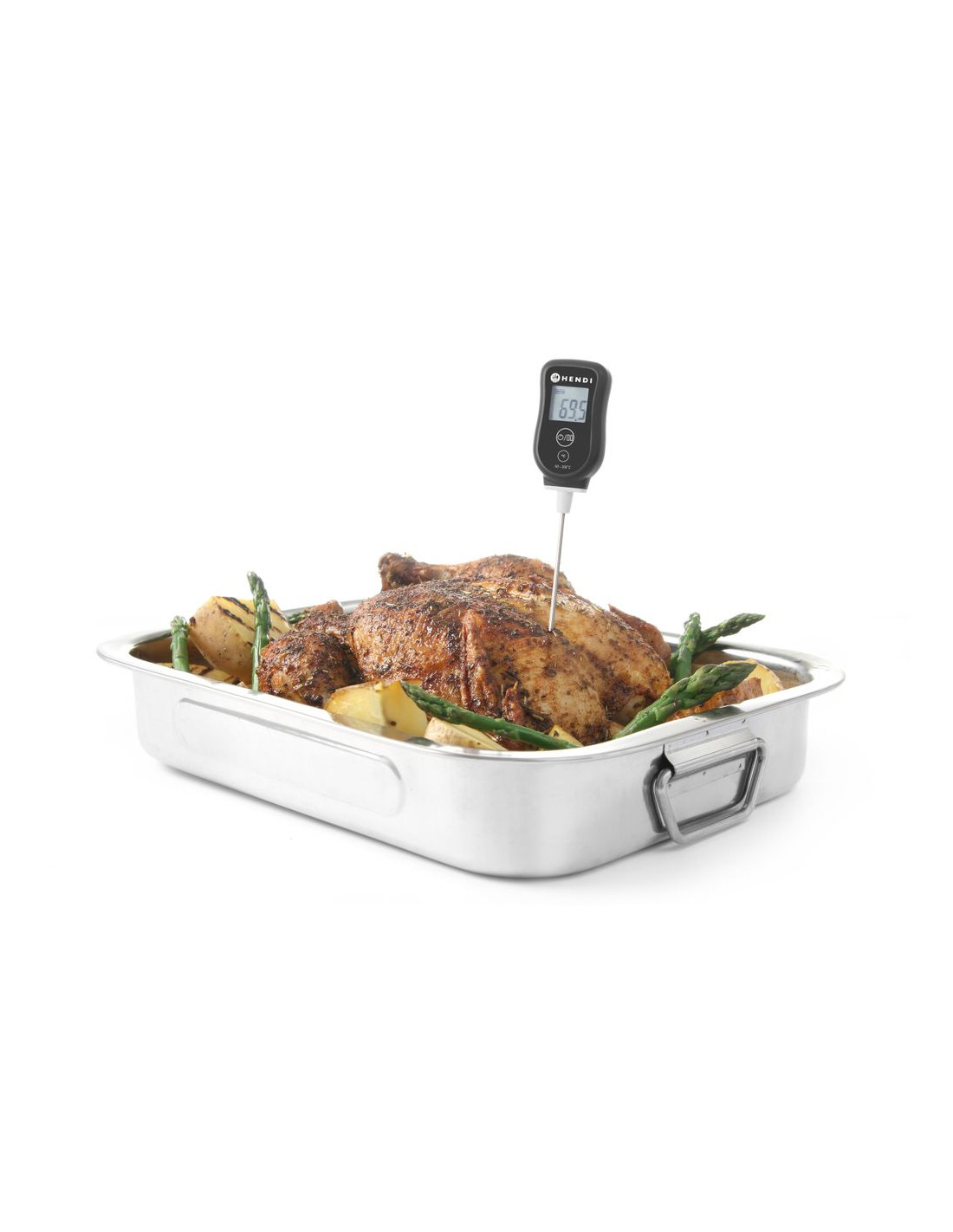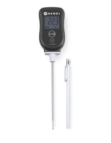 Ger snabba och noggranna temperaturavläsningar. Vattentät enligt IP65. Mätområde -50 °C till 350 °C, måttenhet °C eller °F. Gradering 0,1 °C, noggrannhet ≤ 0,8 %/0,8 °C. Hold-funktion - sparar momentan temperatur. 130 mm sond i rostfritt stål. Stängs av automatiskt. Med sondskydd. Batteri ingår.