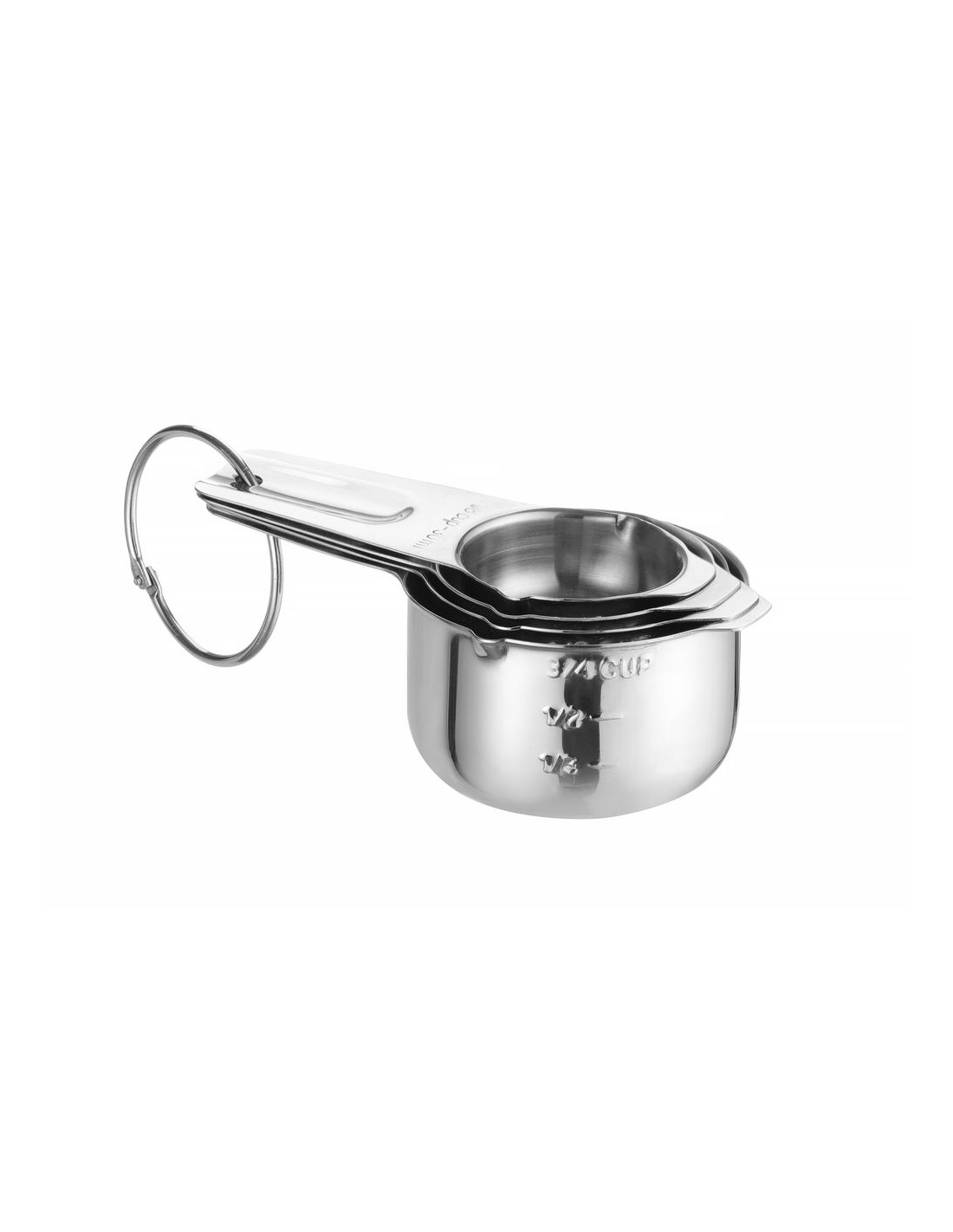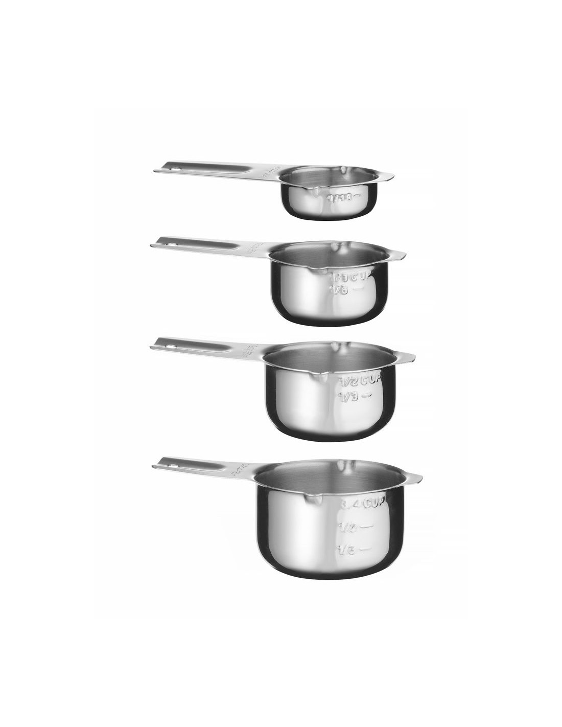 Tillverkad av rostfritt stål. Platt botten för att säkerställa stabilitet och förhindra att koppen välter. 2 pipar på varje kopp för enkel upphällning av innehållet. Utrustad med ergonomiska handtag med öljetter. Graverade kapacitetsmarkeringar på 2 ställen – ingen nötning, väl synlig: – på sidan av koppen, kapacitet i den amerikanska enheten – koppar, – på handtaget, kapacitet i 2 enheter: koppar och milliliter. Kopparna är stapelbara – för att spara förvaringsutrymme. Diskmaskinssäker.