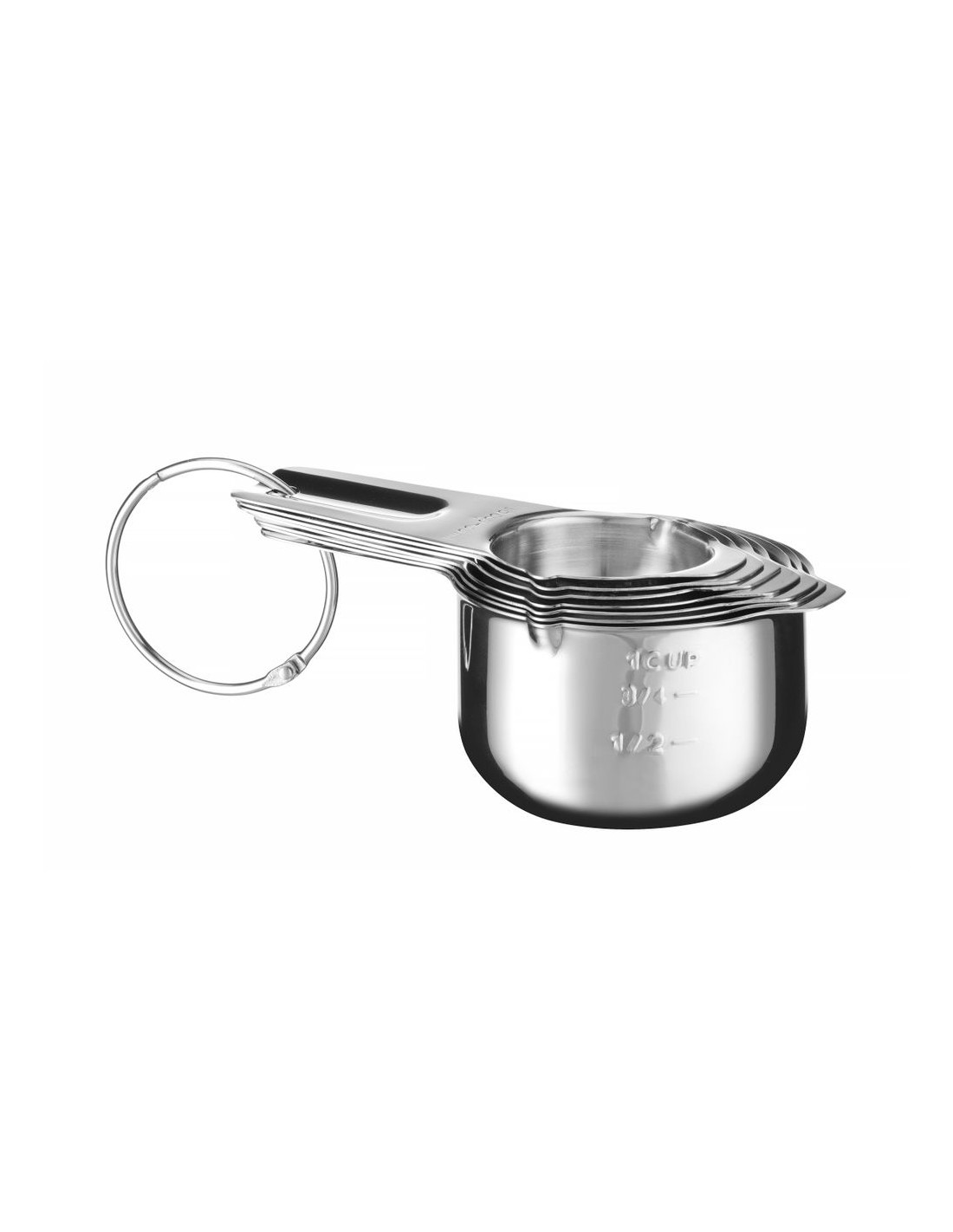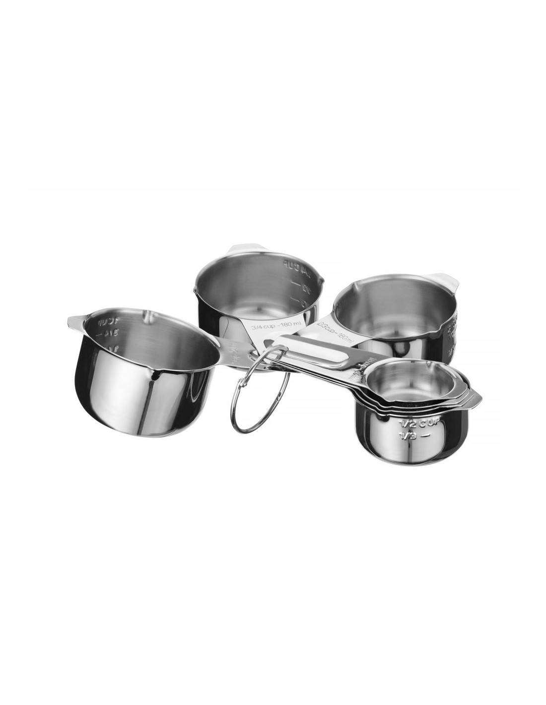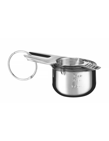 Tillverkad av rostfritt stål. Platt botten för att säkerställa stabilitet och förhindra att koppen välter. 2 pipar på varje kopp för enkel upphällning av innehållet. Utrustad med ergonomiska handtag med öljetter. Graverade kapacitetsmarkeringar på 2 ställen – ingen nötning, väl synlig: – på sidan av koppen, kapacitet i den amerikanska enheten – koppar, – på handtaget, kapacitet i 2 enheter: koppar och milliliter. Kopparna är stapelbara – för att spara förvaringsutrymme. Diskmaskinssäker.