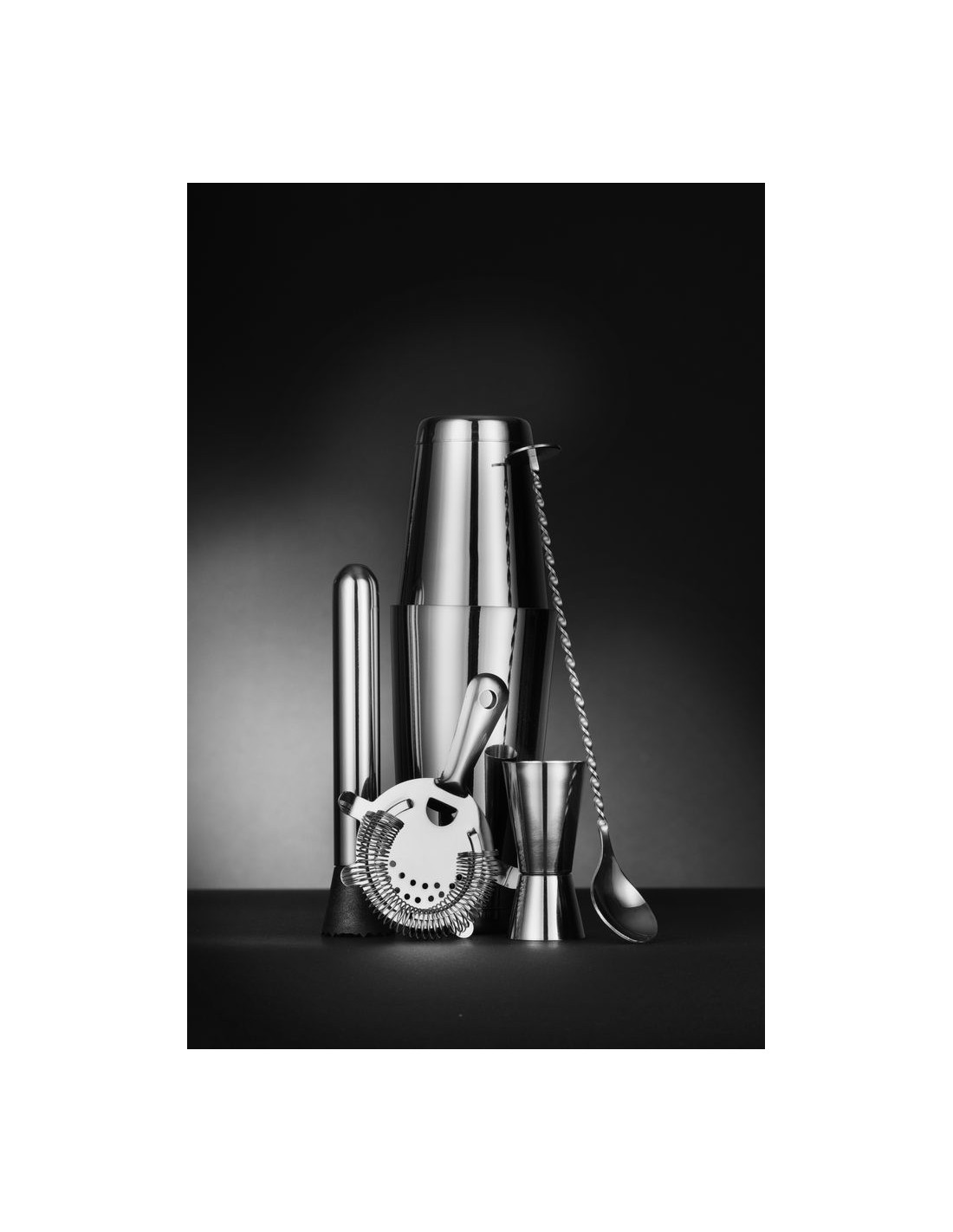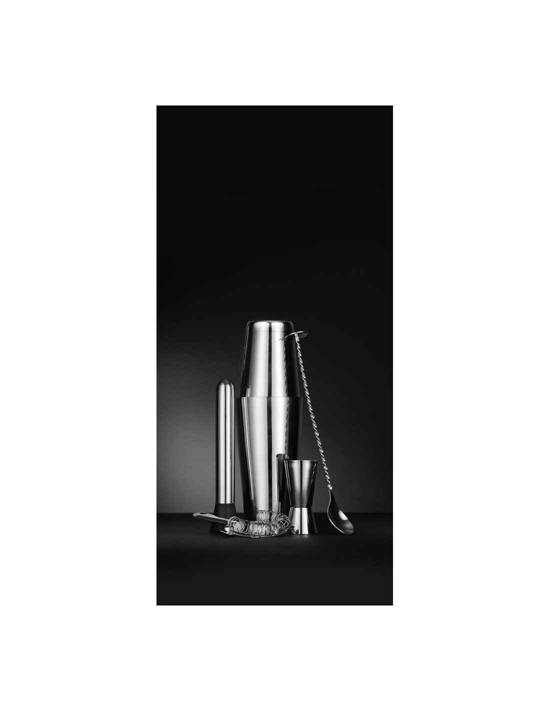 Består av 5 delar, tillverkade av rostfritt stål AISI 201. Muddlerspetsen är tillverkad av polyamid (PA). Tub tillverkad av tjock kartong. Boston shaker Tin-on-Tin: 2 viktade koppar, med volym 500 ml och 800 ml. Klassisk jigger med volym 50 ml och 25 ml. Hawthorne-sil: med ergonomiskt handtag och en avtagbar fjäder (för enkel rengöring, kan även användas som en "fjädervisp"). Passar perfekt till shakern, silar isbitar, frukt och örter noggrant. Muddler: med tandad yta för snabb mosning av frukt och örter. Spiralbartendingsked med längd 27 cm och 5 ml volym, med muddler (spetsen är skivformad): för snabb blandning av iskalla drycker utan att späda ut dem, hällning av läsk utan att bubbla och exakt skapande av lager på lager av cocktails. Skivmuddlaren kan också användas för att mosa frukt och örter. Setet levereras i ett kartongrör med elegant konstverk. Alla delar i setet tål maskindisk.