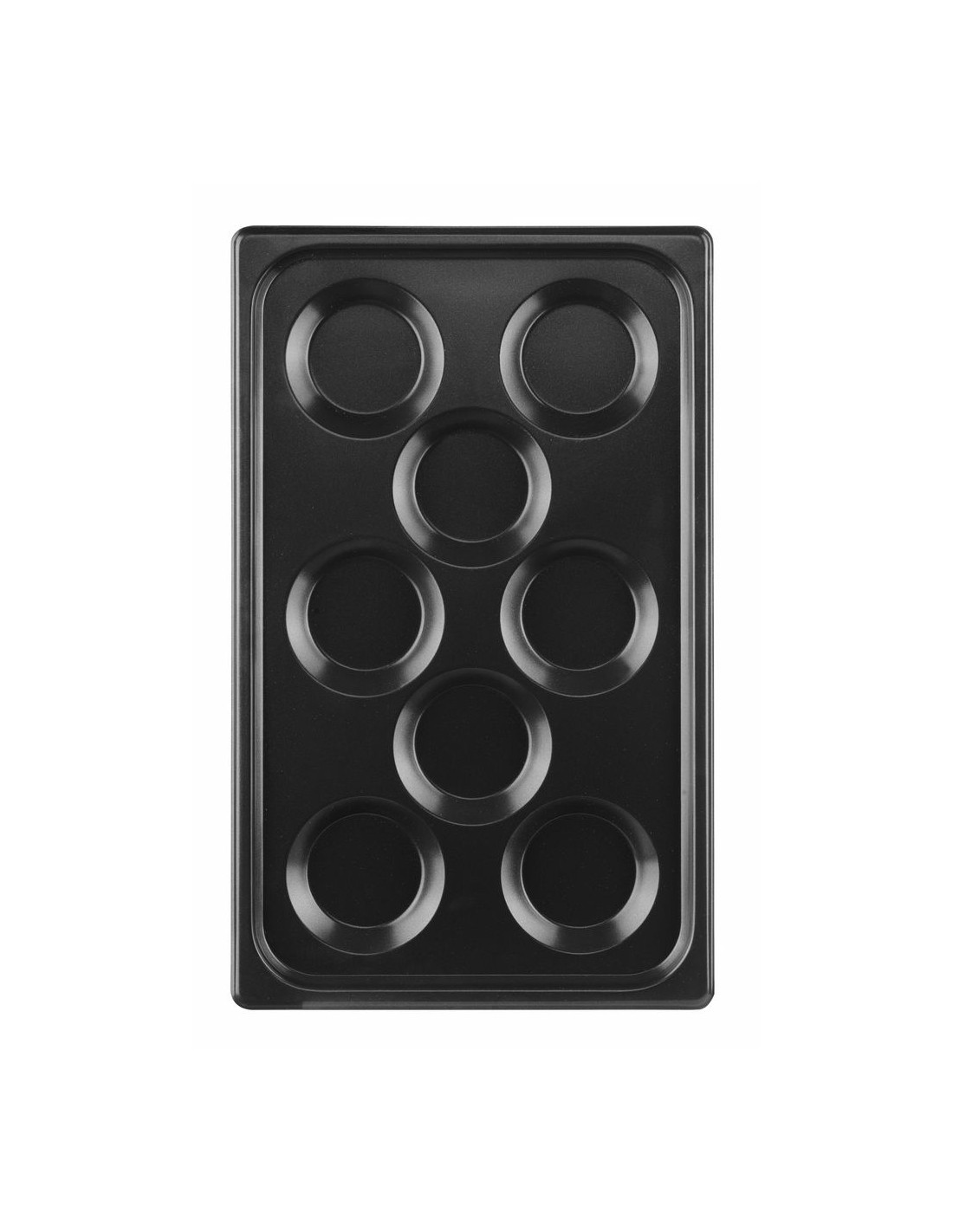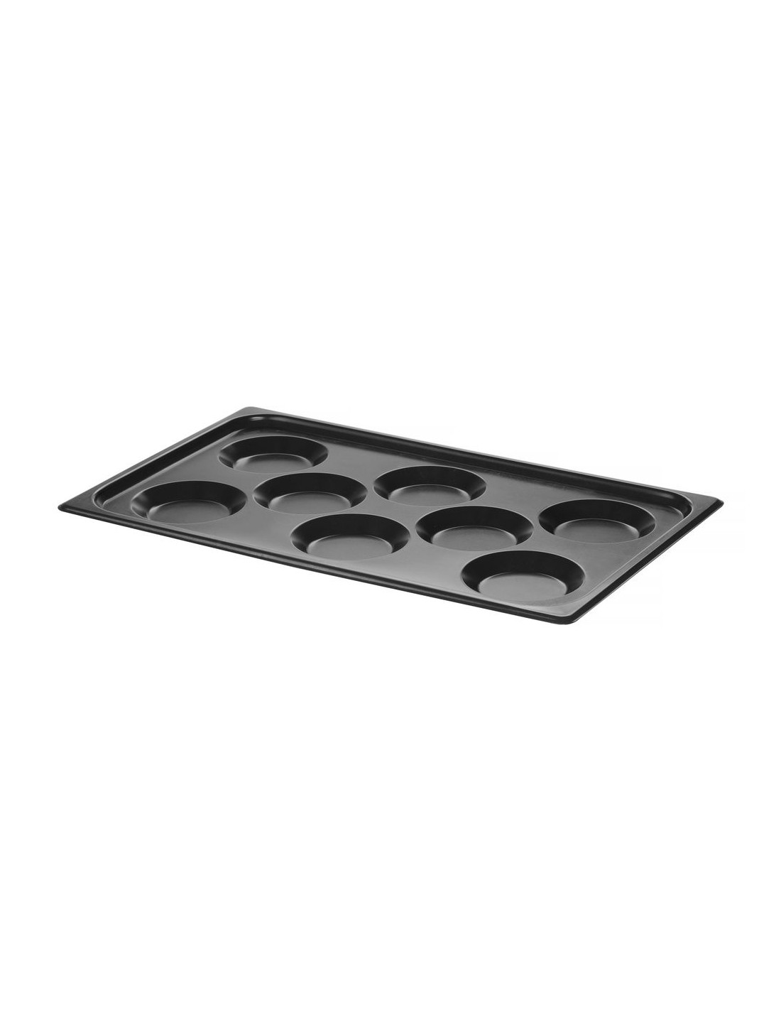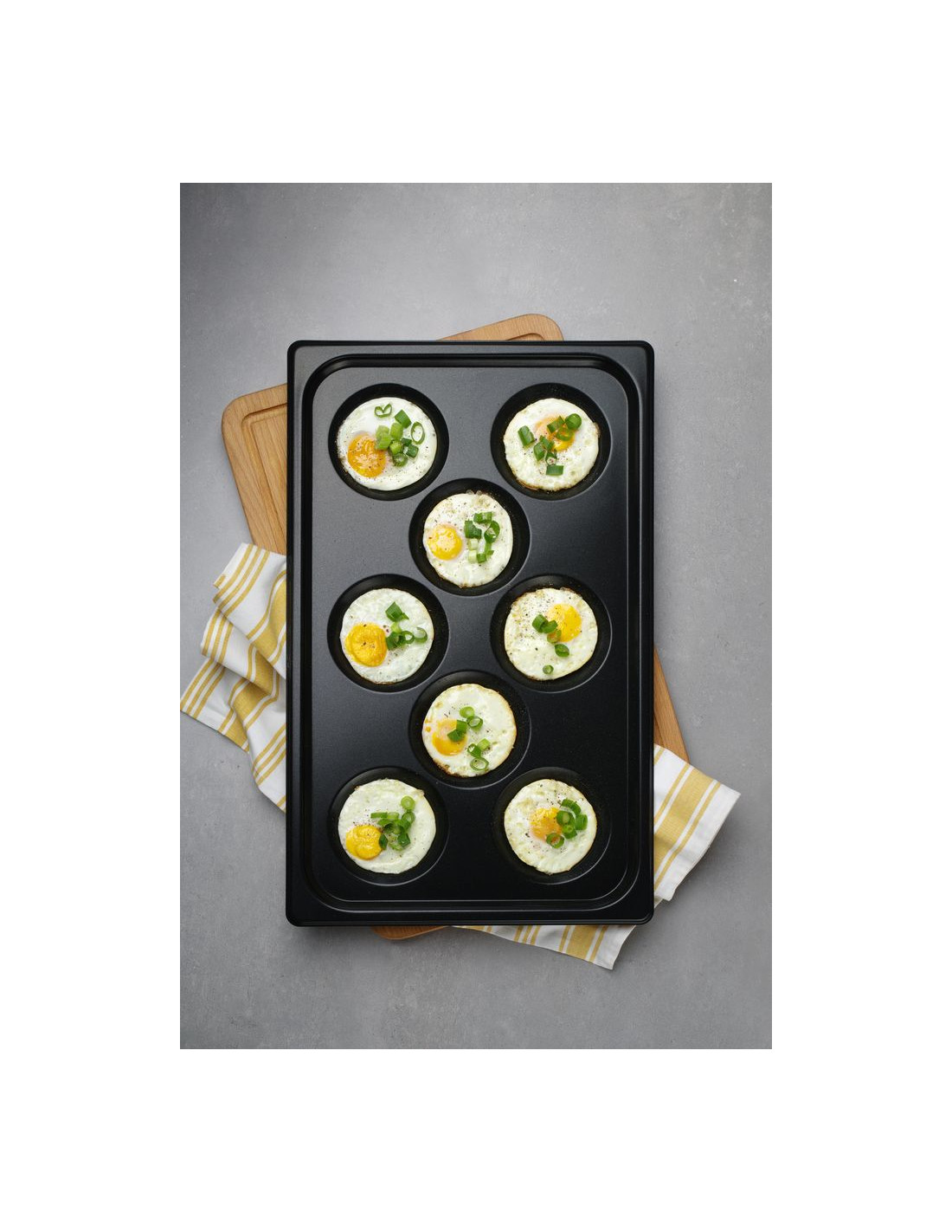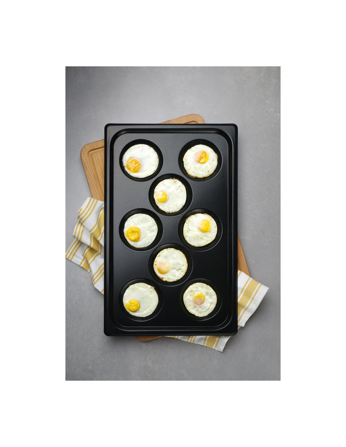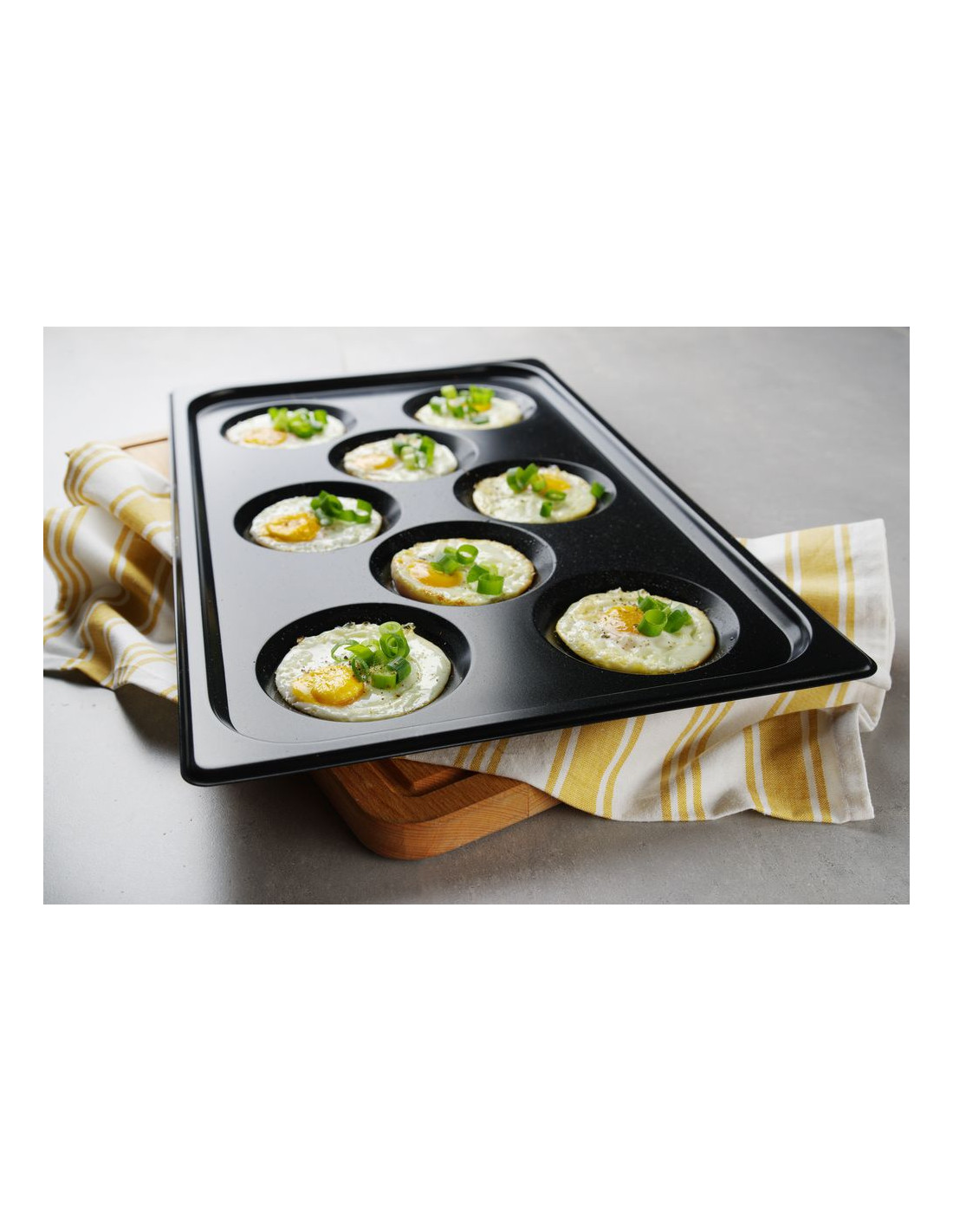 Tillverkad av rostfritt stål. Yta med non-stick PTFE-beläggning. Storlek: GN 1/1. Temperaturbeständighet: upp till 260 °C. 8 formar perfekta för stekta ägg, pannkakor, omeletter. Formarna mäter 11 cm upptill, 8 cm nedtill och är 2 cm djupa. Ej diskmaskinssäker.