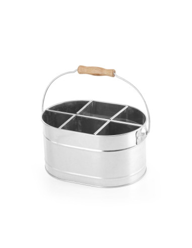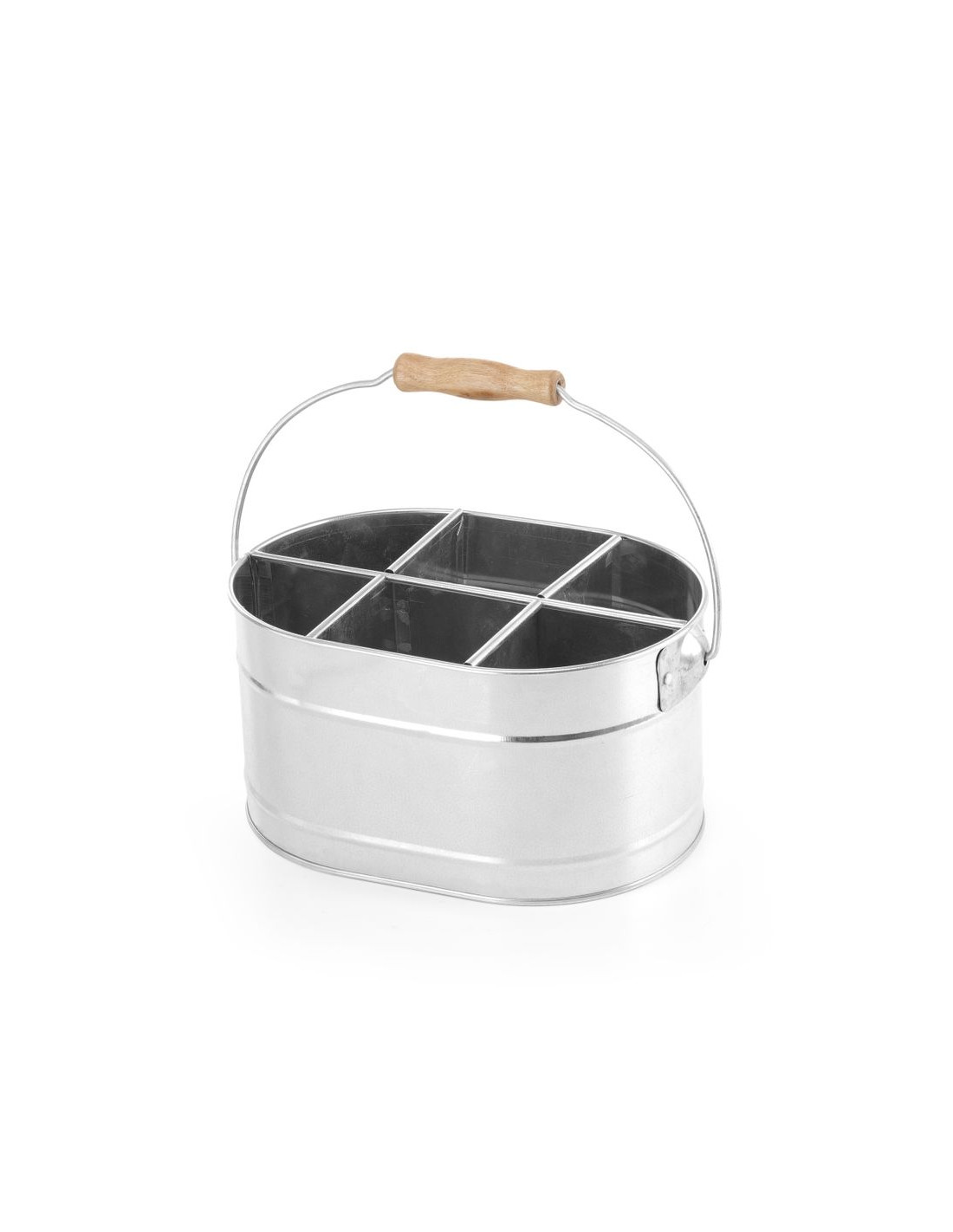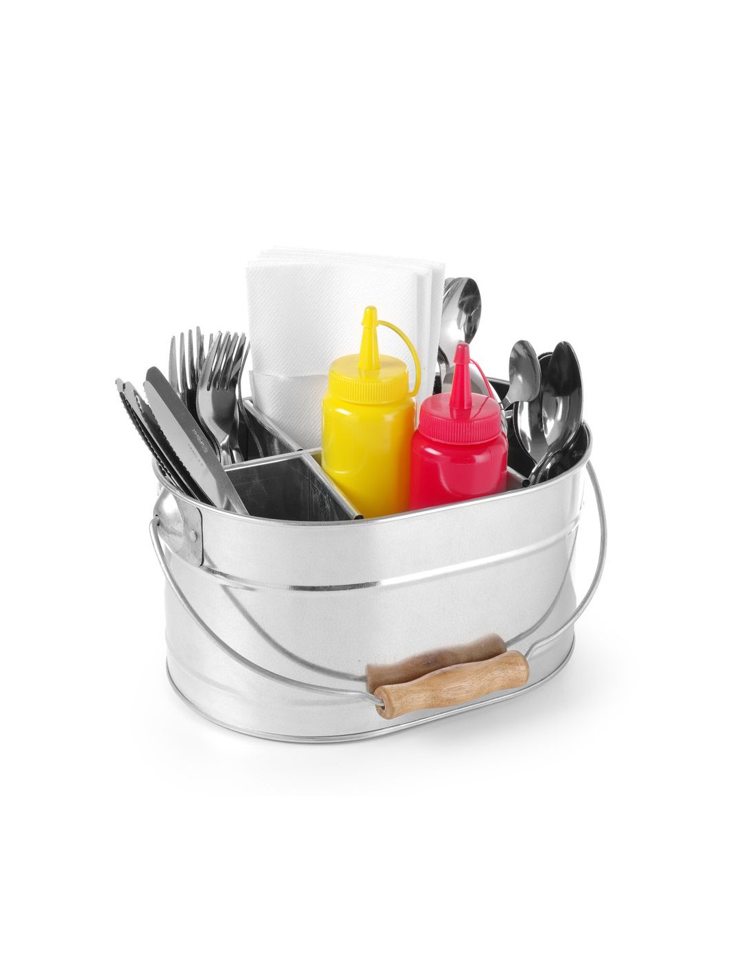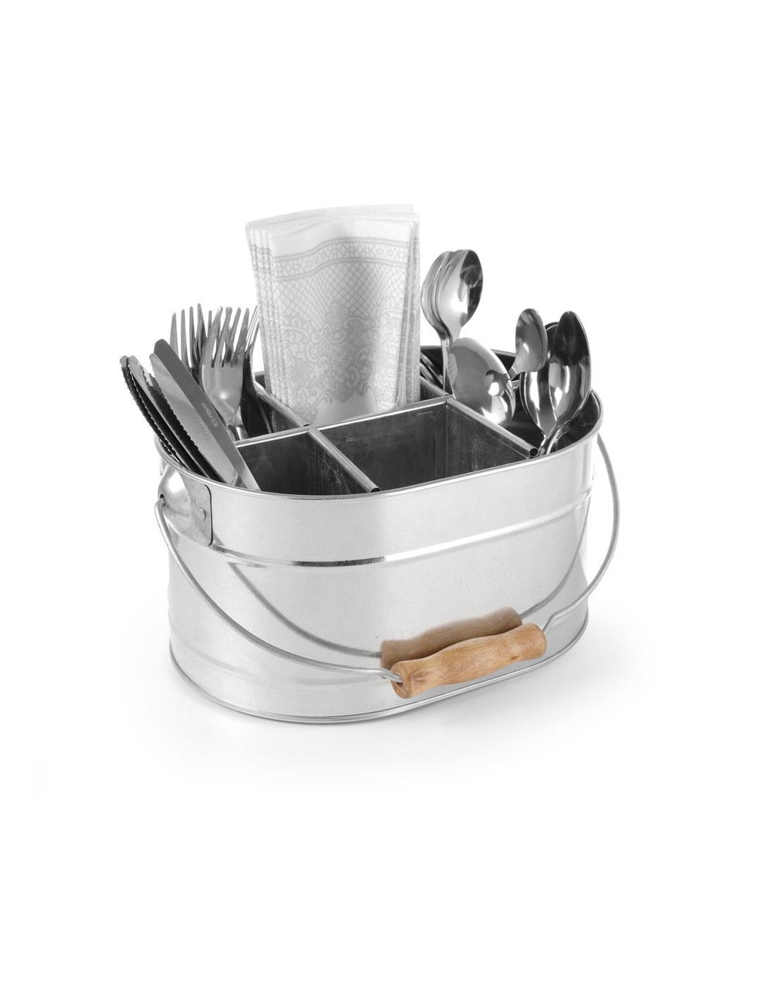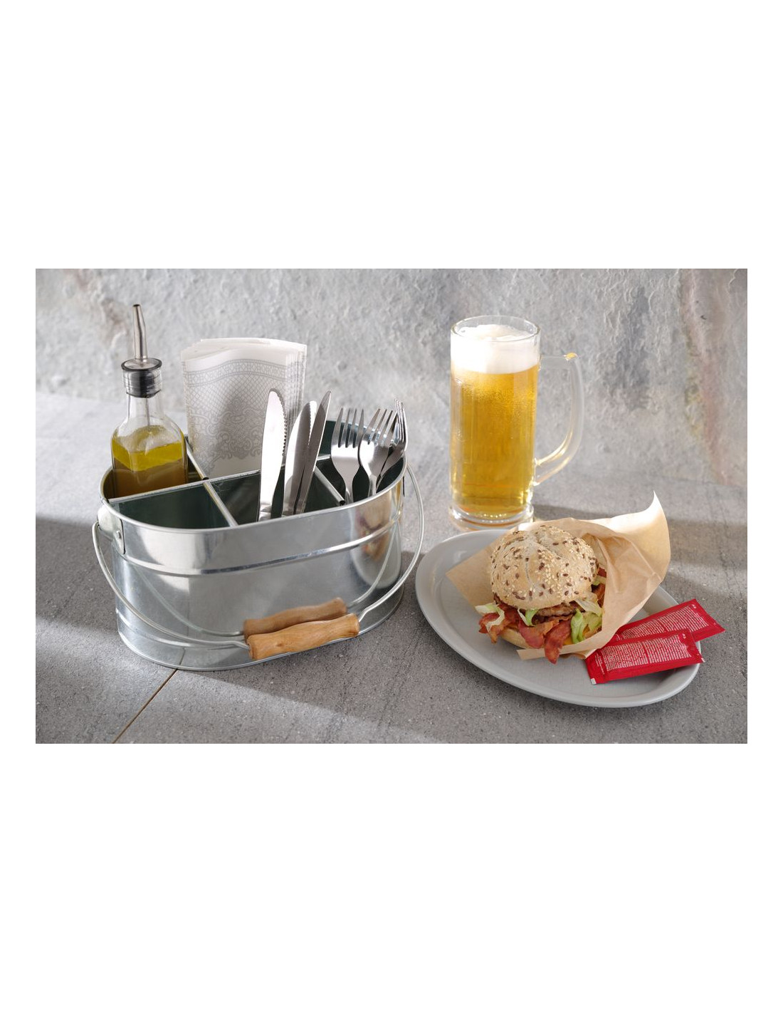 Tillverkad av galvaniserad stålplåt, vilket skapar ett rustikt utseende. Galvaniserat stål är inte avsett för kontakt med livsmedel, klä hinkarna med våra bakplåtspappersark när du använder dem för servering av mat.