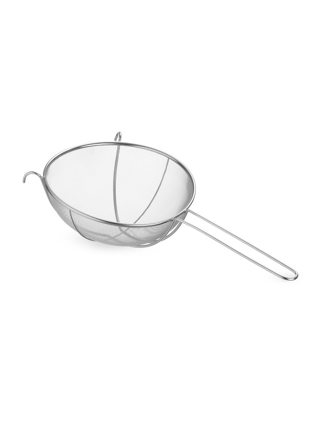 Tillverkad av rostfritt stål. Mycket fint nät, förstärkt. Med trådhandtag. Utrustad med extra stödhandtag för säker placering över en skål eller kastrull. Tål maskindisk.