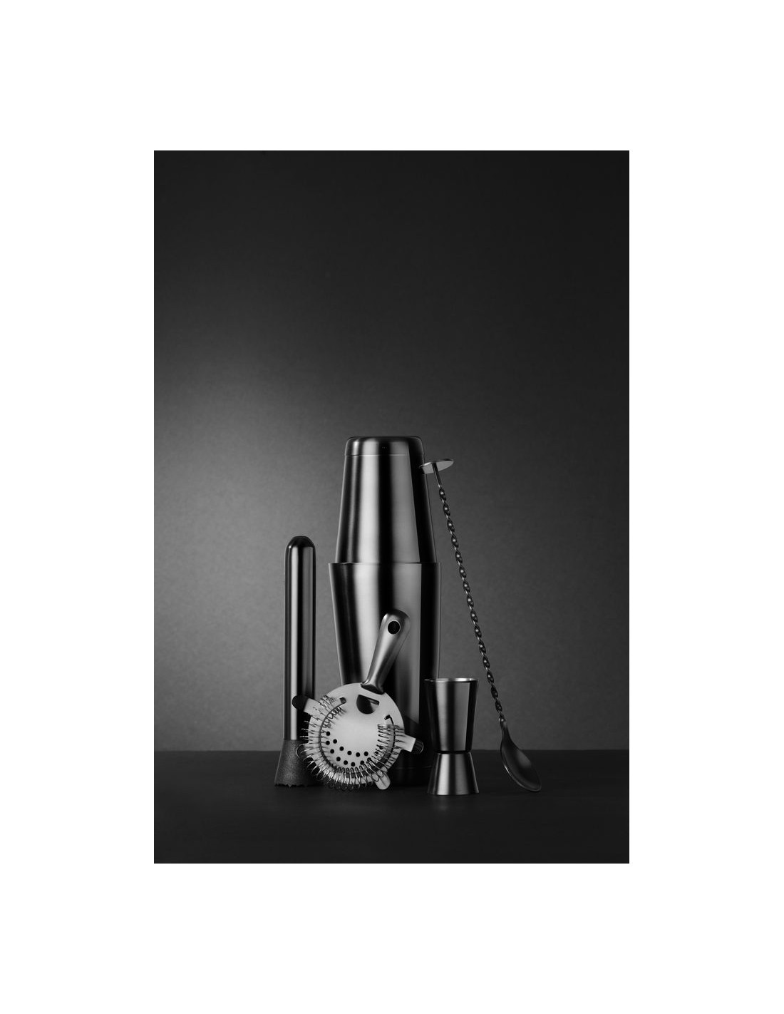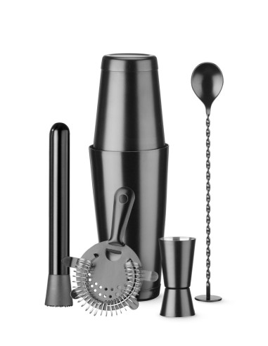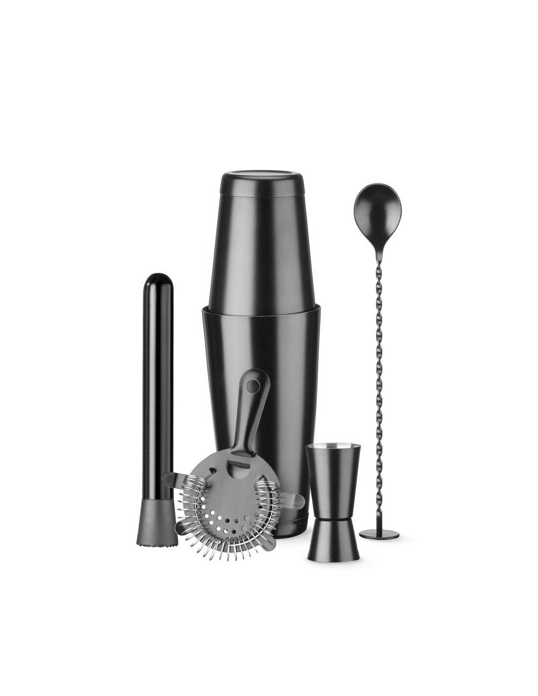 Tillverkad av rostfritt stål. Muddlerspetsen är tillverkad av polypropen (PP). Rör tillverkat av tjock kartong. Boston shaker Tin-on-Tin: 2 viktade koppar, med volym 500 ml och 800 ml. Klassisk jigger med volym 50 ml och 25 ml. Hawthorne-sil: med ergonomiskt handtag och en avtagbar fjäder (för enkel rengöring, kan även användas som en "fjädervisp"). Passar perfekt till shakern, silar isbitar, frukt och örter noggrant. Muddler: med tandad yta för enkel mosning av frukt och örter. Spiralbartendersked med 27 cm längd och 5 ml kapacitet, med en muddler (spetsen är skivformad): för att snabbt blanda iskalla drycker utan att späda ut dem, hälla upp läsk utan att det bubblar och skapa lager på lager av cocktails. Skivan - muddlern kan också användas för att mosa frukt och örter. Setet levereras i ett kartongrör med elegant konstverk. Delar av setet tål inte diskmaskin.