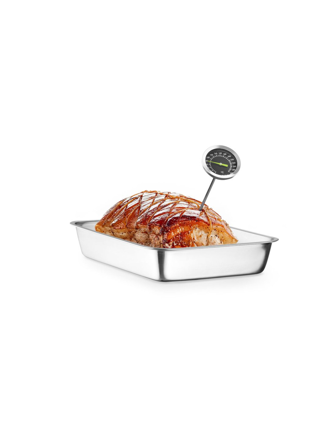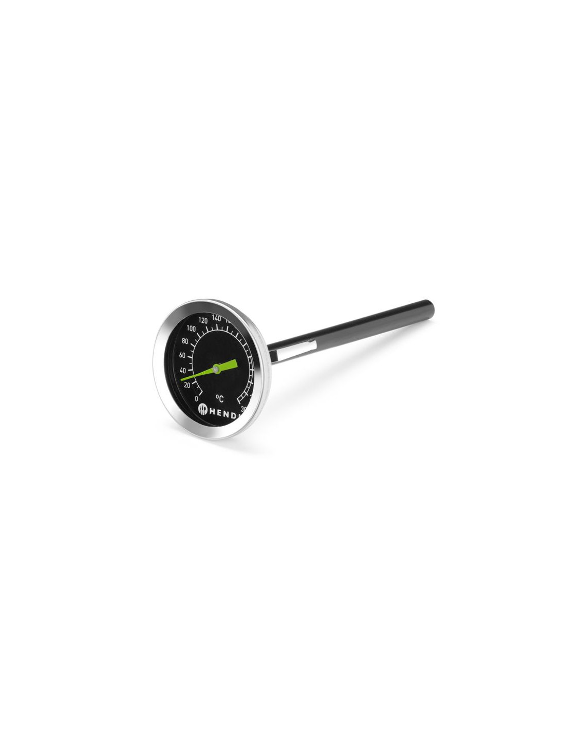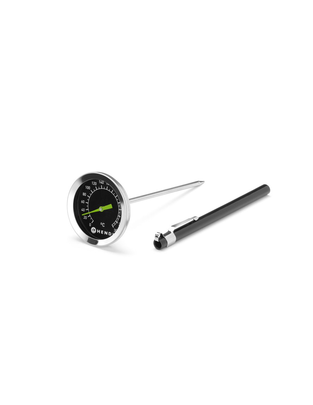 Den analoga HENDI-termometern ger temperaturavläsningar från 0 °C till 300 °C, vilket gör den idealisk för professionella kök. Dess rostfria stålprob garanterar hållbarhet, medan det medföljande locket med metallklämma möjliggör säker och bekväm förvaring. Den är utformad för noggrannhet och användarvänlighet och är ett pålitligt verktyg för kockar och matproffs.