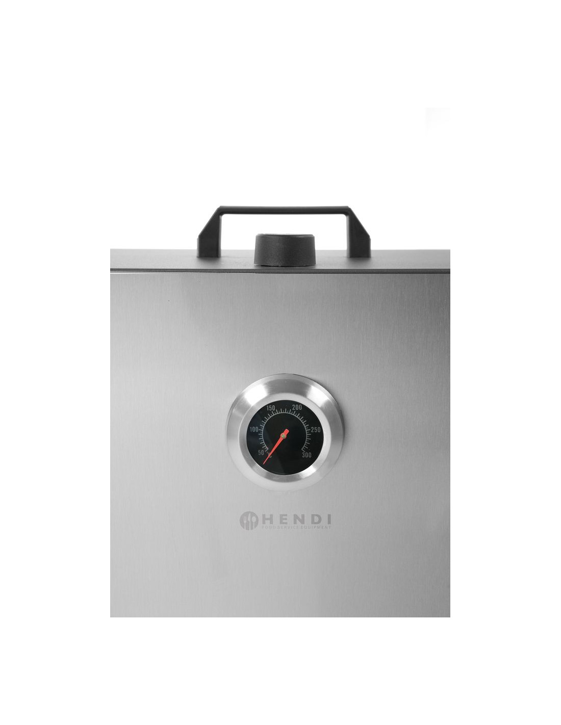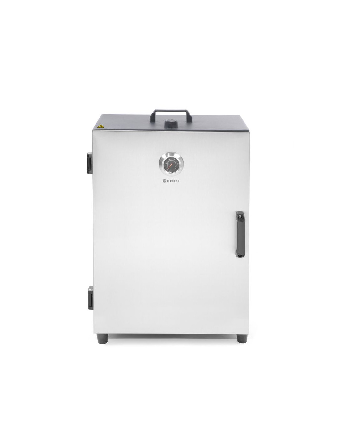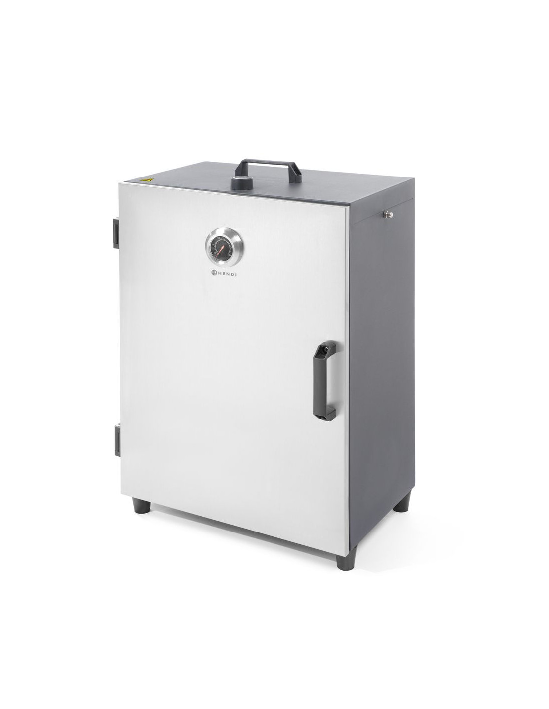 HENDI Rökugn Electric är tillverkad av slitstarkt rostfritt stål, har en magnetiskt stängande, dubbelisolerad dörr med en integrerad termometer och justerbar termostat för exakt temperaturkontroll. Ugnen är utrustad med en bakre varmluftsventil för att optimera rökcirkulationen och levereras med tre galler och 3 köttkrokar för att stödja varierande rökbehov i professionella kök.