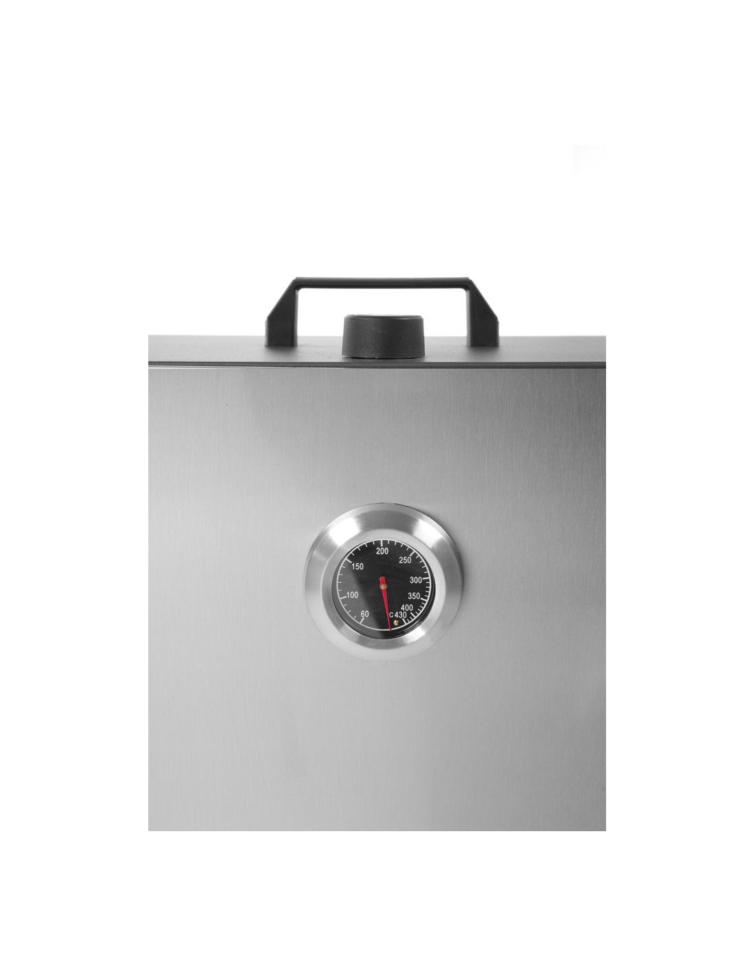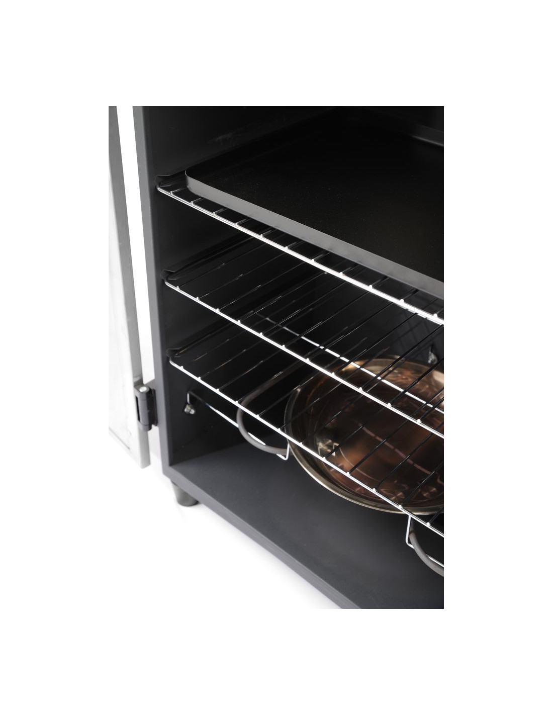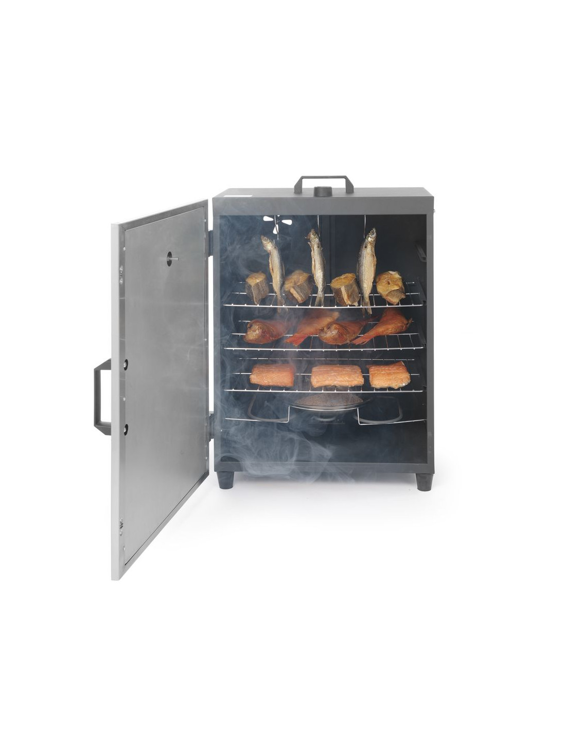 Rökugnen är idealisk för rökning av en mängd olika livsmedel som fisk, nötkött, skinka och grönsaker. Tillverkad av rostfritt stål, med en magnetiskt stängande dubbelisolerad dörr. Temperaturjusterbar med termostat, termometer integrerad i dörren. Utrustad med varmluftsventil på baksidan. Levereras med 3 galler (400x279 mm) och 3 köttkrokar.