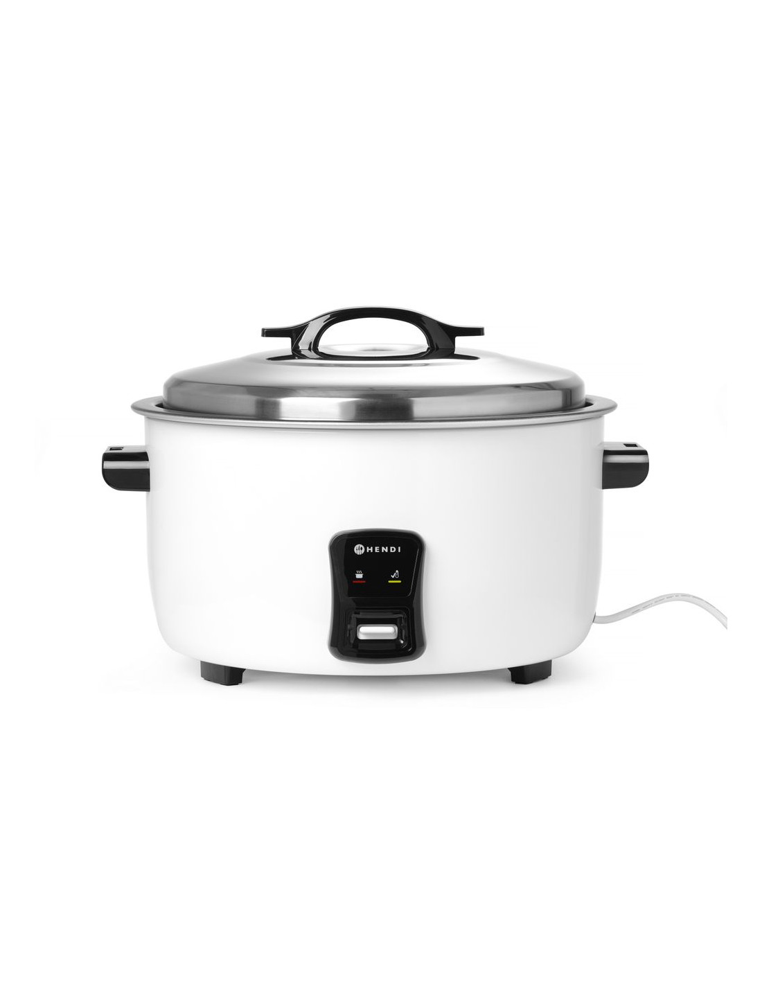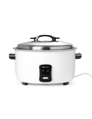 Höljet är tillverkat av valsat stål, målat i vitt, lätt att rengöra. Innergrytan är tillverkad av aluminium med non-stick-beläggning, lätt att rengöra. Locket i rostfritt stål med vridlås är försett med ett handtag som svalnar. Handtagen har en speciell design som gör att de kan fungera som lockhållare, förvara ett varmt lock säkert och alltid ha locket till hands. Handtag och ben är tillverkade av värmefri, hållbar polypropen. Två driftslägen - tillagning och varmhållning; efter tillagning går apparaten in i varmhållningsläge. Kapacitet: 50 skopor torrt ris (≈100 portioner kokt ris). Ingår: rismått och sked. Nettovikt: 10,35 kg.