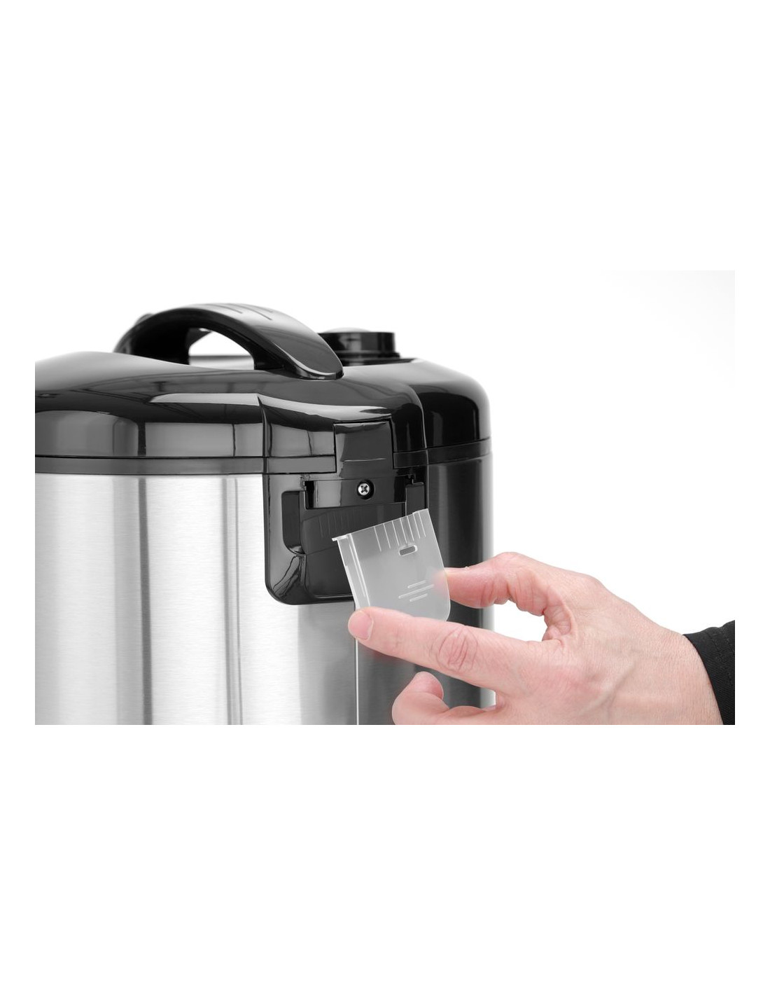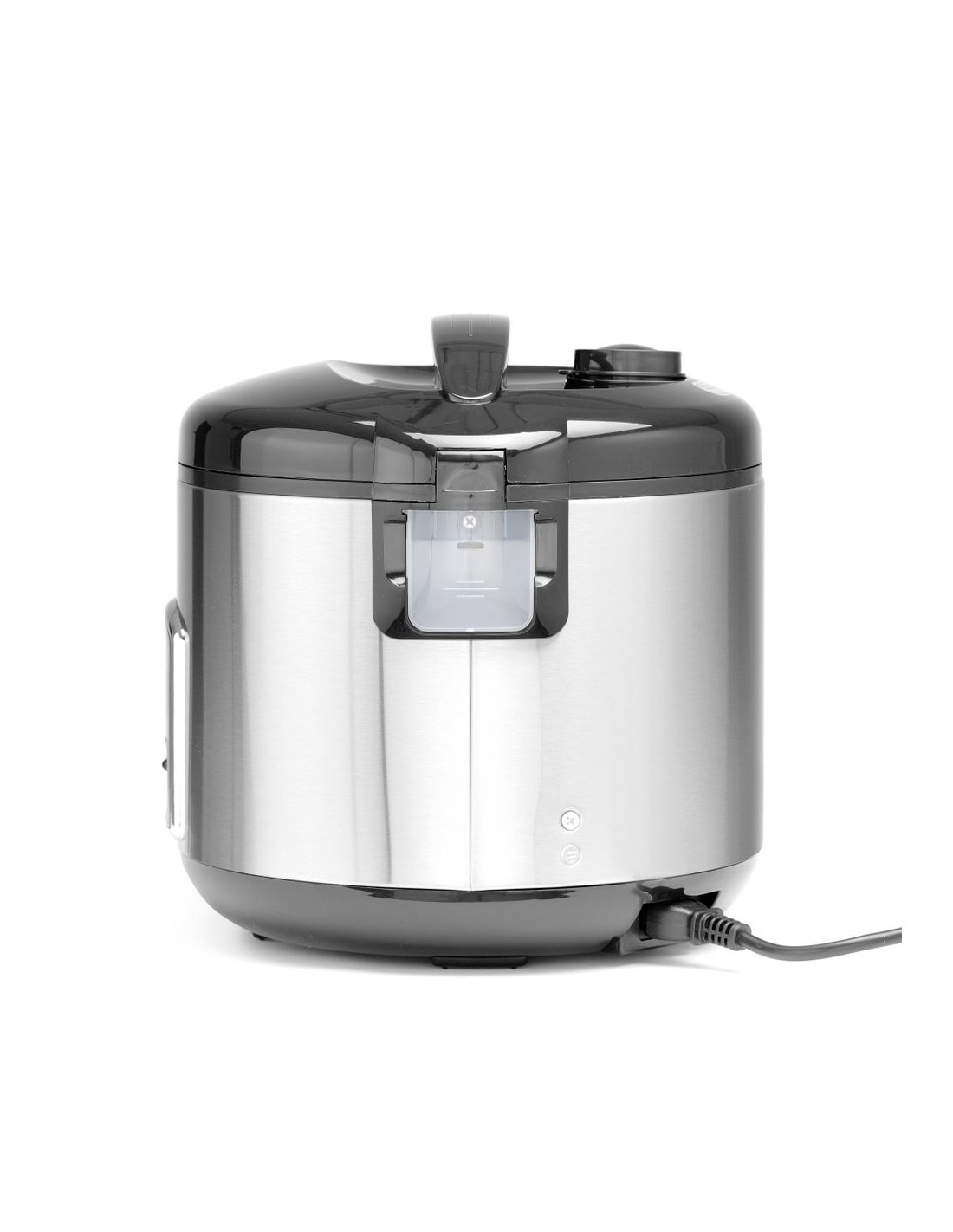 Höljet är tillverkat av rostfritt stål. Avtagbar innerkruka av aluminium med non-stick-beläggning, lätt att rengöra. Det gångjärnsförsedda locket av polypropen är utrustat med ett praktiskt handtag, lufttät packning och avluftningsventil. Locket stängs ordentligt tack vare den integrerade spärren. Integrerad kondensuppsamlare förhindrar att arbetsplatsen blir blöt. 2 driftslägen - tillagning och varmhållning; efter tillagning går apparaten in i varmhållningsläge. Kan även användas för att ångkoka grönsaker med den medföljande ångkorgen. Kapacitet: 10 skopor torrt ris (15-20 portioner kokt ris). Ingår: ångkorg, rismått och sked.