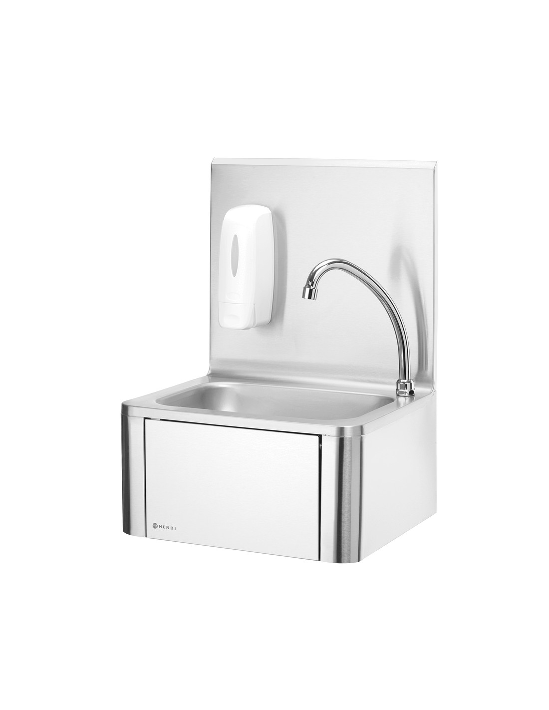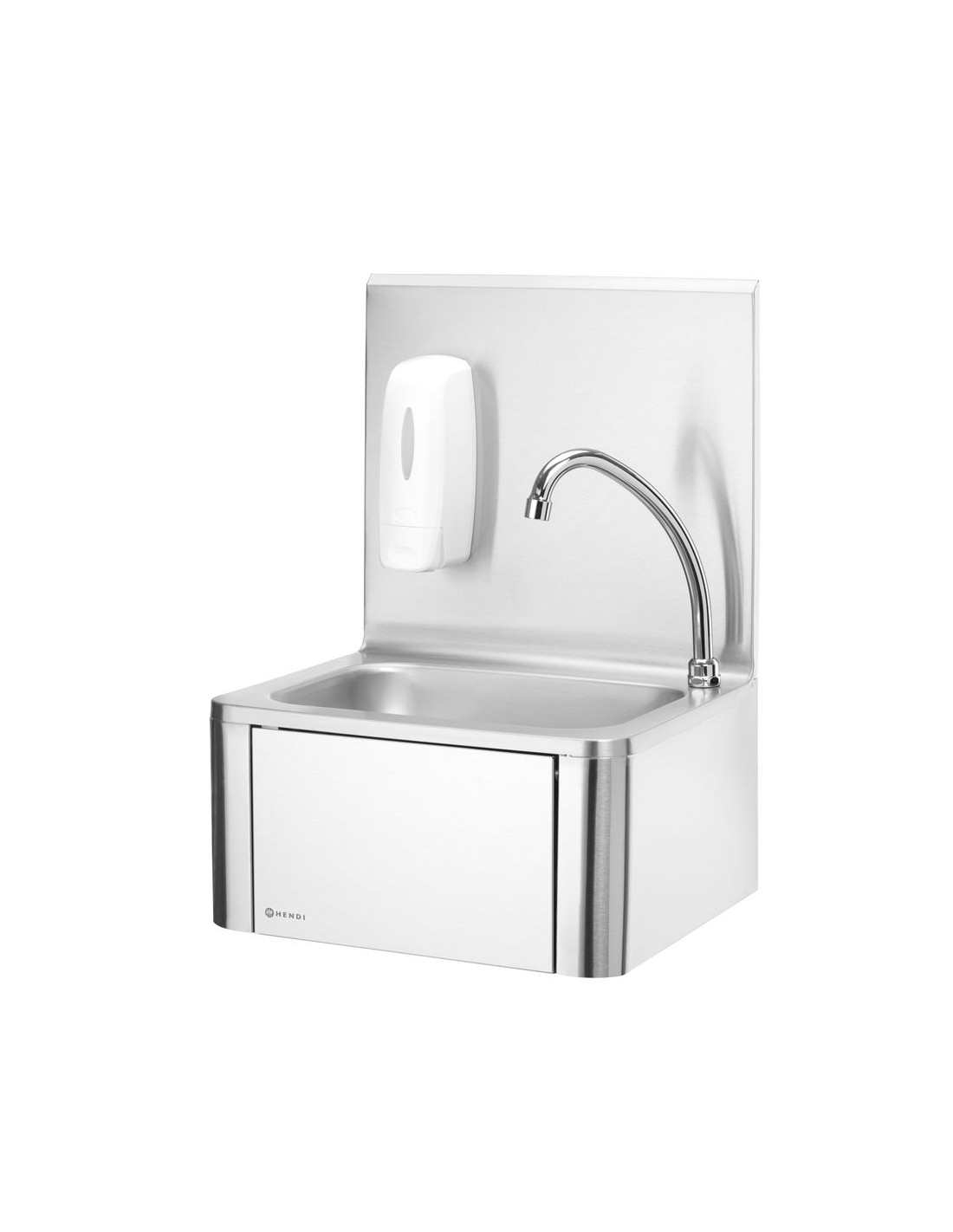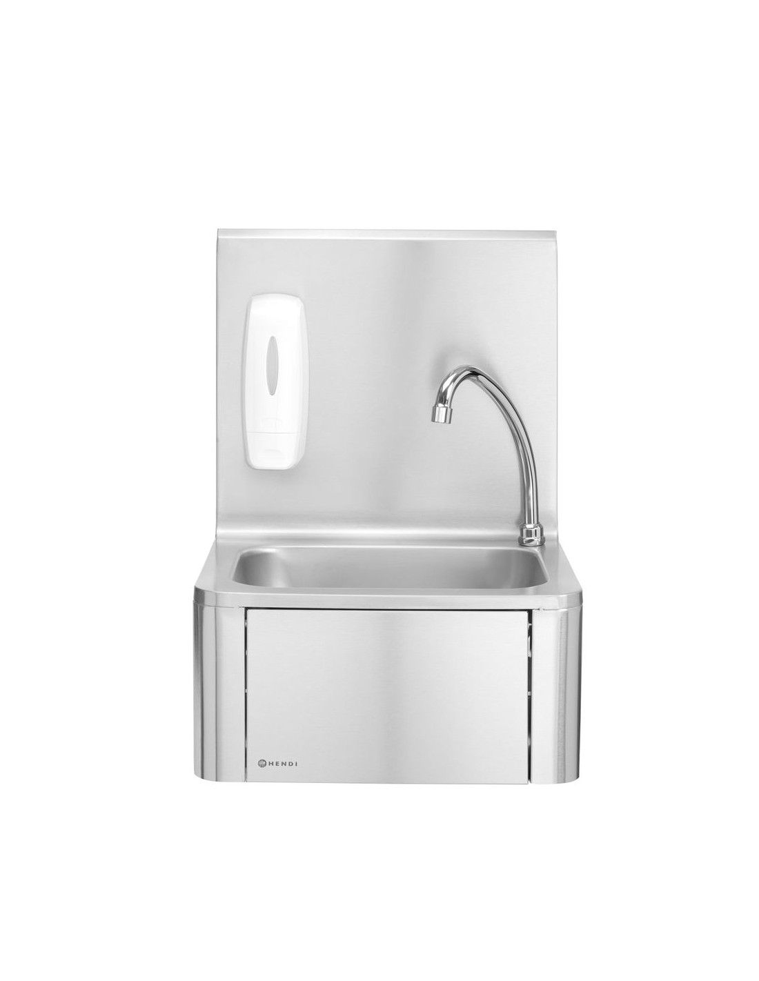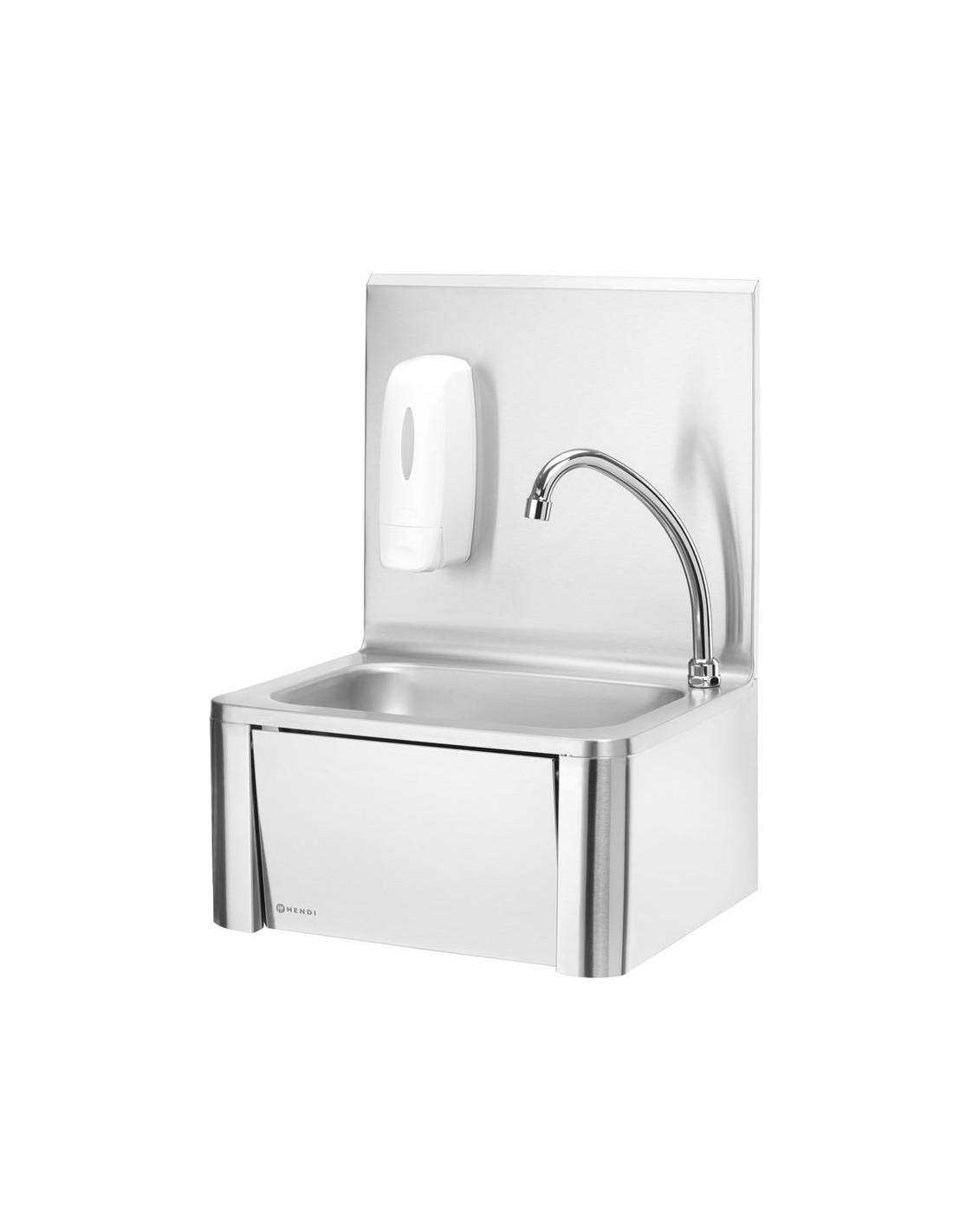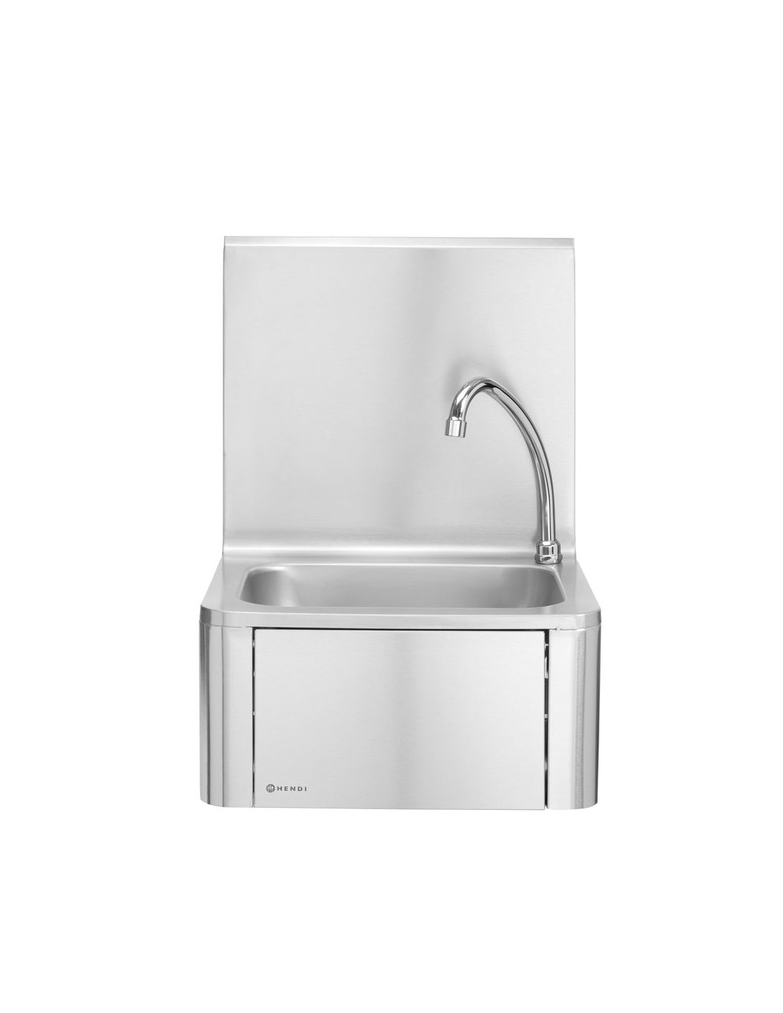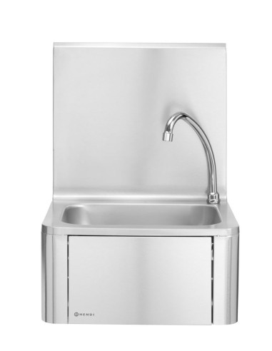 Slå på vattnet på ett hygieniskt sätt genom att helt enkelt trycka knät mot frontpanelen. Utrustad med varm- och kallvattenblandare som är placerad under frontpanelen. Handfat och stänkskydd tillverkade av rostfritt stål 18/8. Levereras med pip och tvålpump. Frontpanelens mått: 284x(H)183 mm. Diskbänkens mått: 335x235x(H)114 mm. Vattenanslutning: 1/2”, avloppshål Ø 50 mm.