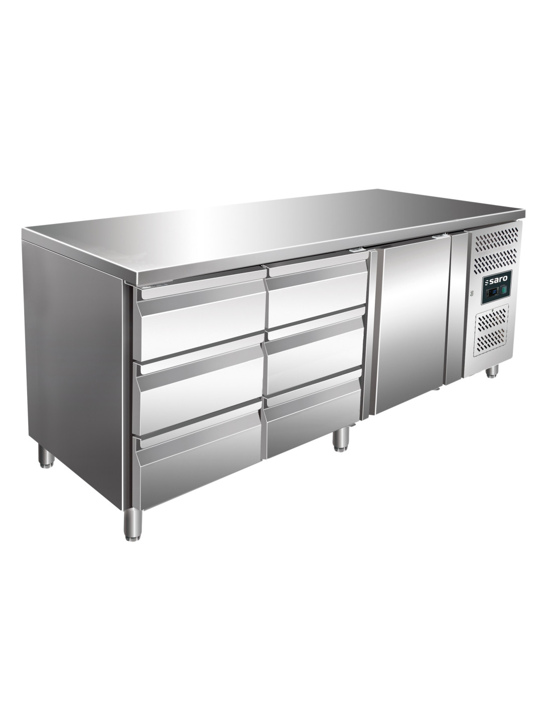 Material: (hölje och insida) rostfritt stål; (arbetsbänk) rostfritt stål