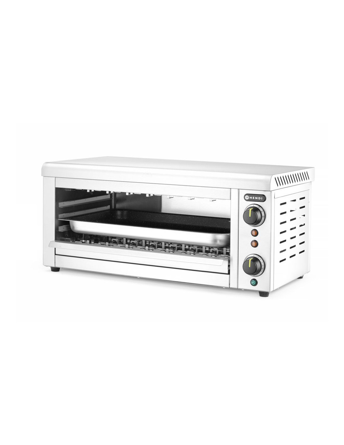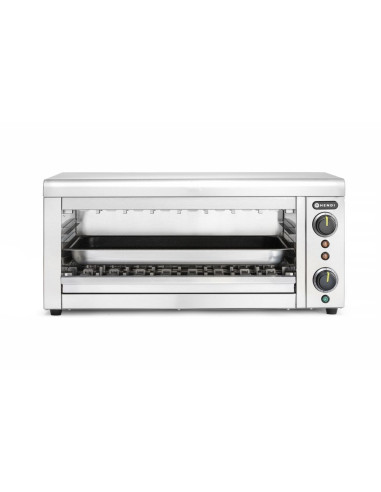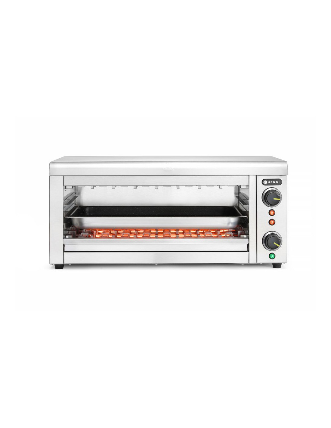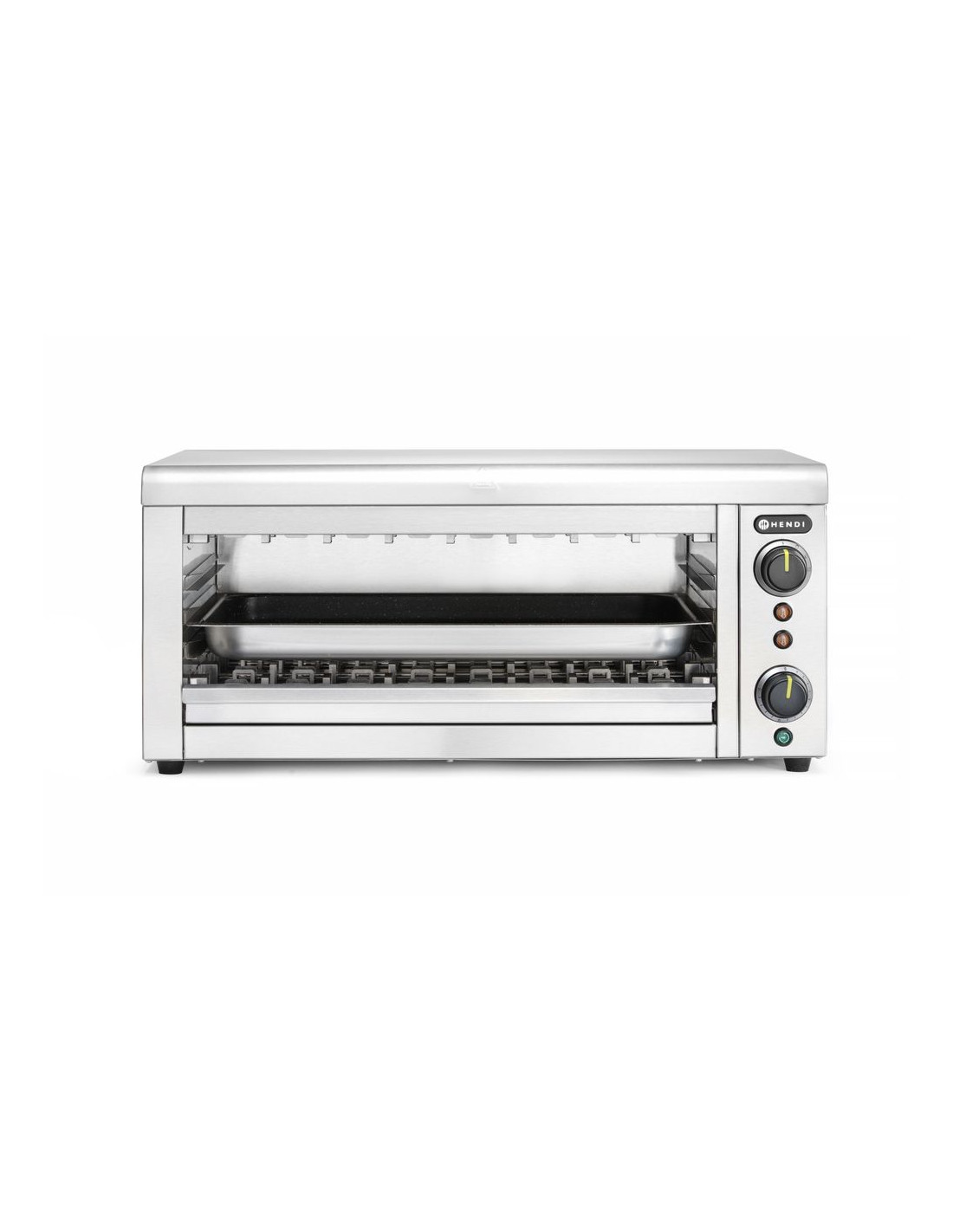 Det är möjligt att placera GN1/1-formar i ugnskammaren. Perfekt för grillning eller uppvärmning av rätter eller smörgåsar. Med infrarött kvartsvärmeelement uppe och nere. Utrustad med 15 minuters timer och indikatorlampa. 3 möjliga gallerhöjder, gallerhandtag försedda med värmesköld. Med smulbricka. Uppfyller IPX3-normen.
