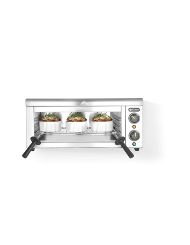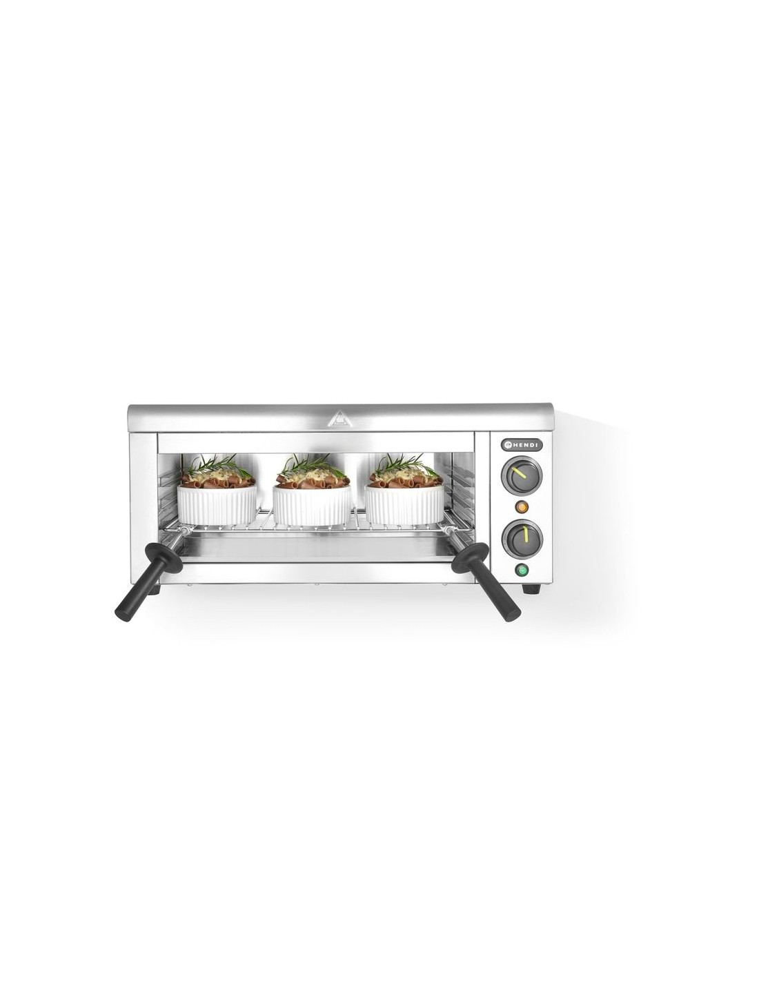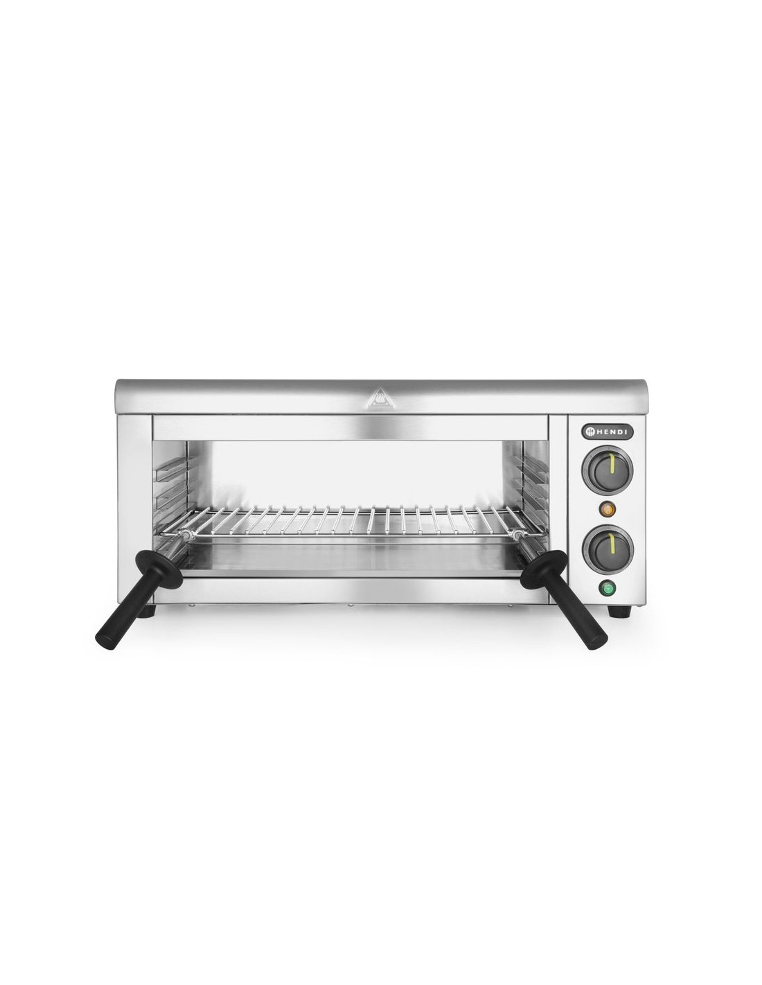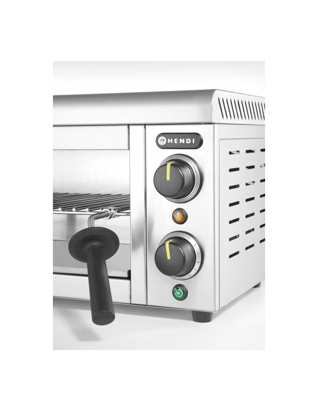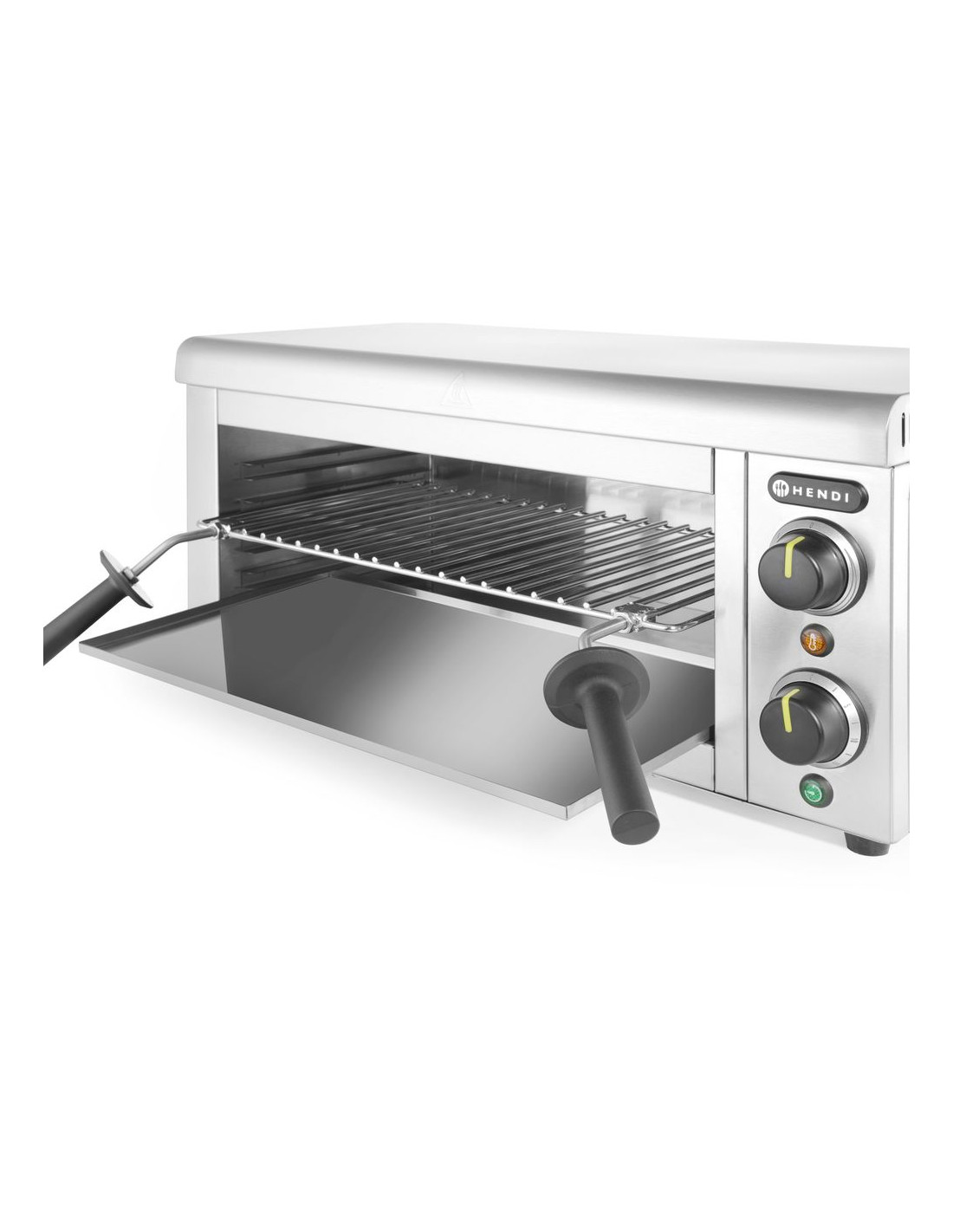 Uppfyller IPX4-normen – fullt skydd mot fukt. Kan installeras mot väggen utan behov av ytterligare fästen, sparar plats i köket. Perfekt för grillning eller uppvärmning av rätter eller grytor. Steglös temperaturreglering: 50°-300°C. Med toppvärmeelement. Utrustad med termostat, 30 min. timer och en indikatorlampa. 4 möjliga gallerhöjder. Levereras med: gallerhandtag försedda med värmesköld, smulbricka. Innermått: 460x265x(H)165 mm. Kabellängd: 1,3 m. Tillverkad av rostfritt stål.