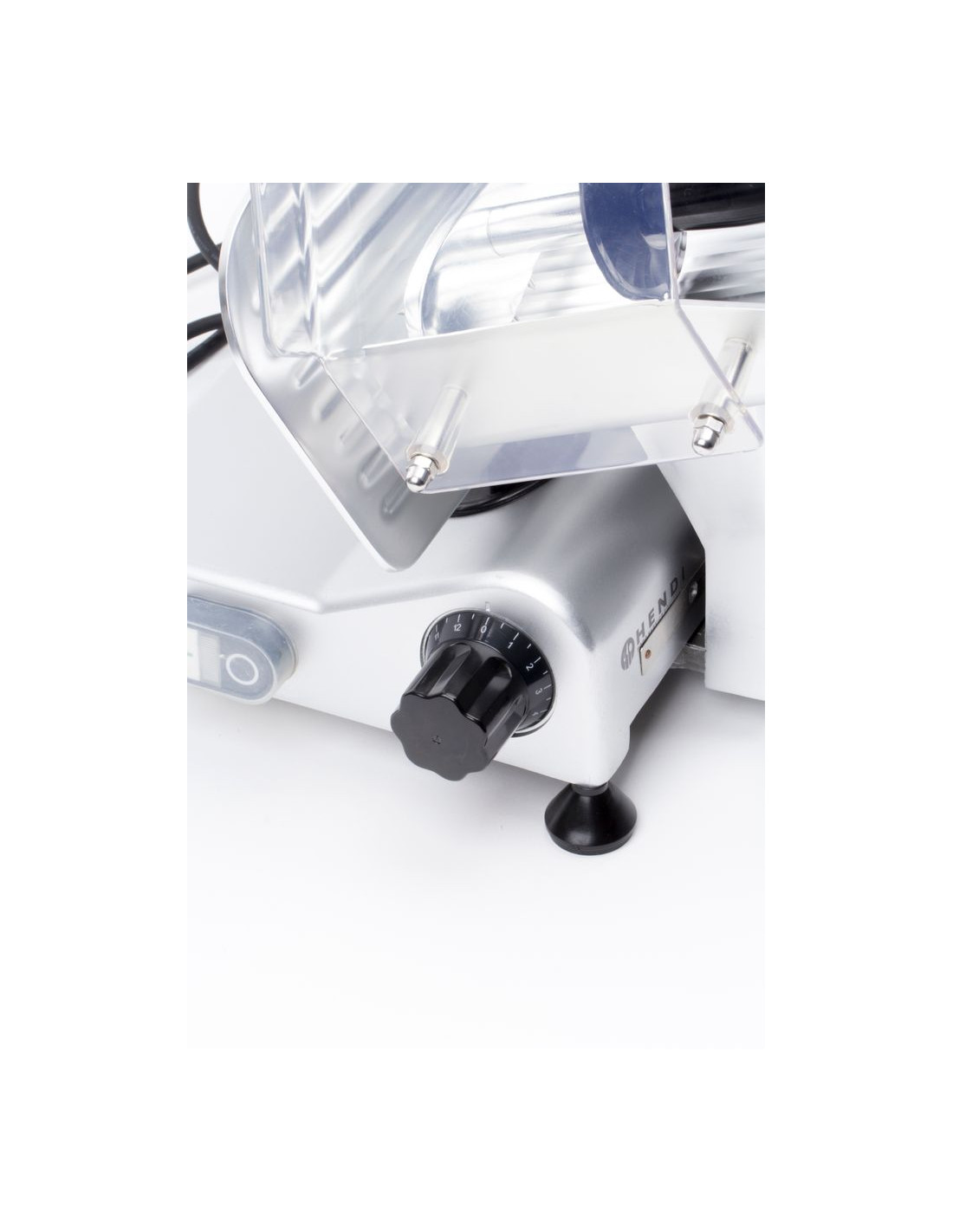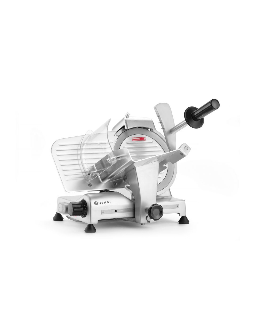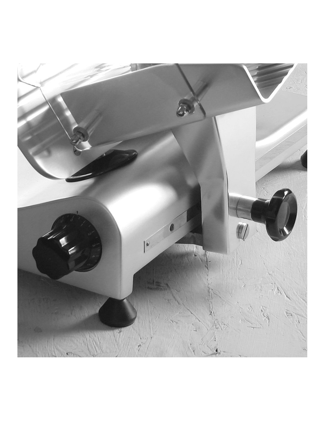 Hölje av belagd aluminium. Härdat rostfritt stålblad, vinklat. Luftkyld motor med överhettningsskydd. Kraftfull motor för att skära tufft kött. Utrustad med bladskydd och inbyggd slipmaskin. Vagn med säkerhetsskydd, klämelement och vertikal låsanordning. Snabb och enkel demontering för enkel rengöring. Uppfyller alla säkerhetskrav för utrustning för professionellt bruk, dvs: – genom att ställa in vredet på "0" skärtjocklek håller bladet sig bakom skyddet. – skydd mot oönskad start om slipmaskinen eller bladskyddet tas bort. – möjlighet att låsa och ta bort vagnen endast med bladet inställt i "0" skärtjockleksläge. Ej lämplig för att skära ost. Ostskivning möjlig med en separat tillgänglig non-stick kniv.