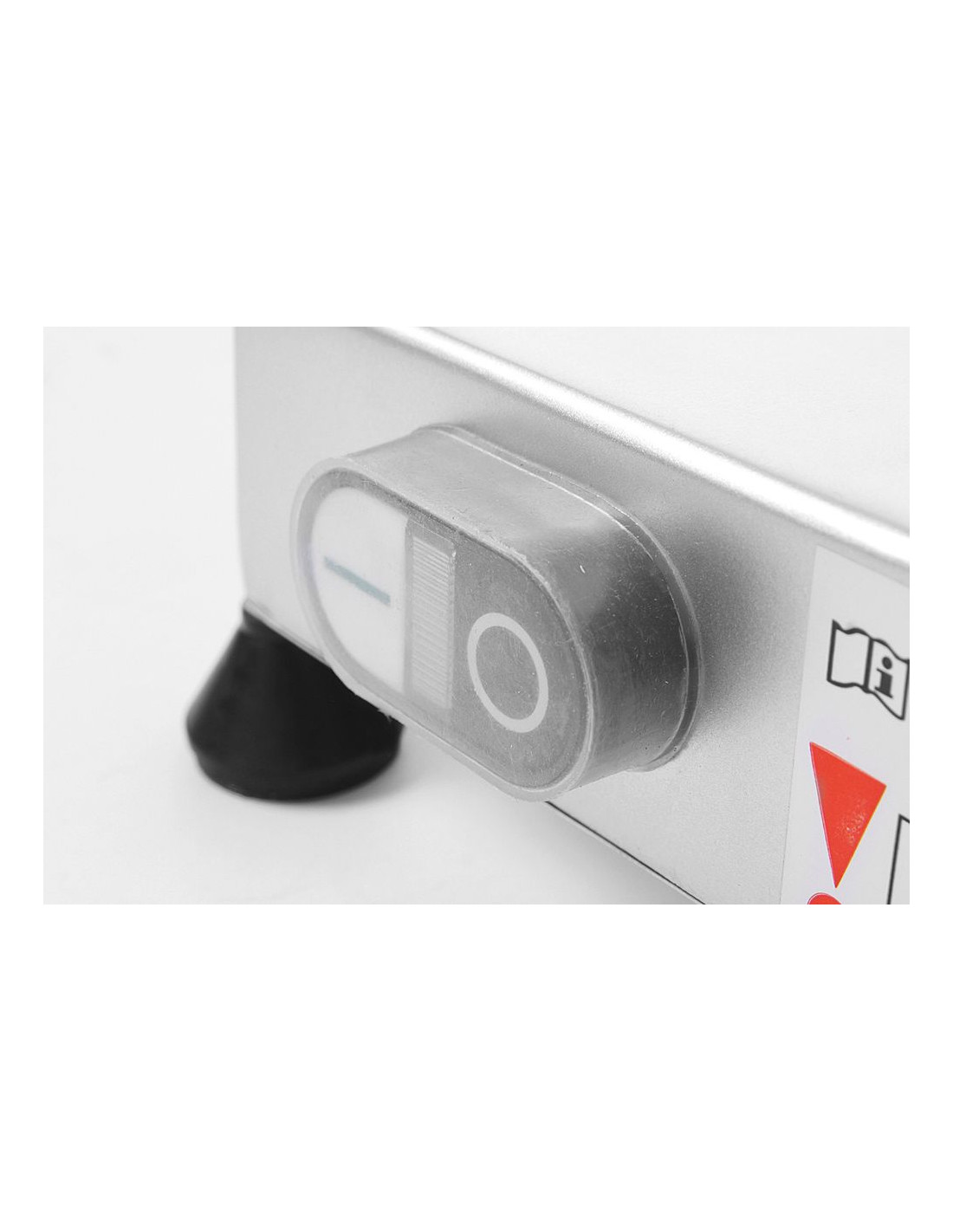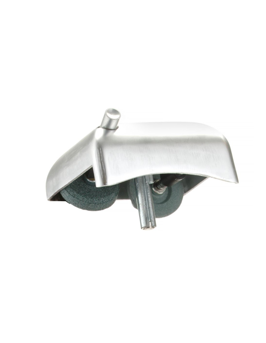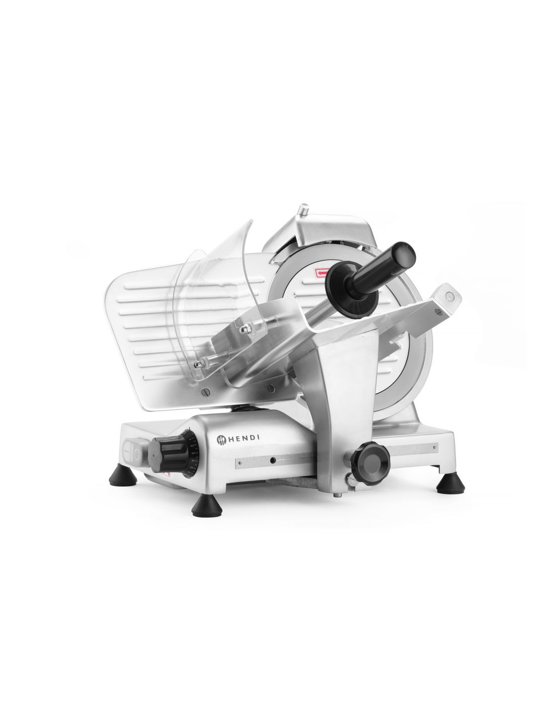 Hölje av belagd aluminium. Härdat rostfritt stålblad, vinklat. Luftkyld motor med överhettningsskydd. Kraftfull motor för att skära tufft kött. Utrustad med bladskydd och inbyggd slipmaskin. Vagn med säkerhetsskydd, klämelement och vertikal låsanordning. Snabb och enkel demontering för enkel rengöring. Uppfyller alla säkerhetskrav för utrustning för professionellt bruk, dvs: – genom att ställa in vredet på "0" skärtjocklek håller bladet sig bakom skyddet. – skydd mot oönskad start om slipmaskinen eller bladskyddet tas bort. – möjlighet att låsa och ta bort vagnen endast med bladet inställt i "0" skärtjockleksläge. Ej lämplig för att skära ost. Ostskivning möjlig med en separat tillgänglig non-stick kniv.