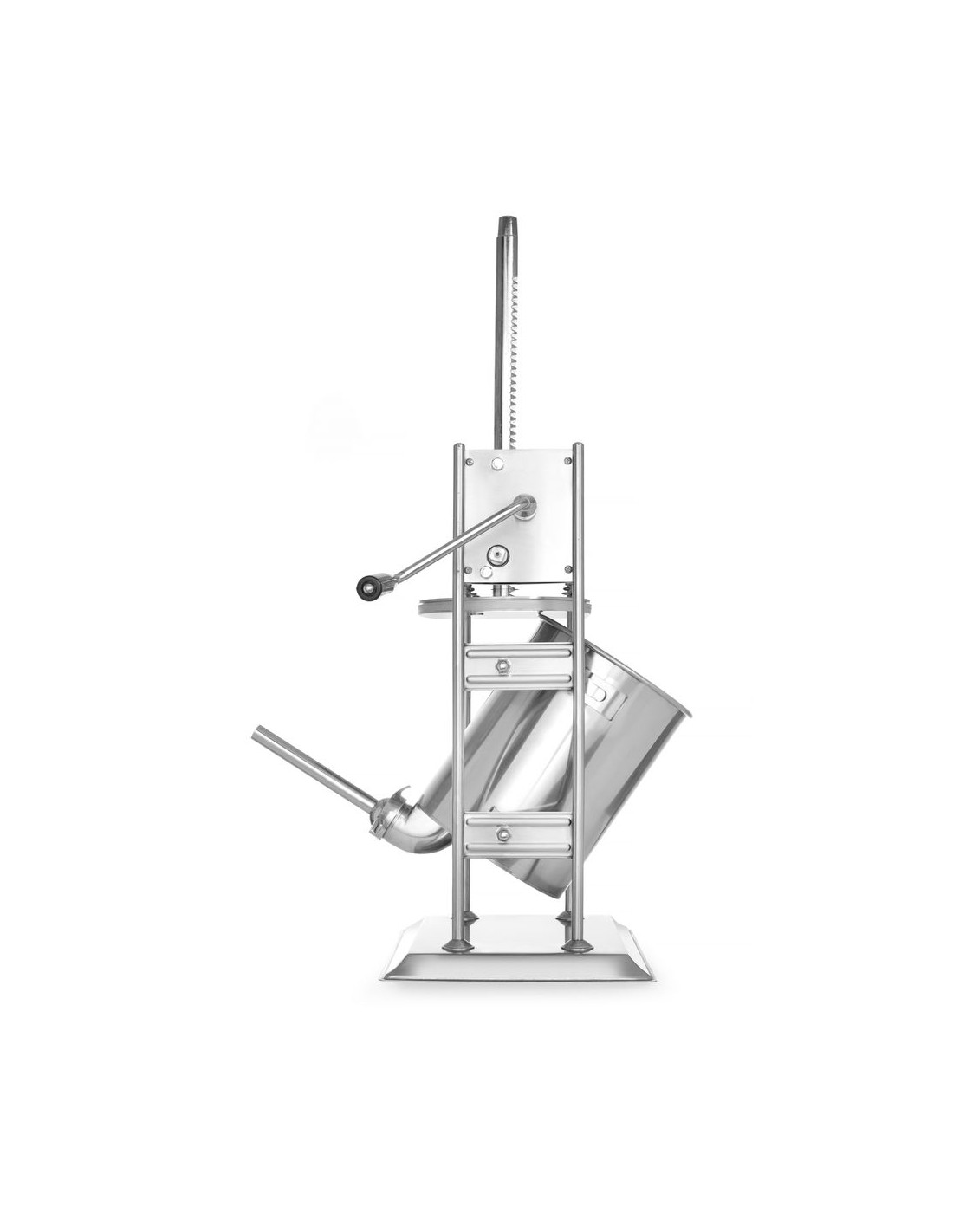 Tillverkad av rostfritt stål. Utrustad med ett tvåväxlat påfyllningssystem: – snabbväxel för att lyfta kolven – långsam växel (låg belastning) för att fylla skinnen med fyllning. Delar som kommer i kontakt med livsmedel är avtagbara för enkel påfyllning och rengöring. Levereras med en uppsättning av 4 trattar i rostfritt stål, diameter: Ø16, Ø22, Ø32 och Ø38 mm, 180 mm långa. Utrustad med lager och kugghjul av härdat stål, trycktåligt.