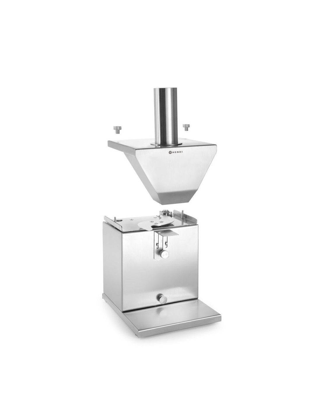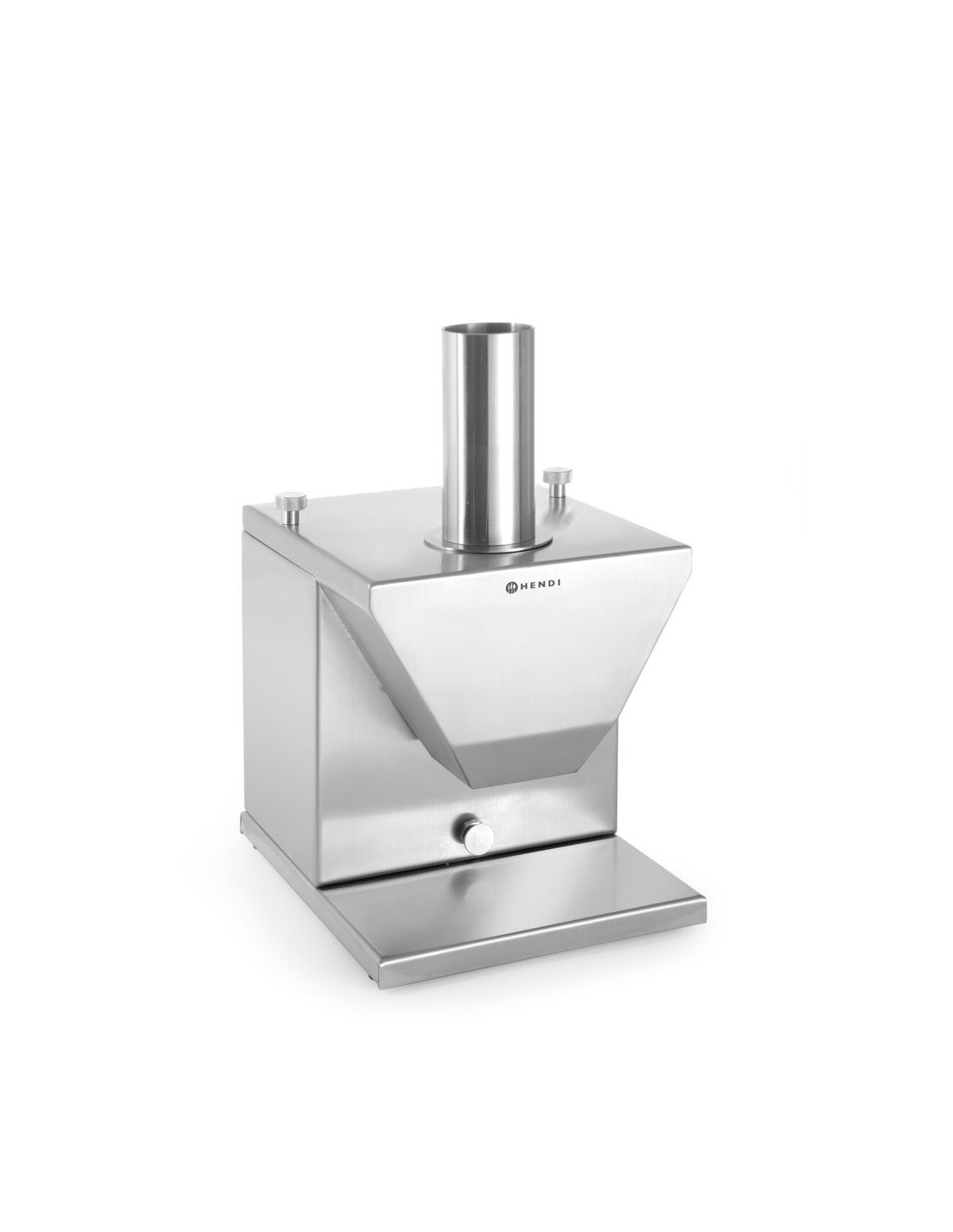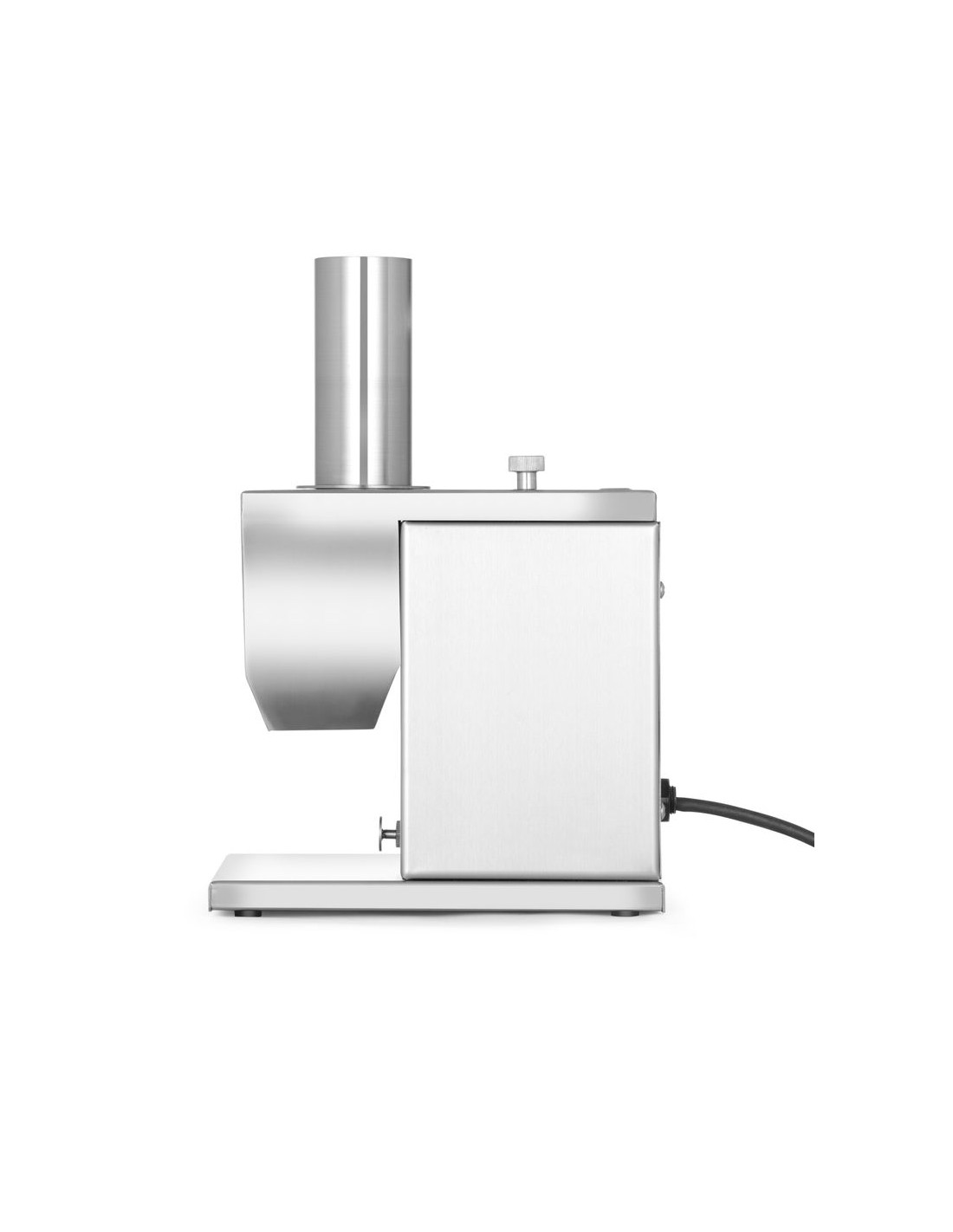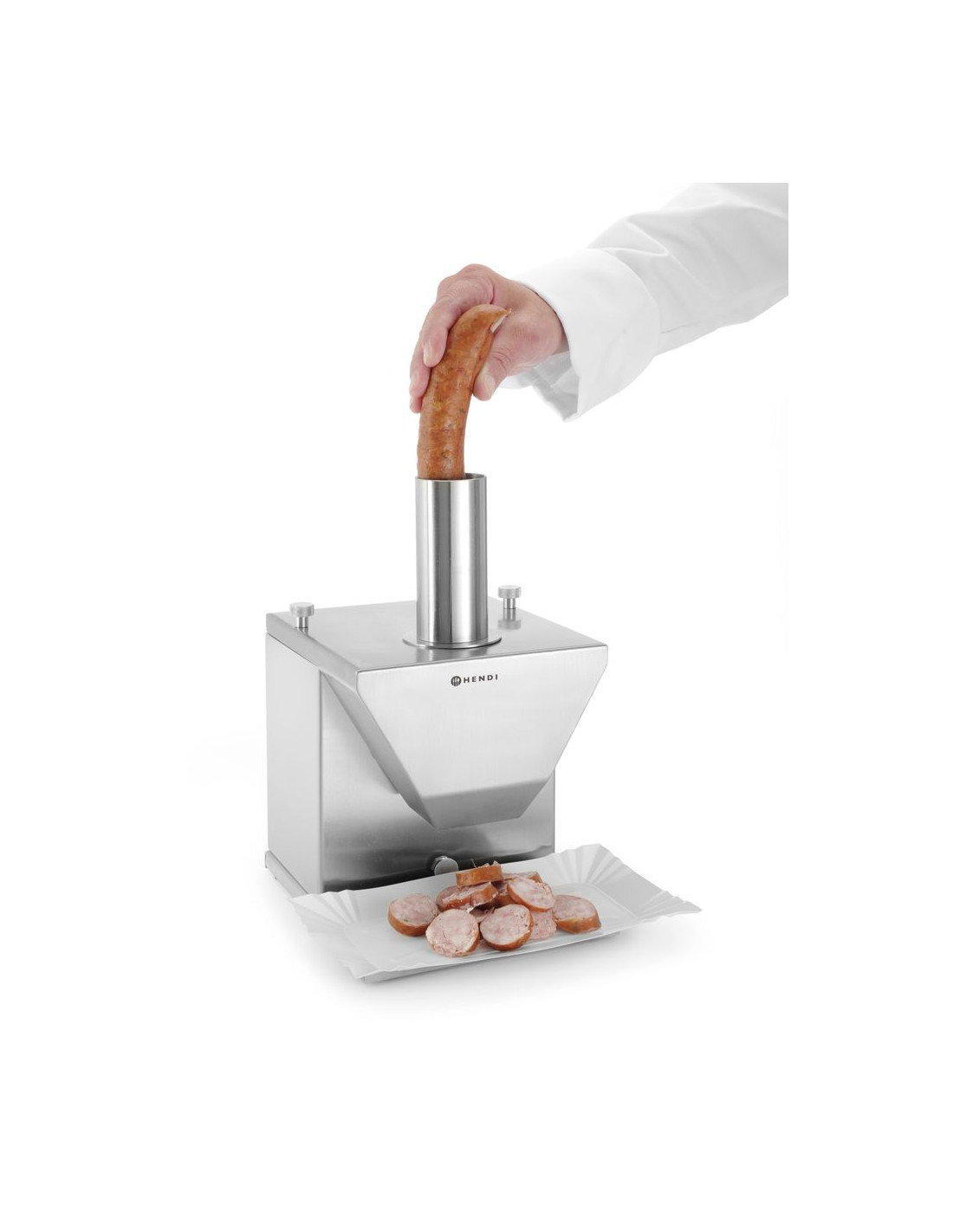 Elektrisk korvskärare med dubbelbladskniv och justerbar tjocklek. Extra lång inmatningstunnel för många typer av korvar. Maximal diameter på 48 mm.