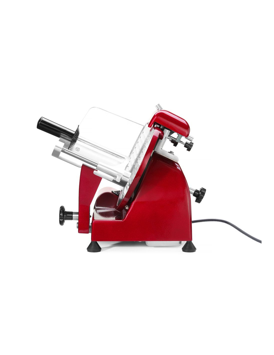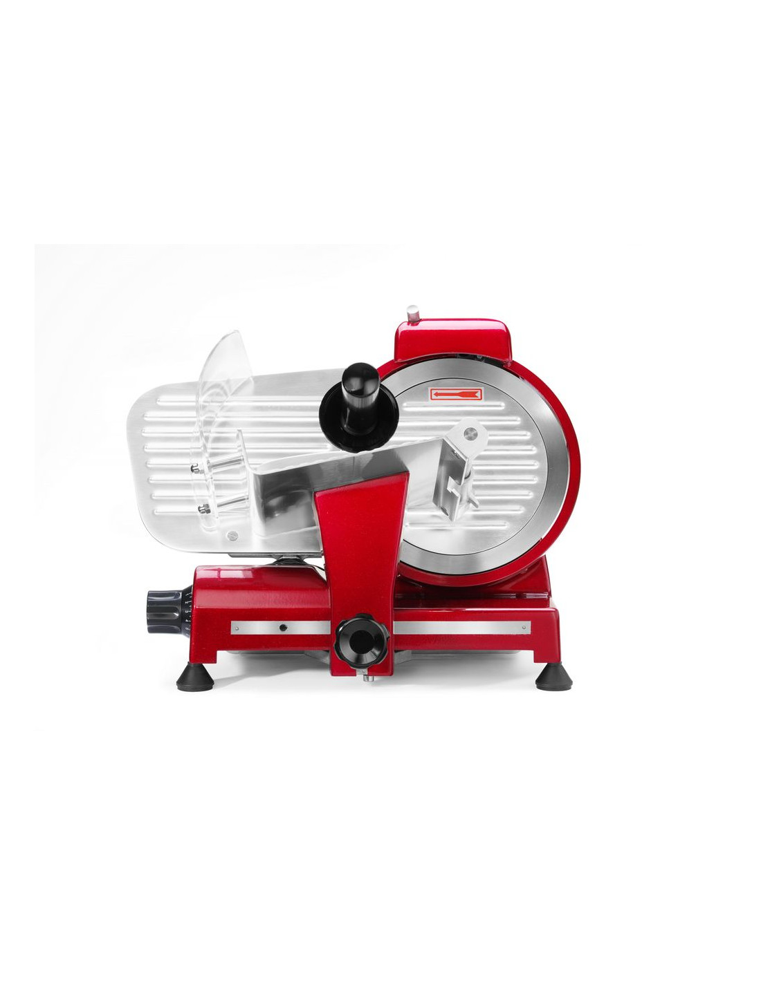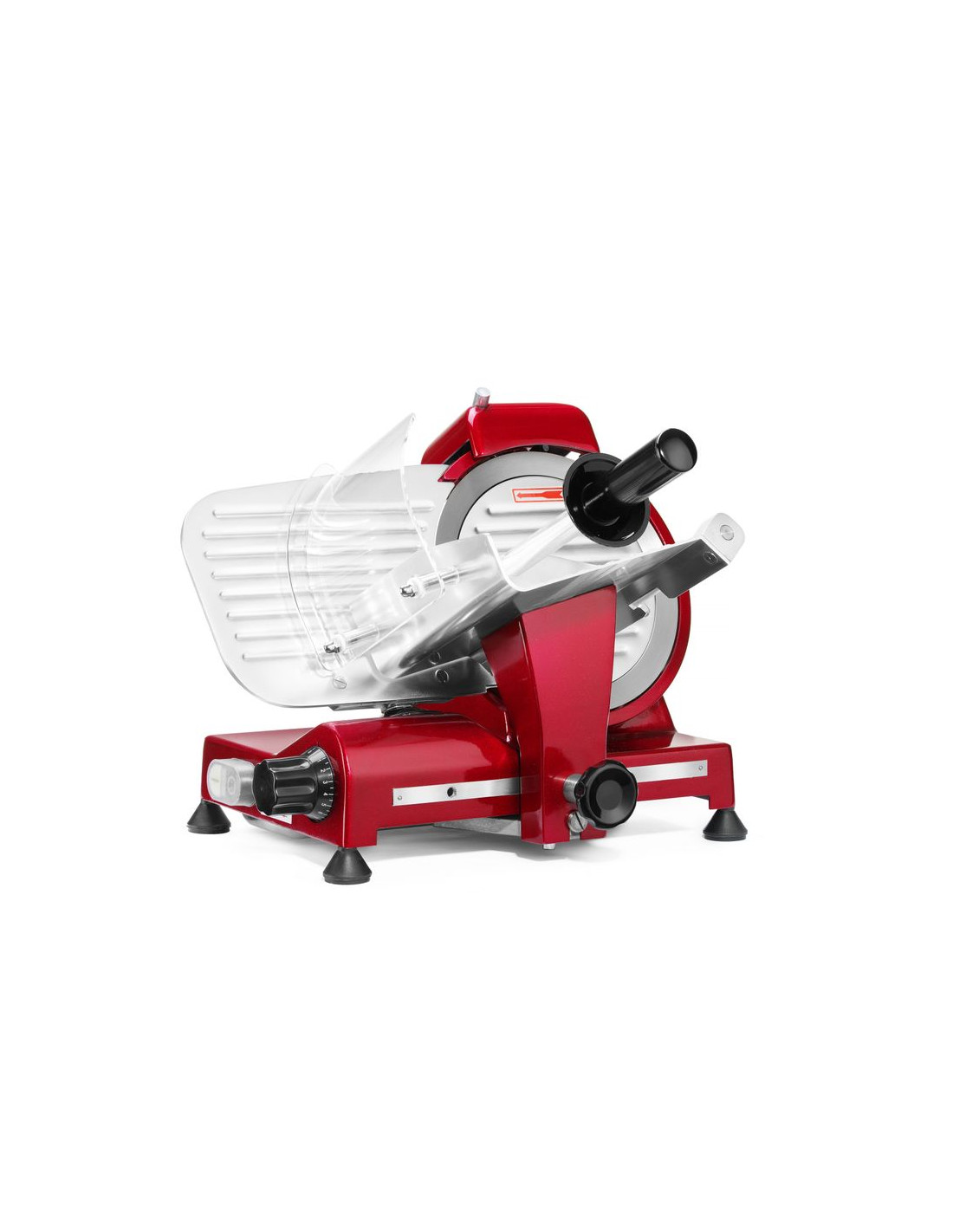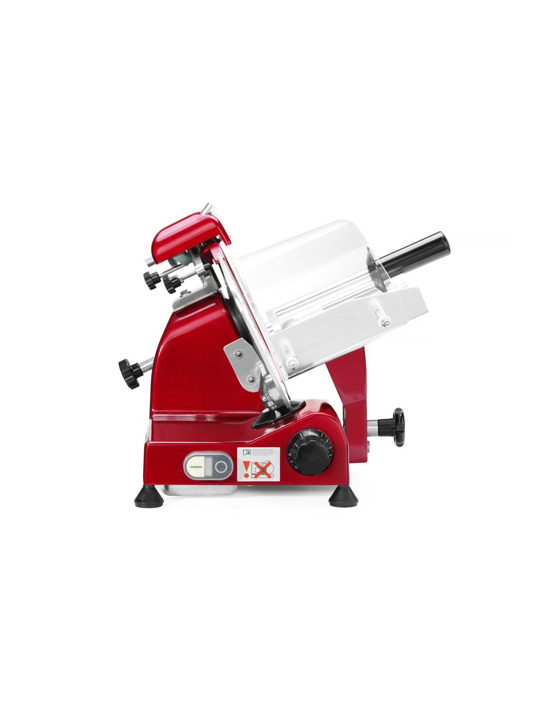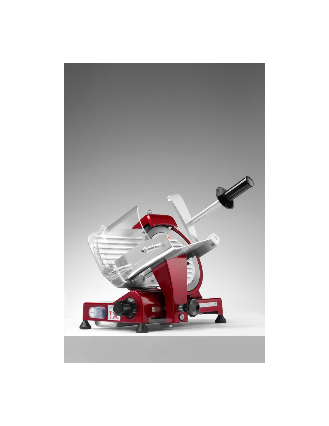 Hölje av belagd aluminium. Härdat rostfritt stålblad, vinklat. Luftkyld motor med överhettningsskydd. Kraftfull motor för att skära tufft kött. Utrustad med bladskydd och inbyggd slipmaskin. Vagn med säkerhetsskydd, klämelement och vertikal låsanordning. Snabb och enkel demontering för enkel rengöring. Uppfyller alla säkerhetskrav för utrustning för professionellt bruk, dvs: – genom att ställa in vredet på "0" skärtjocklek håller bladet sig bakom skyddet. – skydd mot oönskad start om slipmaskinen eller bladskyddet tas bort. – möjlighet att låsa och ta bort vagnen endast med bladet inställt i "0" skärtjockleksläge. Ej lämplig för att skära ost. Ostskivning möjlig med en separat tillgänglig non-stick kniv.