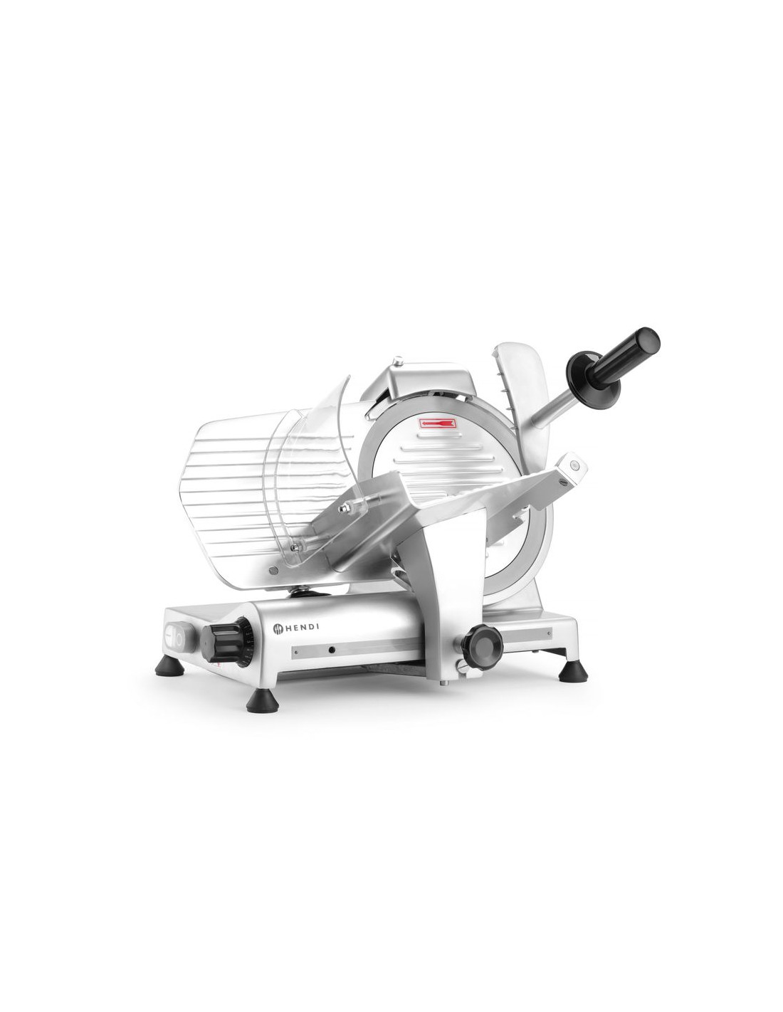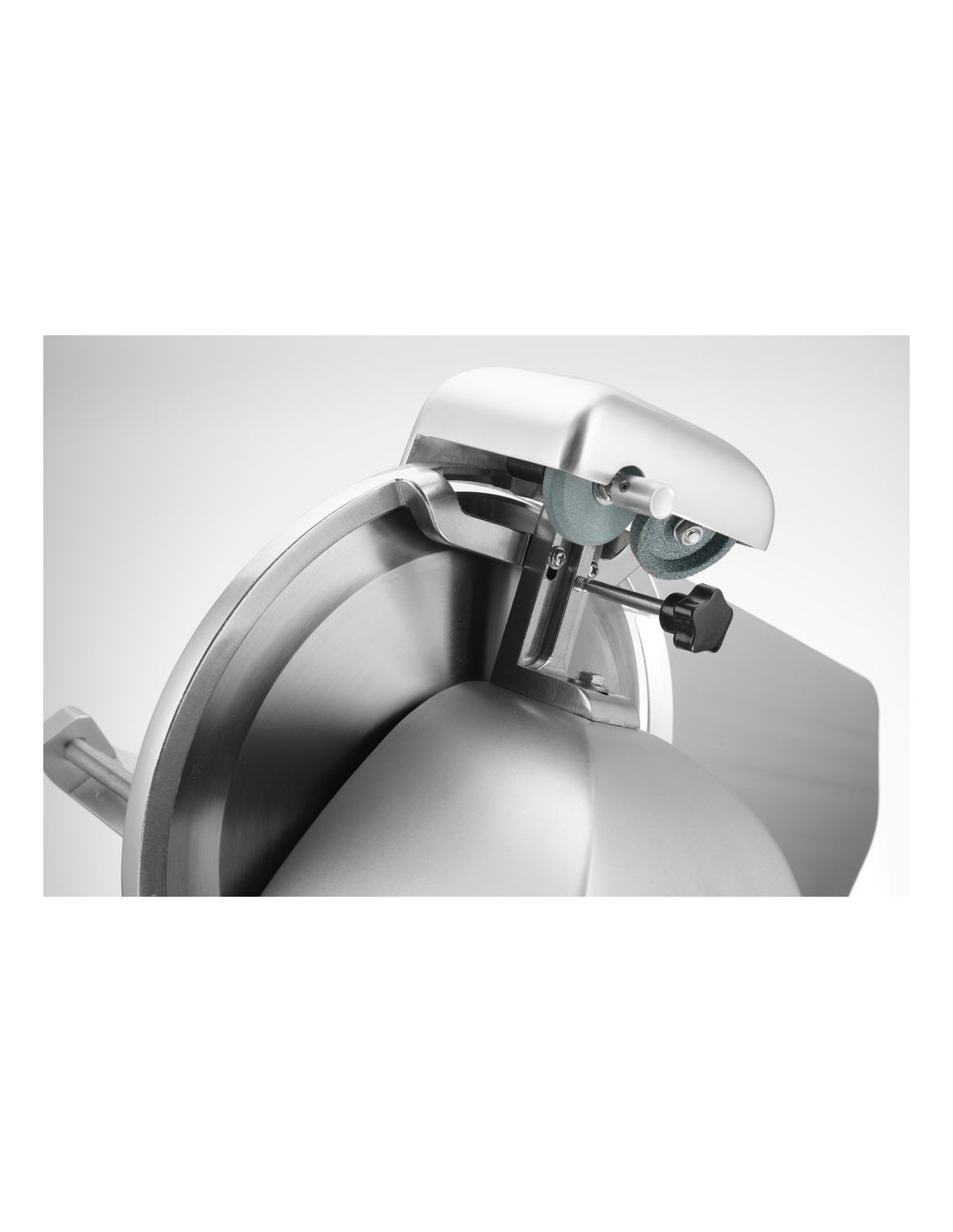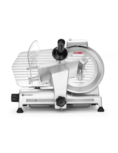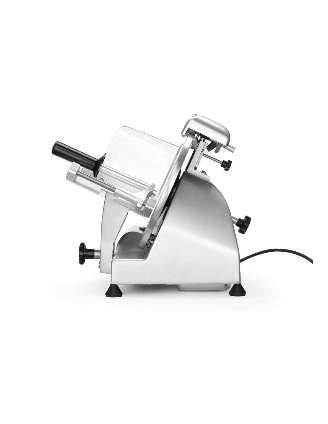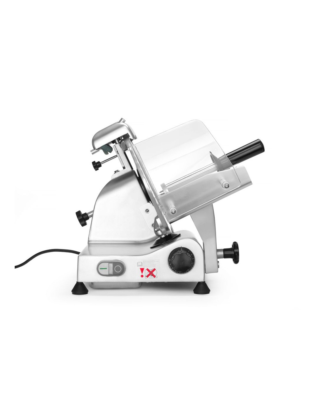 Hölje av belagd aluminium. Härdat rostfritt stålblad, vinklat. Luftkyld motor med överhettningsskydd. Kraftfull motor för att skära tufft kött. Utrustad med bladskydd och inbyggd slipmaskin. Vagn med säkerhetsskydd, klämelement och vertikal låsanordning. Snabb och enkel demontering för enkel rengöring. Uppfyller alla säkerhetskrav för utrustning för professionellt bruk, dvs: – genom att ställa in vredet på "0" skärtjocklek håller bladet sig bakom skyddet. – skydd mot oönskad start om slipmaskinen eller bladskyddet tas bort. – möjlighet att låsa och ta bort vagnen endast med bladet inställt i "0" skärtjockleksläge. Ej lämplig för att skära ost. Ostskivning möjlig med en separat tillgänglig non-stick kniv.